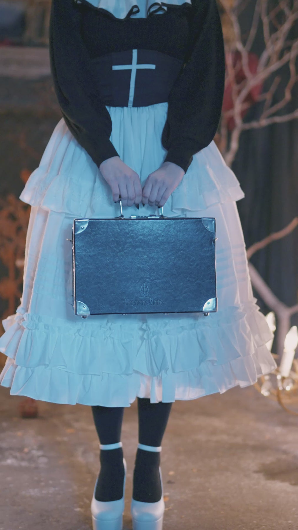 The Moi-même-Moitié trunk case features luxuriously candelabra embroidery with the brand logo and blue lining.