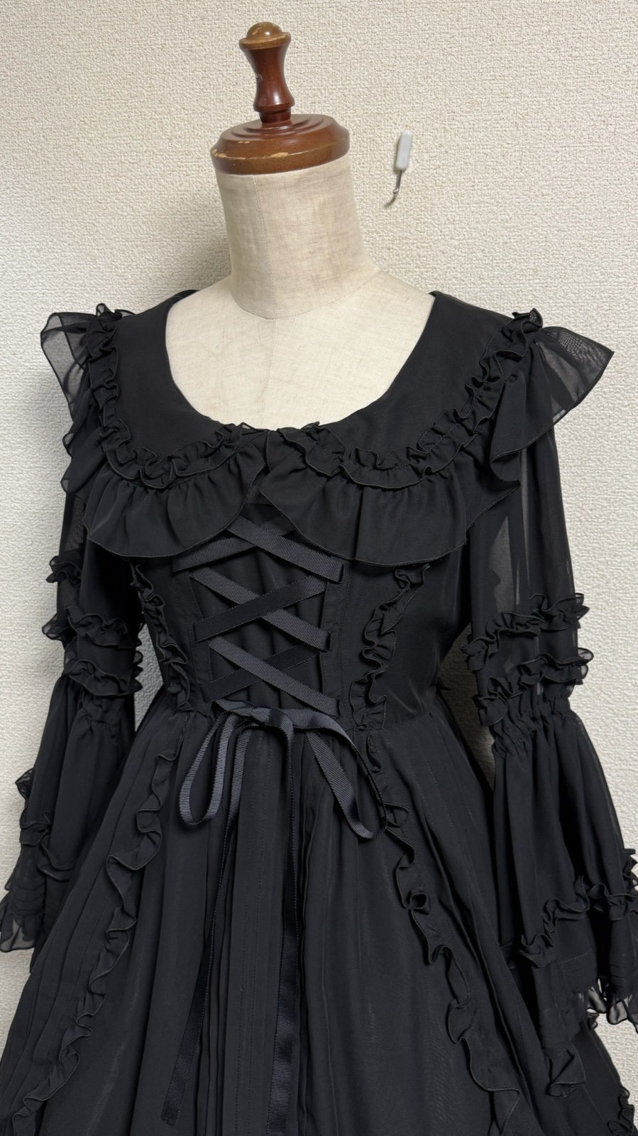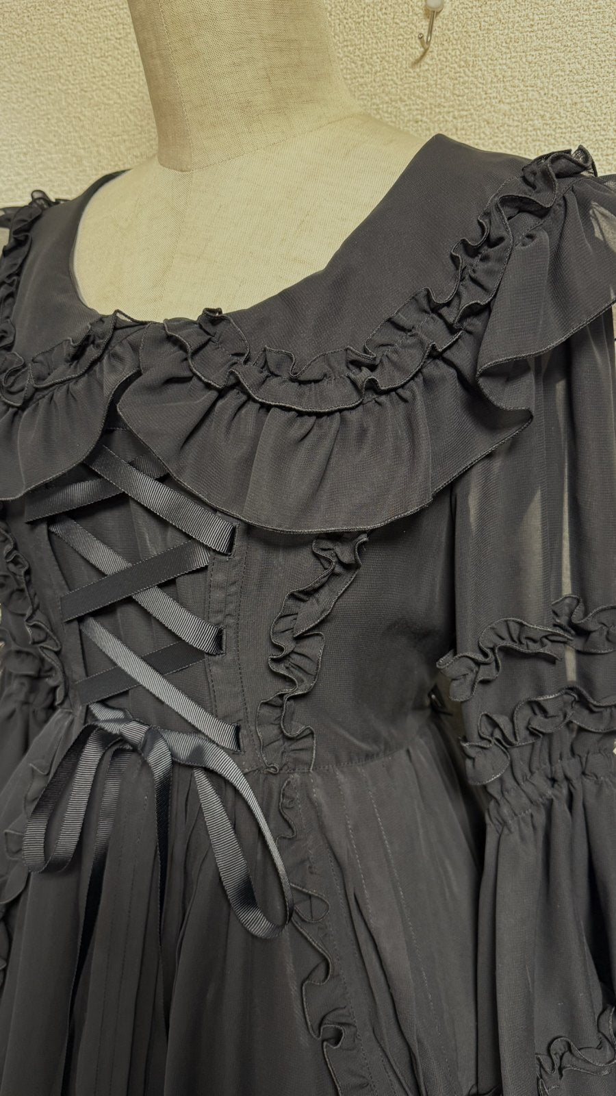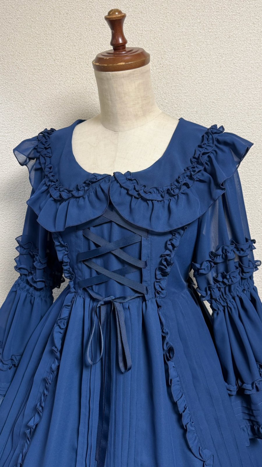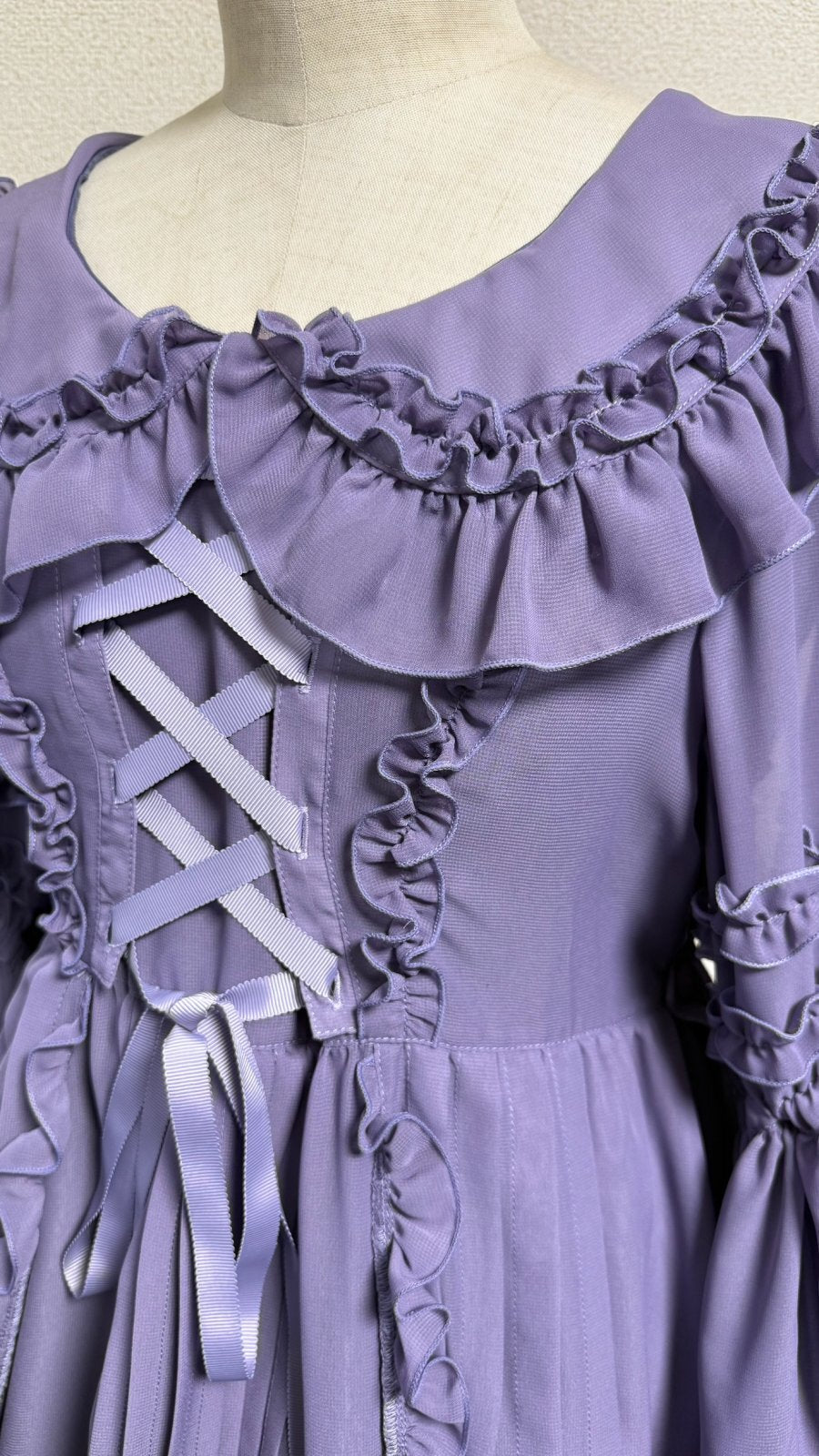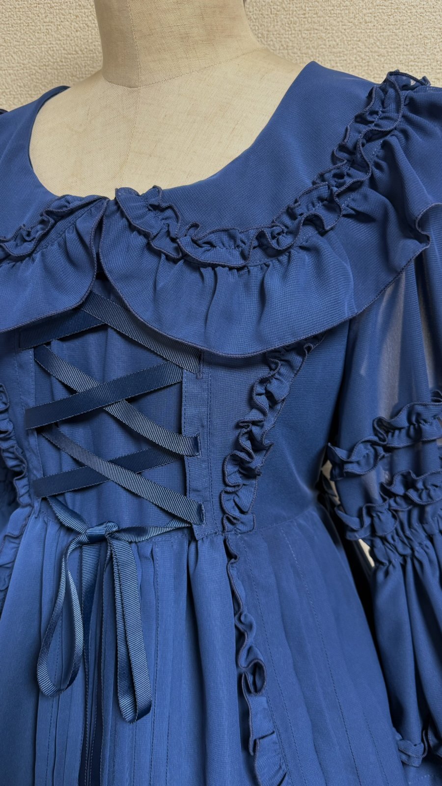 ピンタックや共布フリル、デコルテラインに添った編上げ。