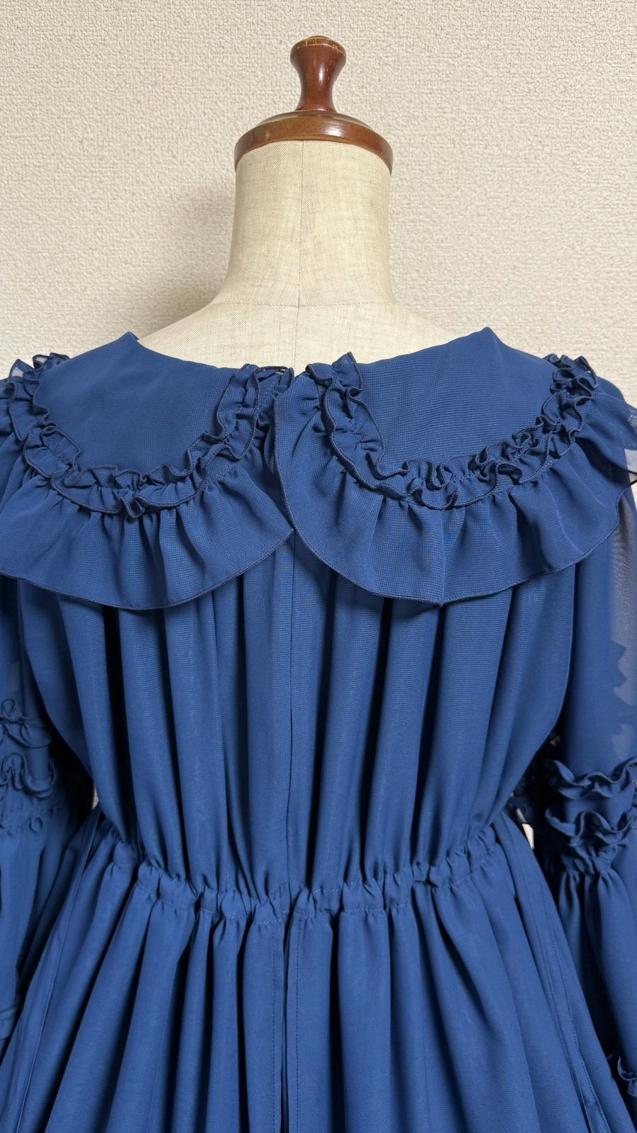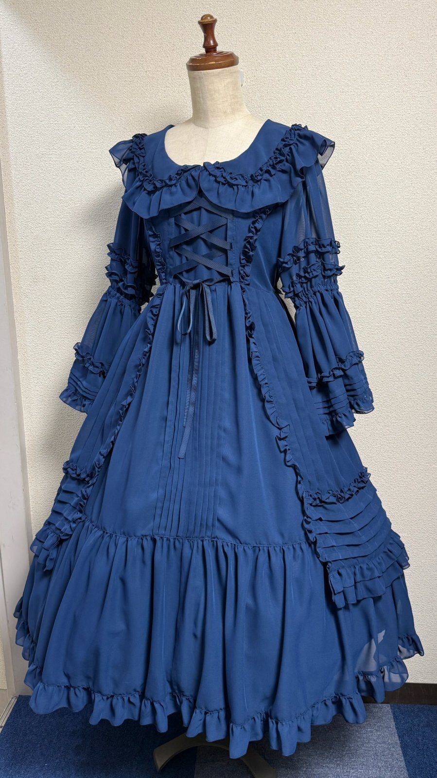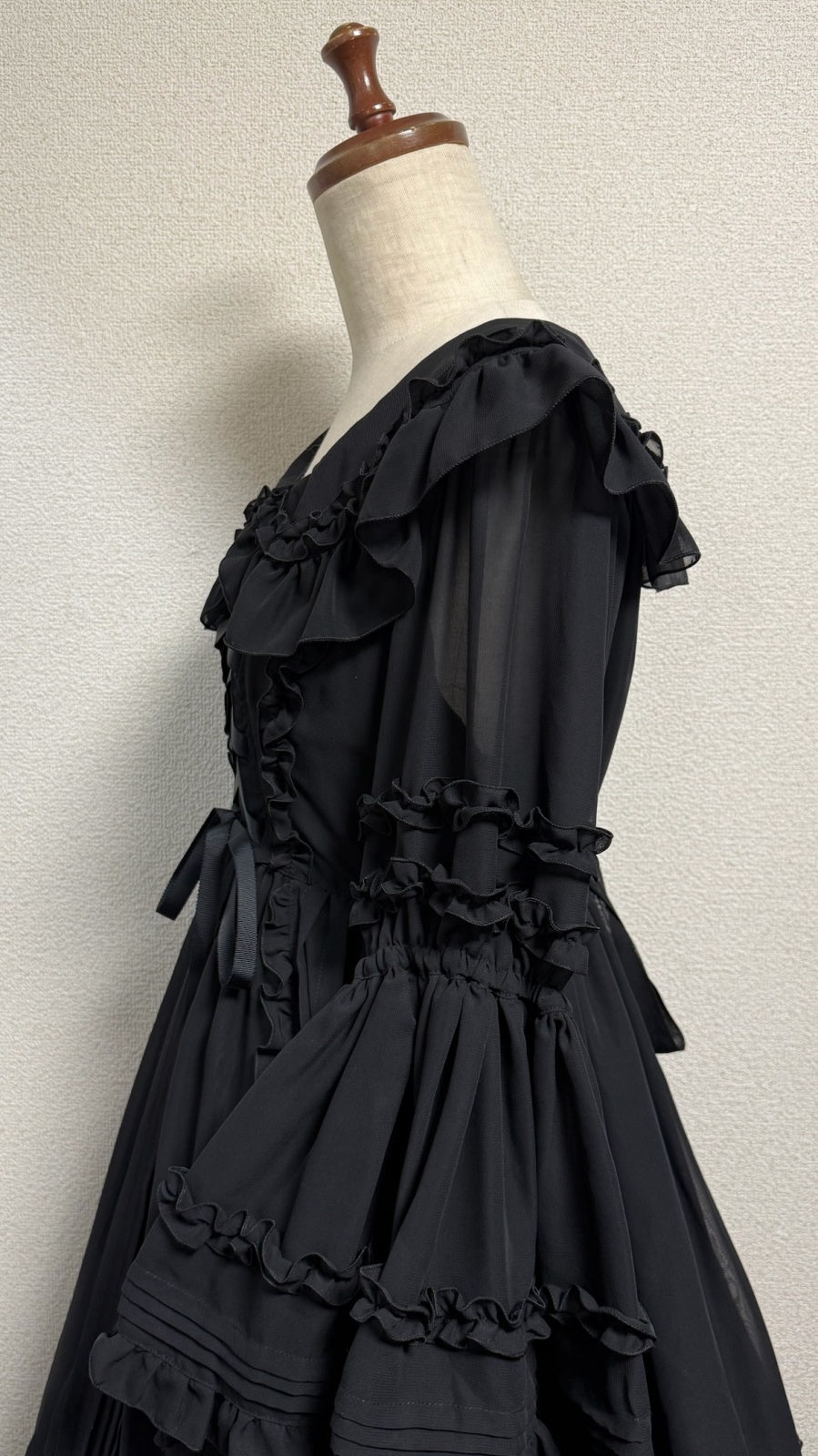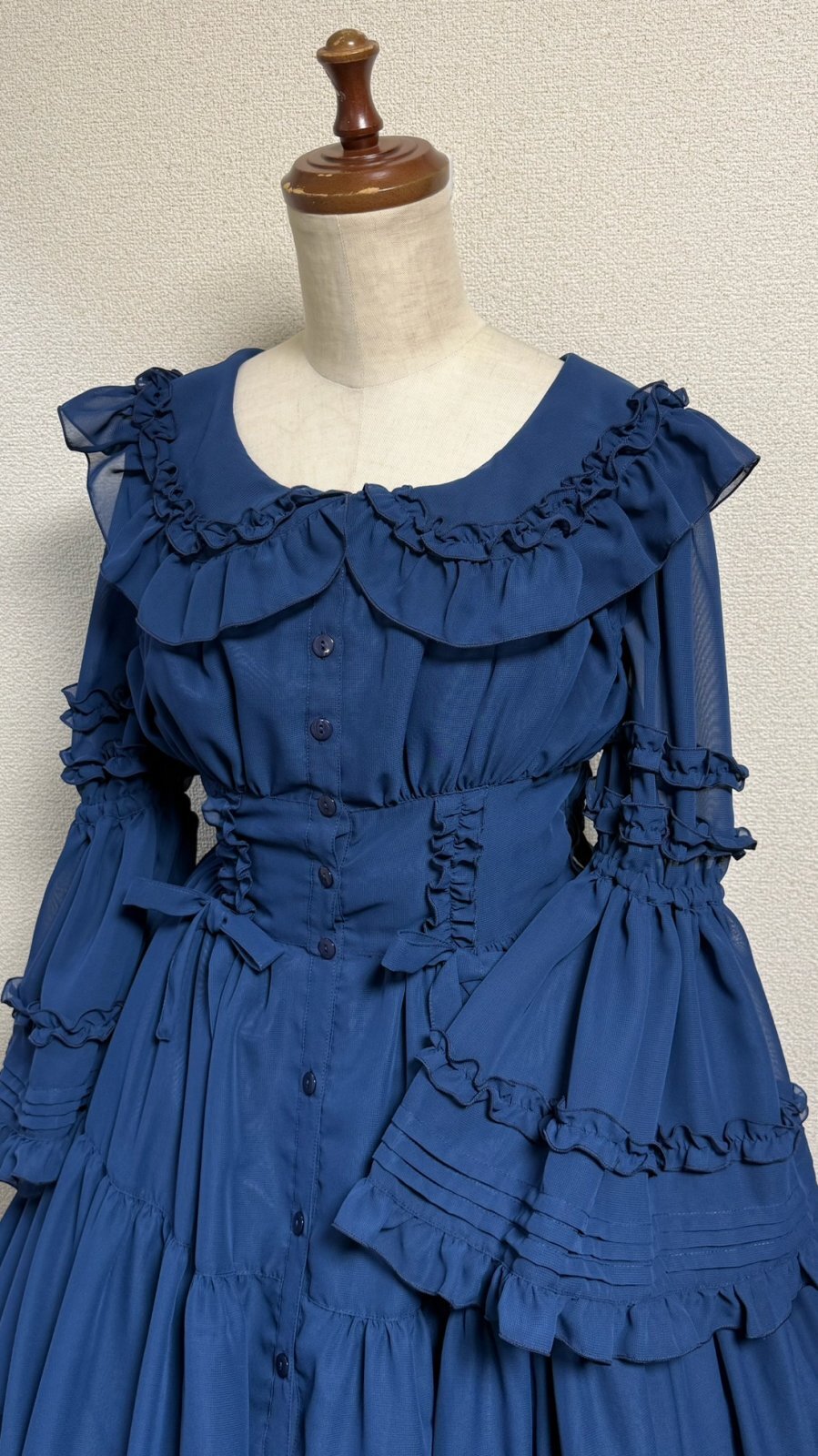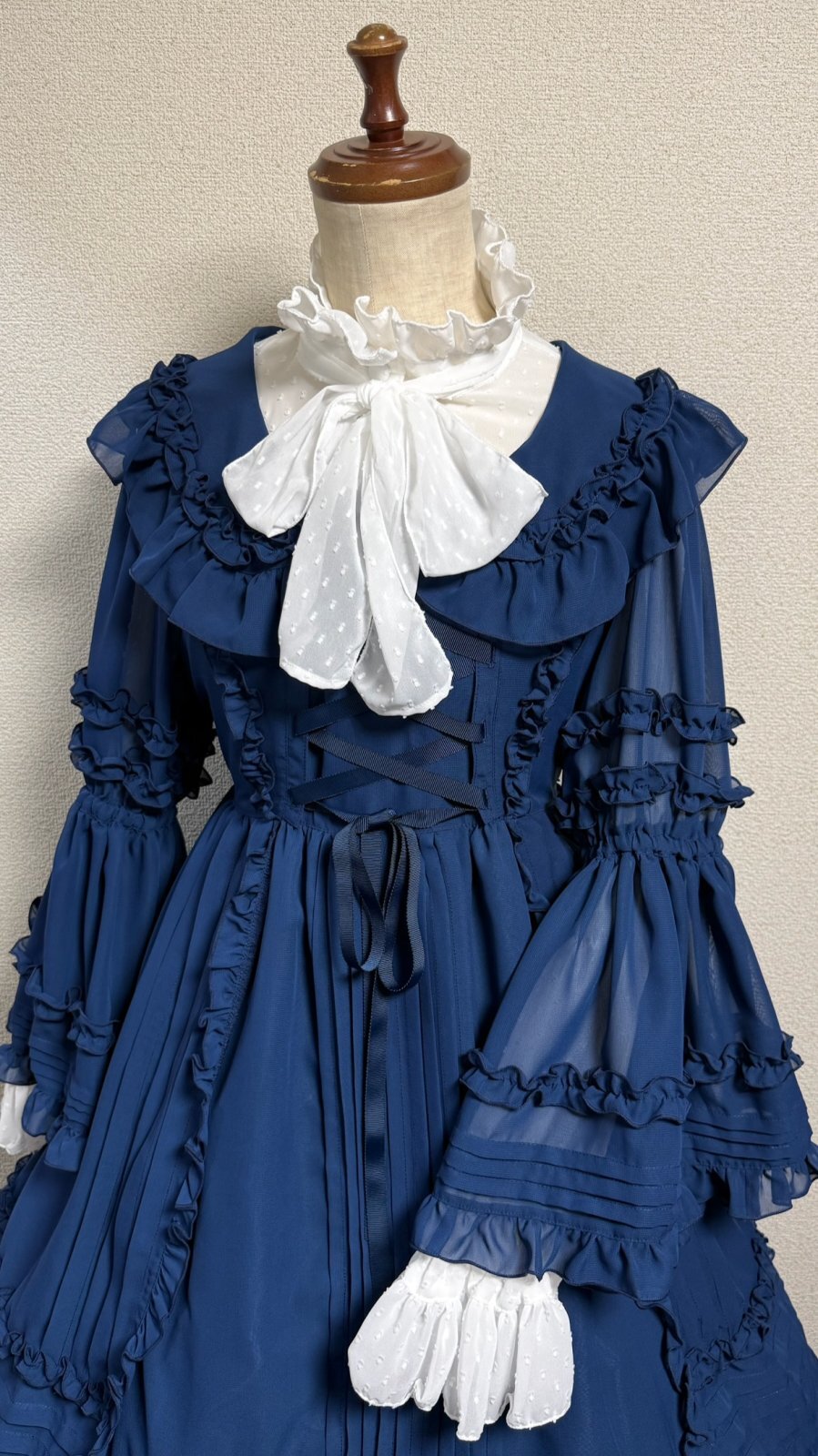 ピンタックや共布フリル、デコルテラインに添った編上げ。