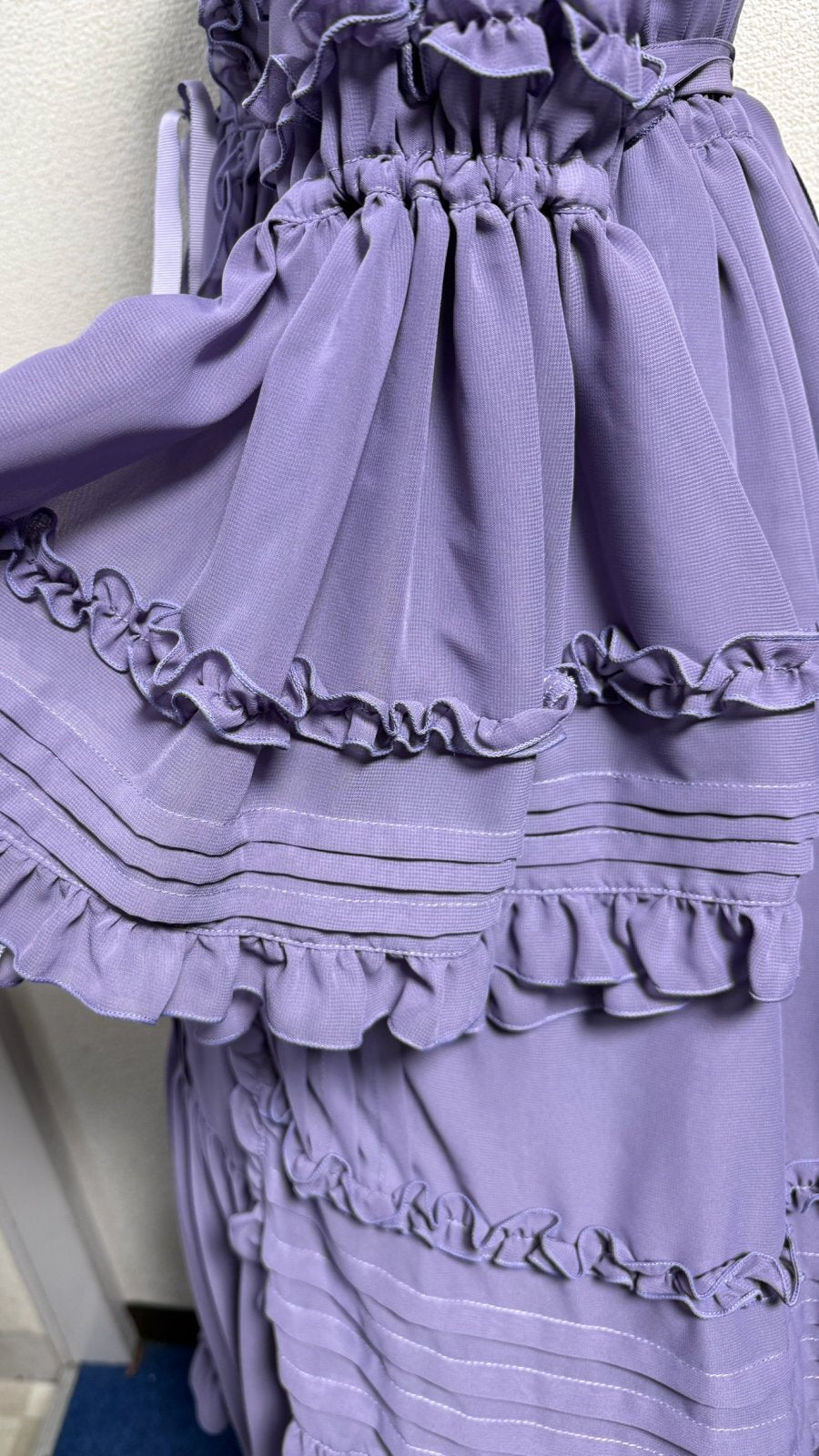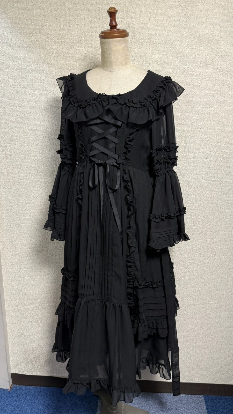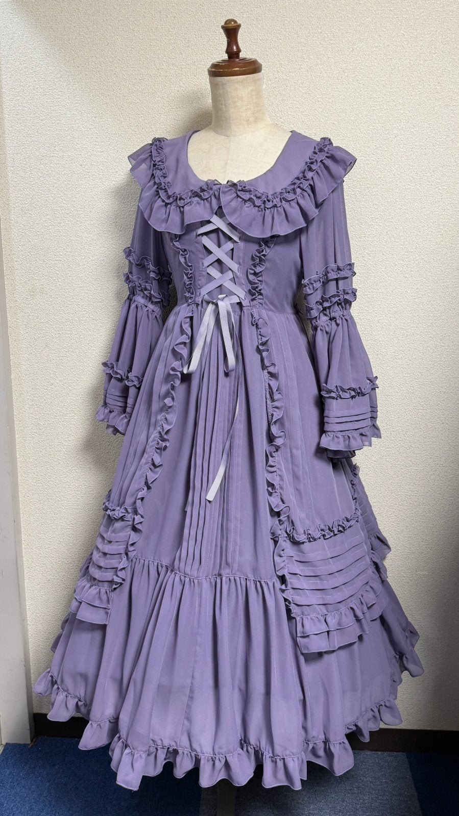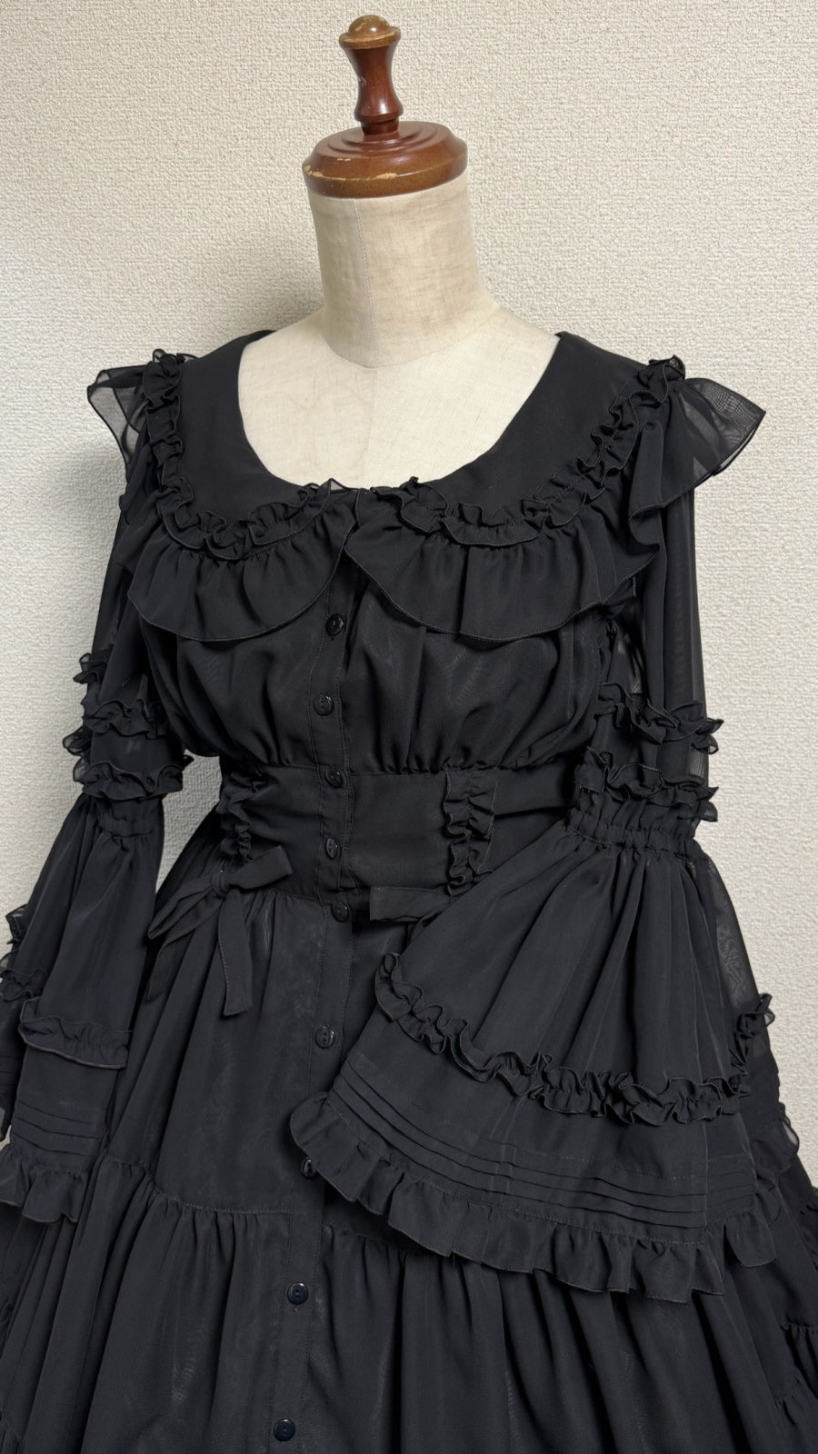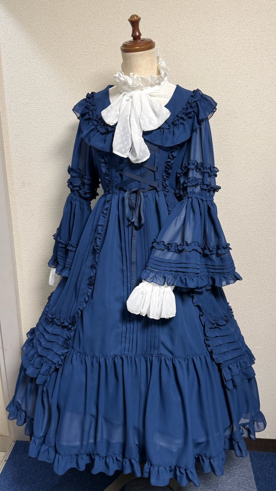 ピンタックや共布フリル、デコルテラインに添った編上げ。