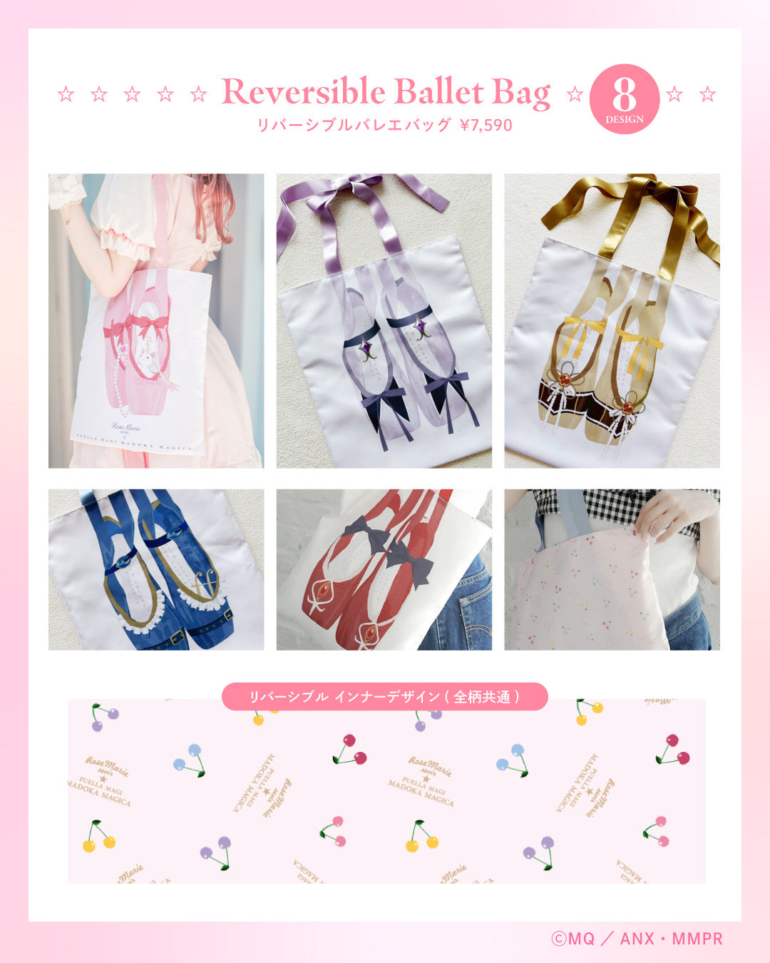 今回は、RoseMarie seoirとプレミアムバンダイの限定の柄もご用しており、全てのバッグの裏地はキャラクターイメージのお色のチェリーの総柄となっており、リバーシブルでお使いいただけます。