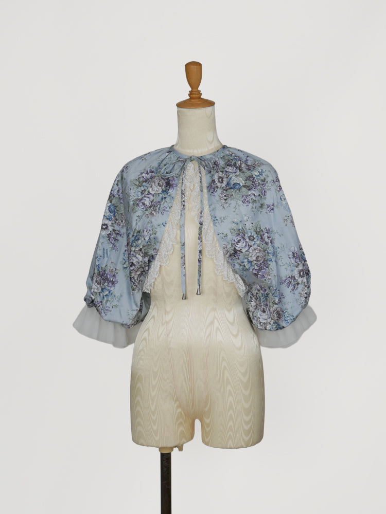 裾周りに贅沢にあしらった繊細なチュールレースと、前後に大きく開いた女性らしい丸みのあるフォルムが印象的なボレロ。