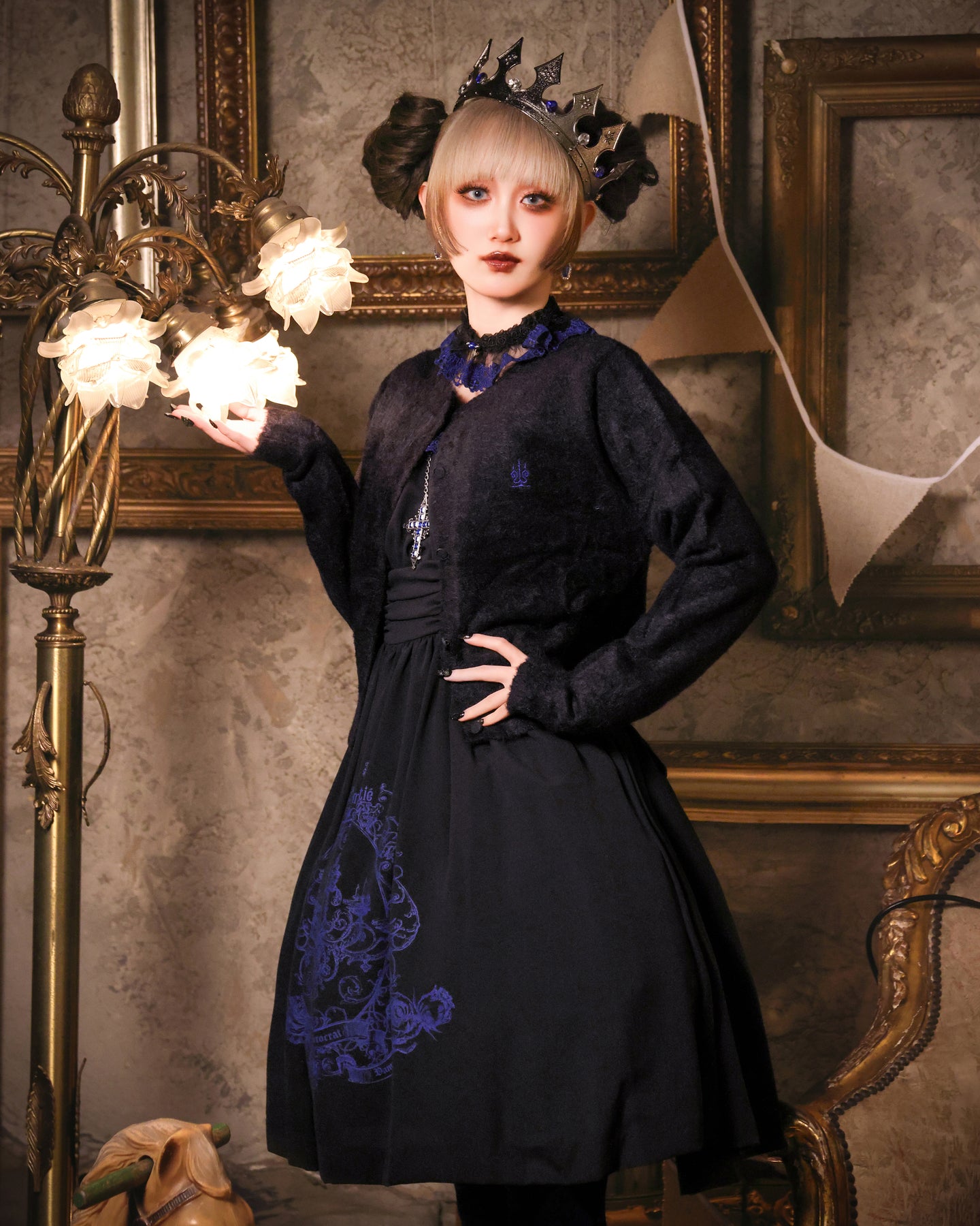 This cardigan features original buttons and a candelabra embroidery on the chest.
