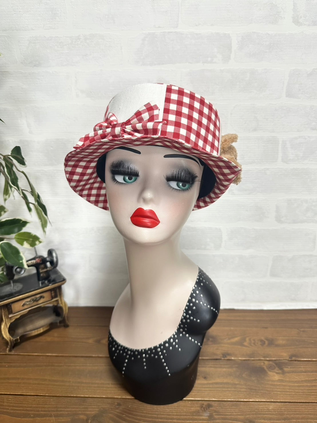 半立体のクマちゃんがぎゅっとブリムを押さえてくれる、微笑ましいデザイン。ブリムはおろしてもかぶることができます。