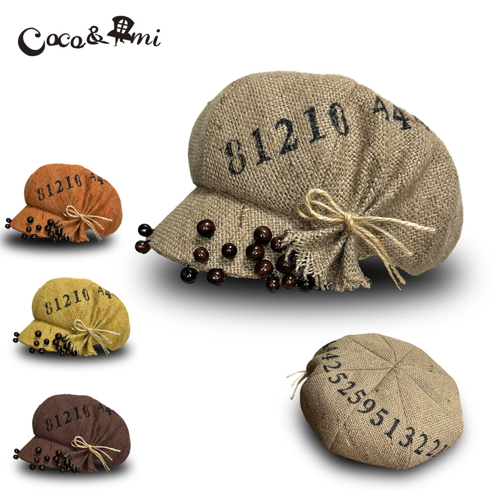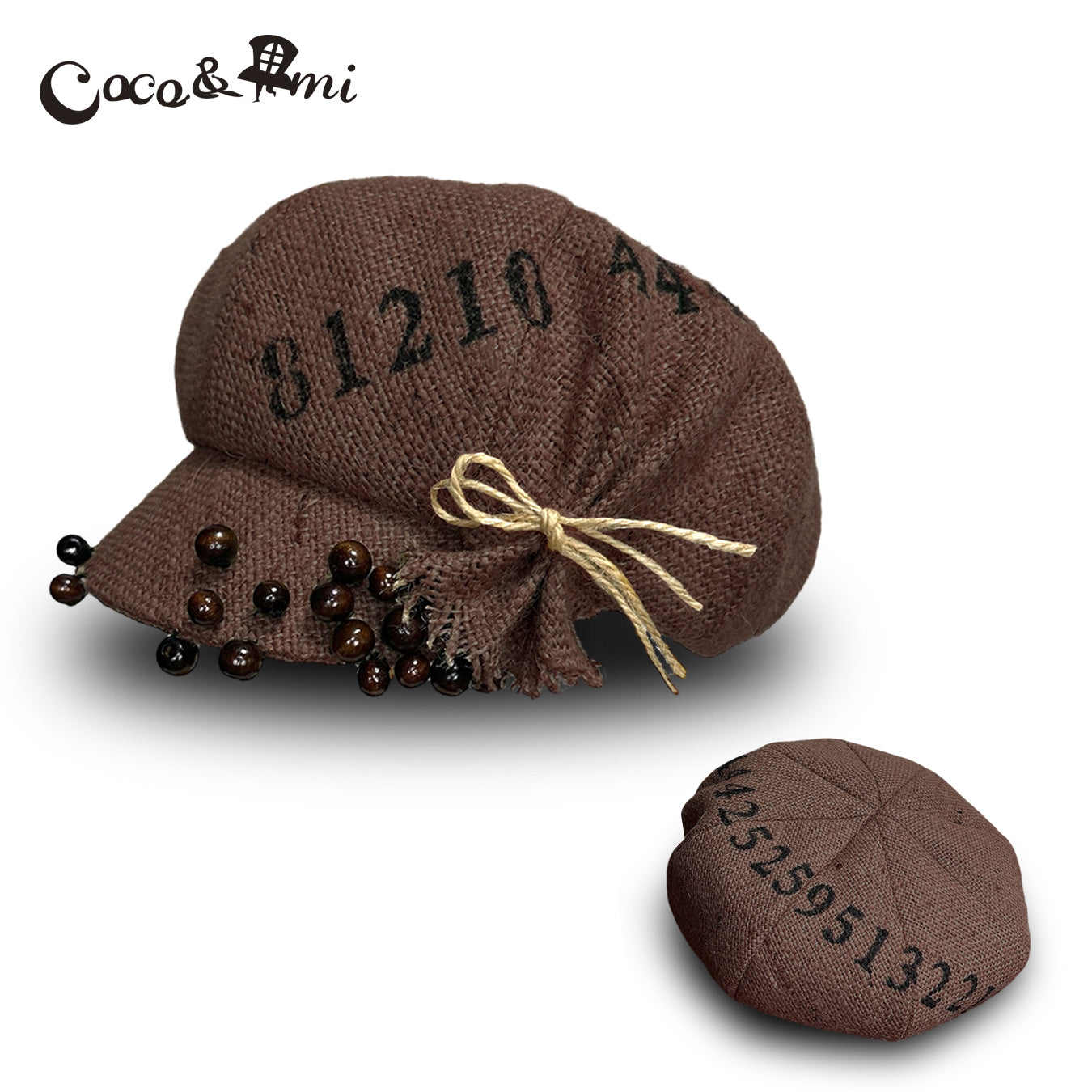 キャスケットは8枚ハギの1枚をふくらませ麻袋のように絞り、 コーヒー豆に見立てたウッドビーズをポロポロとこぼしました。 ぐるりと印字された数字にも秘密のメッセージを込めています。