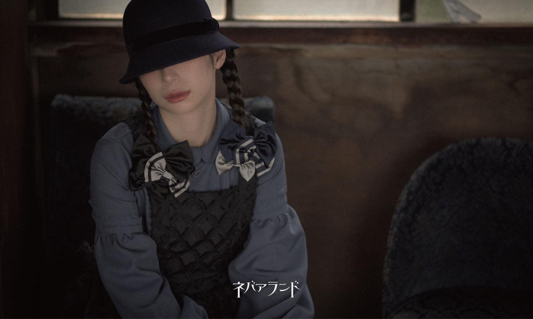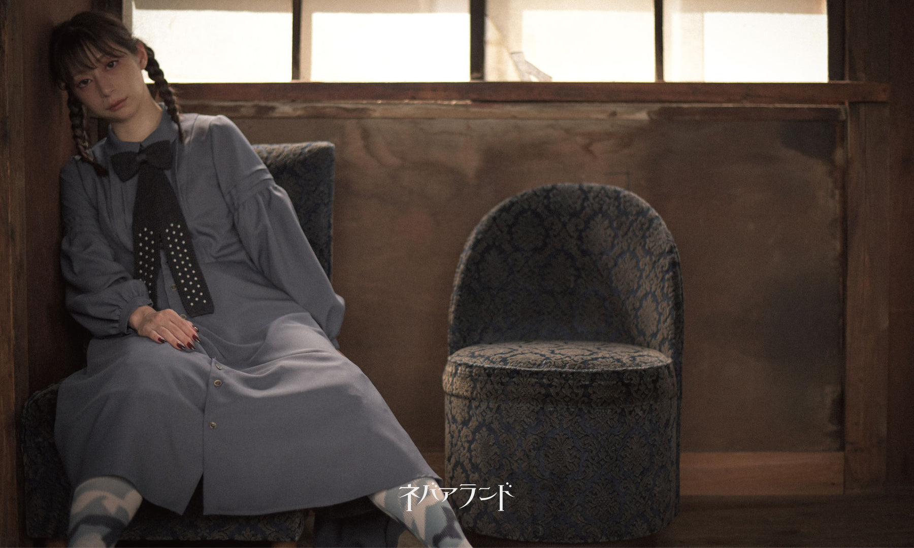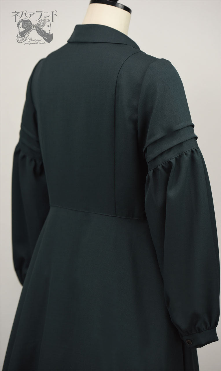 ワンピースは、丸衿、タック、肘上からのパフスリーブ、ウエストからのフレアシルエットとシンプルながら、少女心をくすぐるディテール。