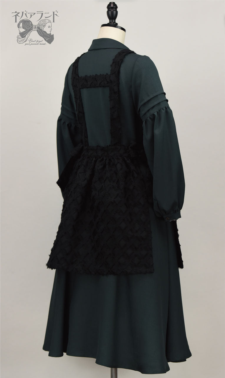 シンプルなワンピースと、カットジャカードのチェック柄が印象的なエプロンのセット。