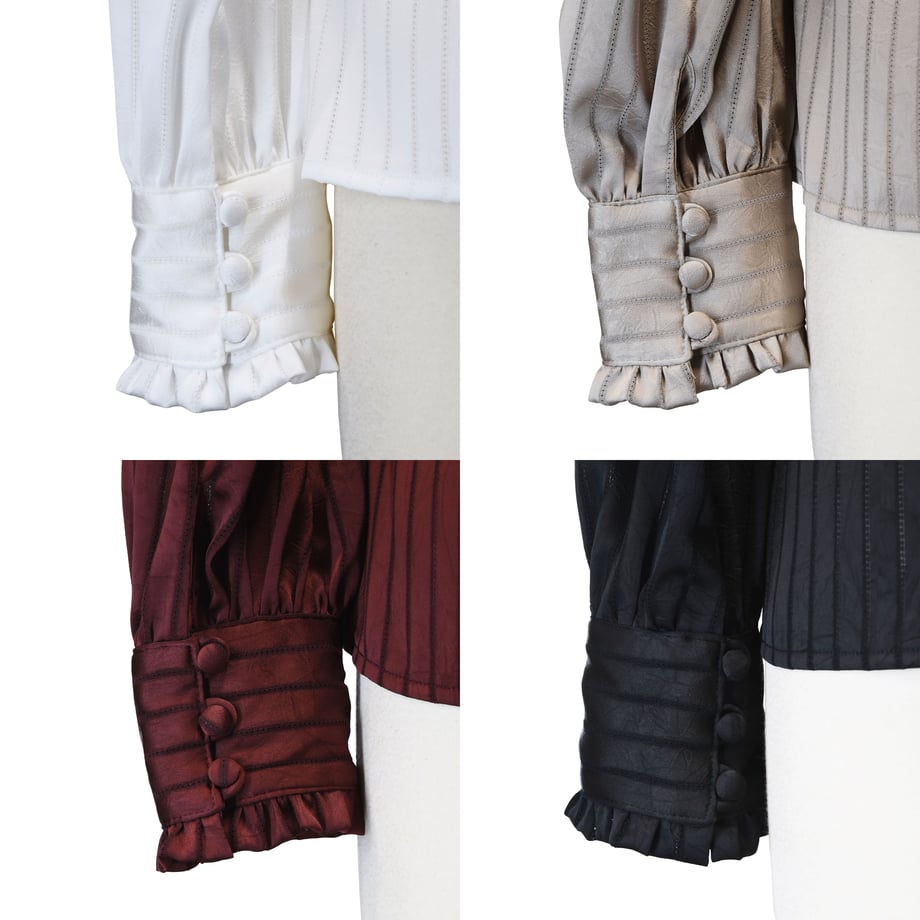 袖口にはくるみボタンをあしらったカフスとフリルを配し、クラシカルなアクセントを添えました。
