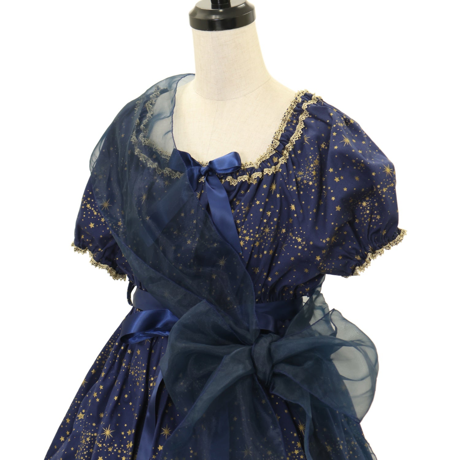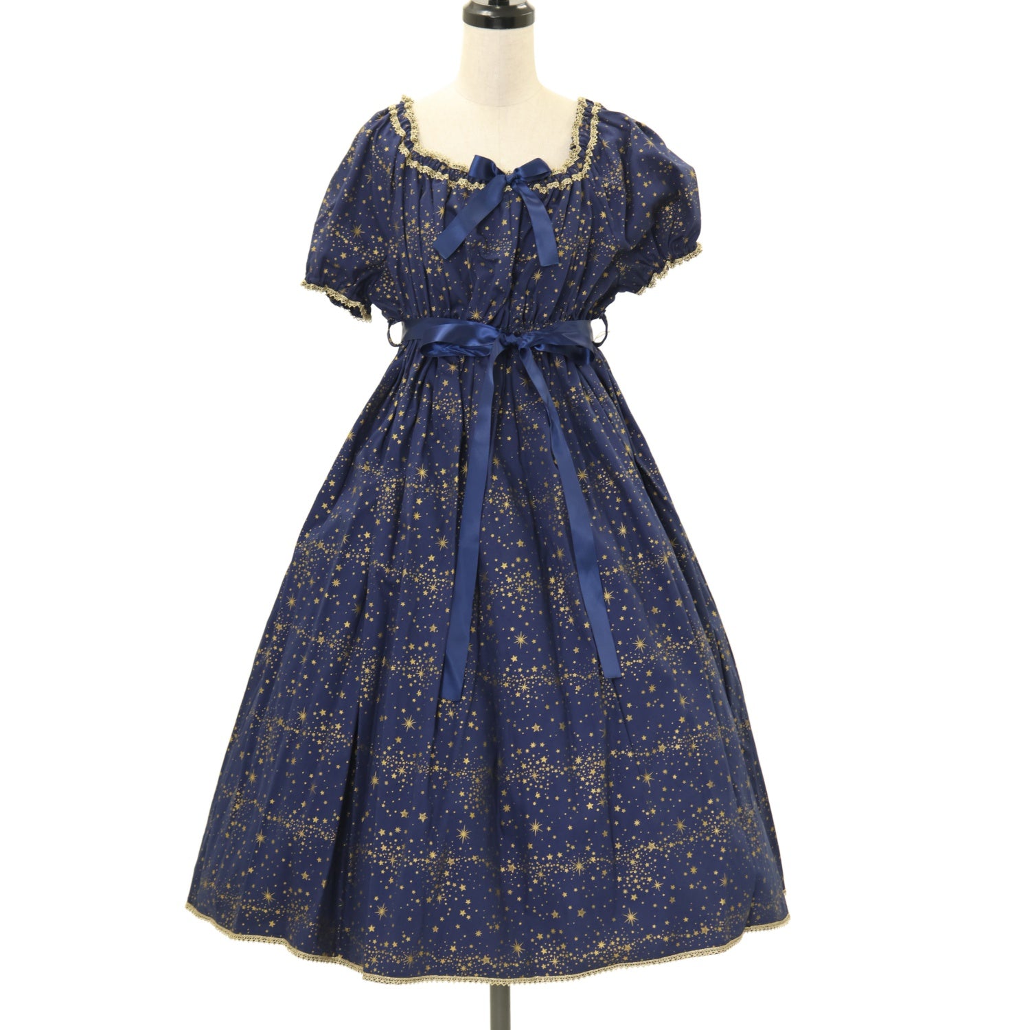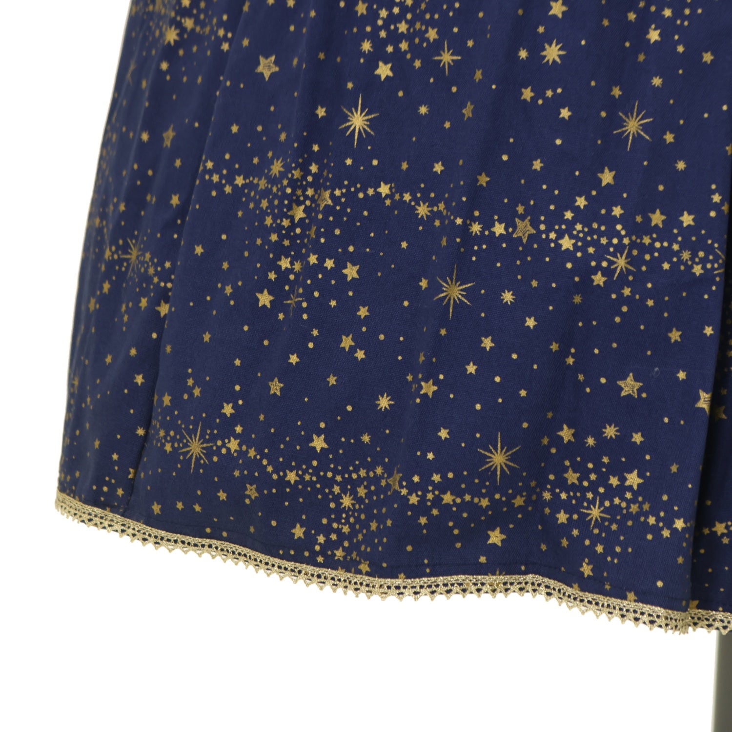 【USED】サッシュリボン付★星空★シャーリングワンピース【紺×ゴールドレース105c丈】