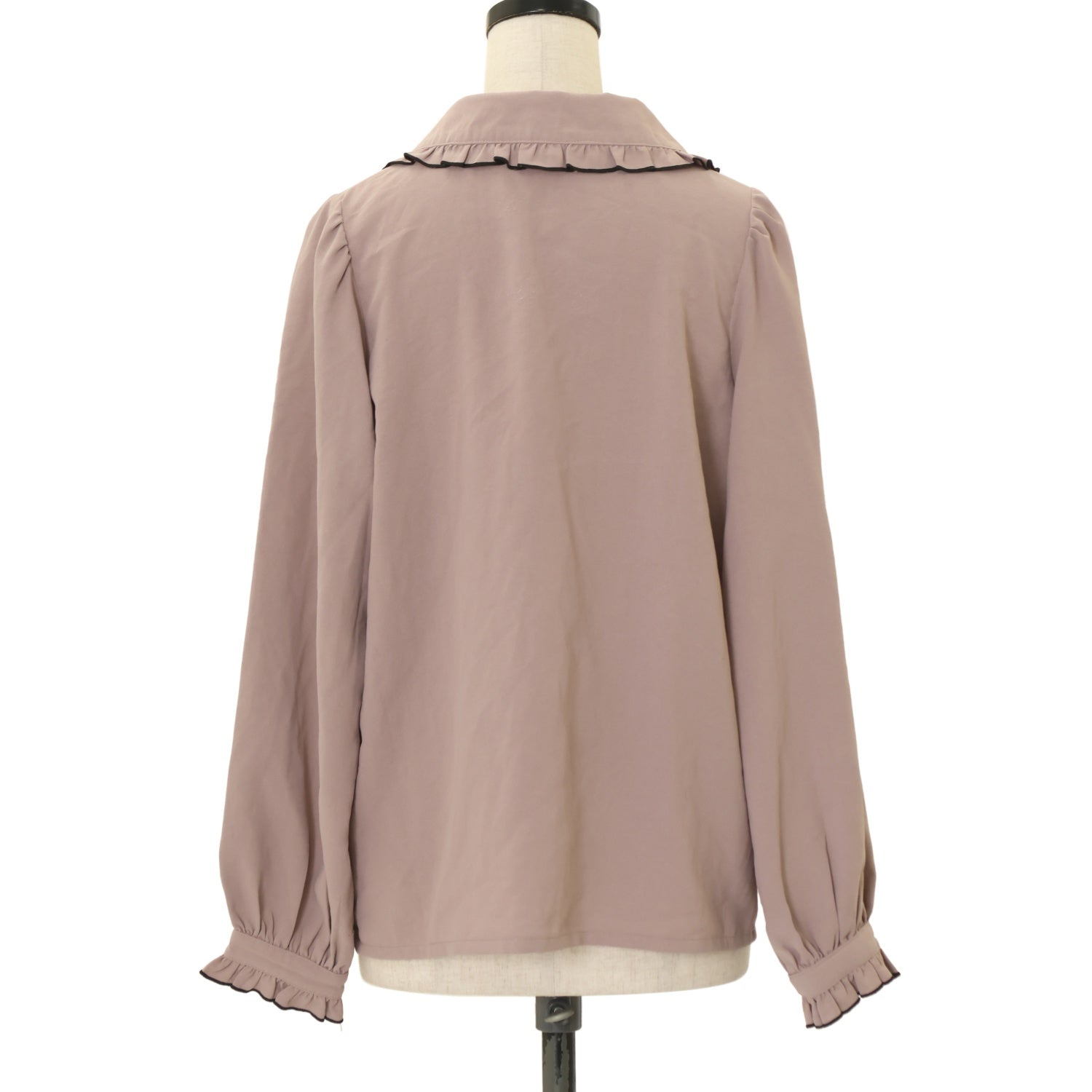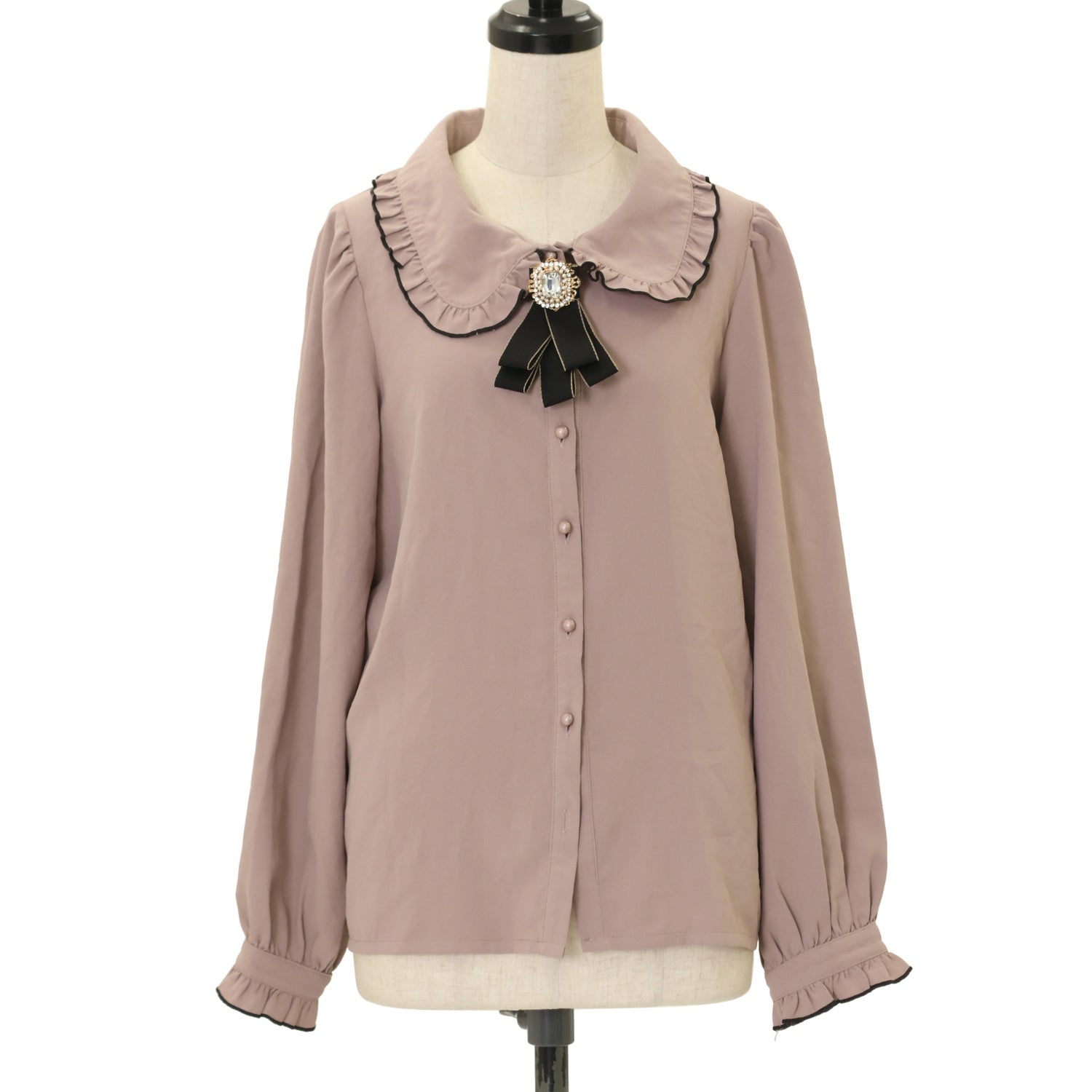 【USED】ビジューブローチ付き配色フリル長袖ブラウス