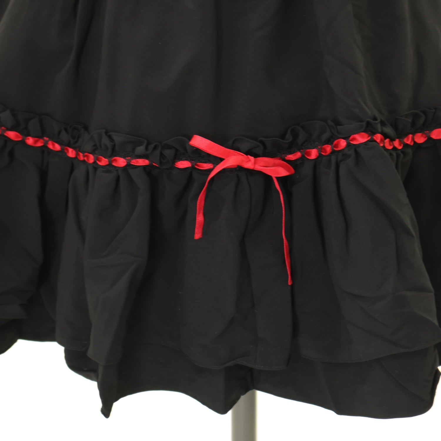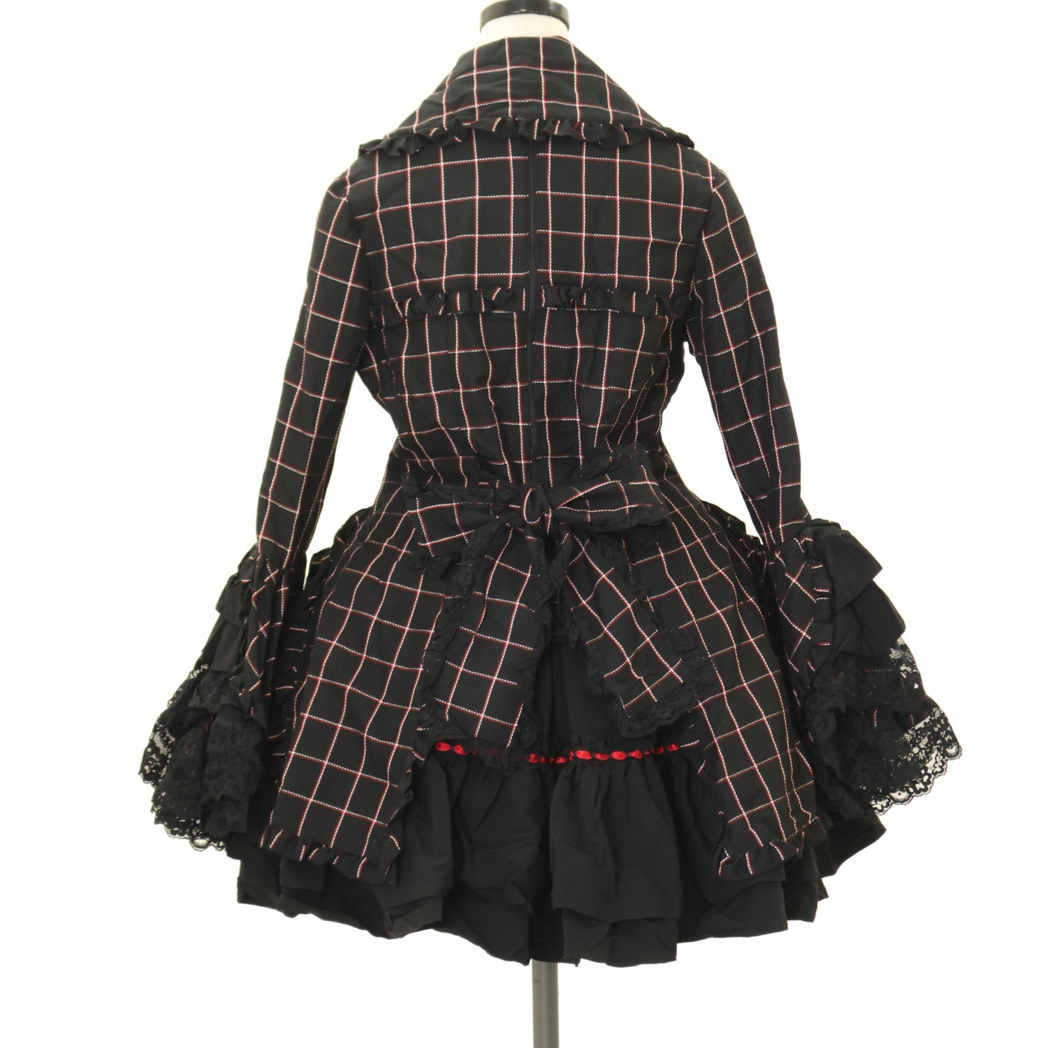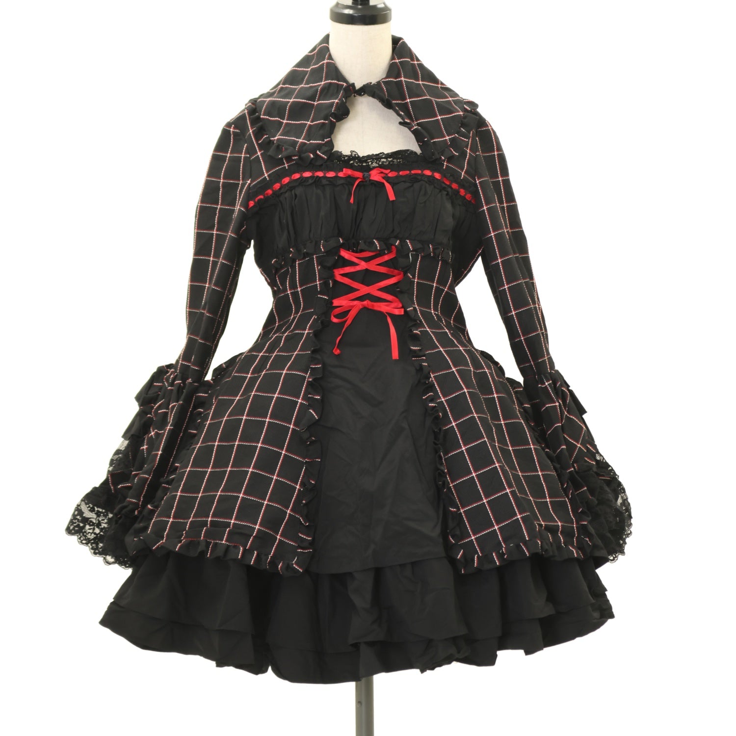 【USED】付け衿付き配色デザインワンピース +レイヤードスカート:黒赤チェック×黒レース
