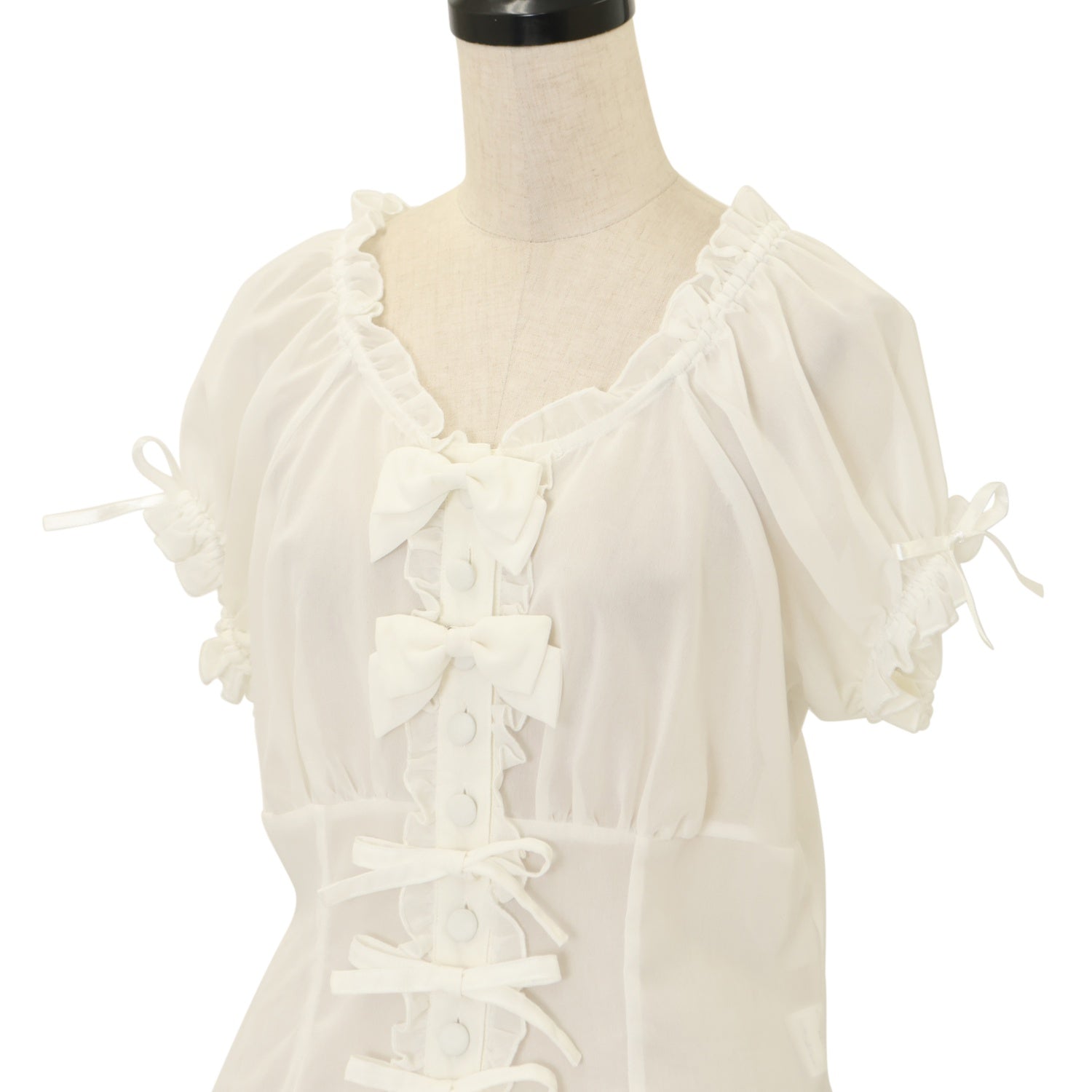 | Product status | 使用感あり ネックリボン欠品 シャーリングに目立つ伸び 襟ぐり内側・袖口内側・脇下に黄ばみ リボンブローチの安全ピン縫い付けにほつれ |
