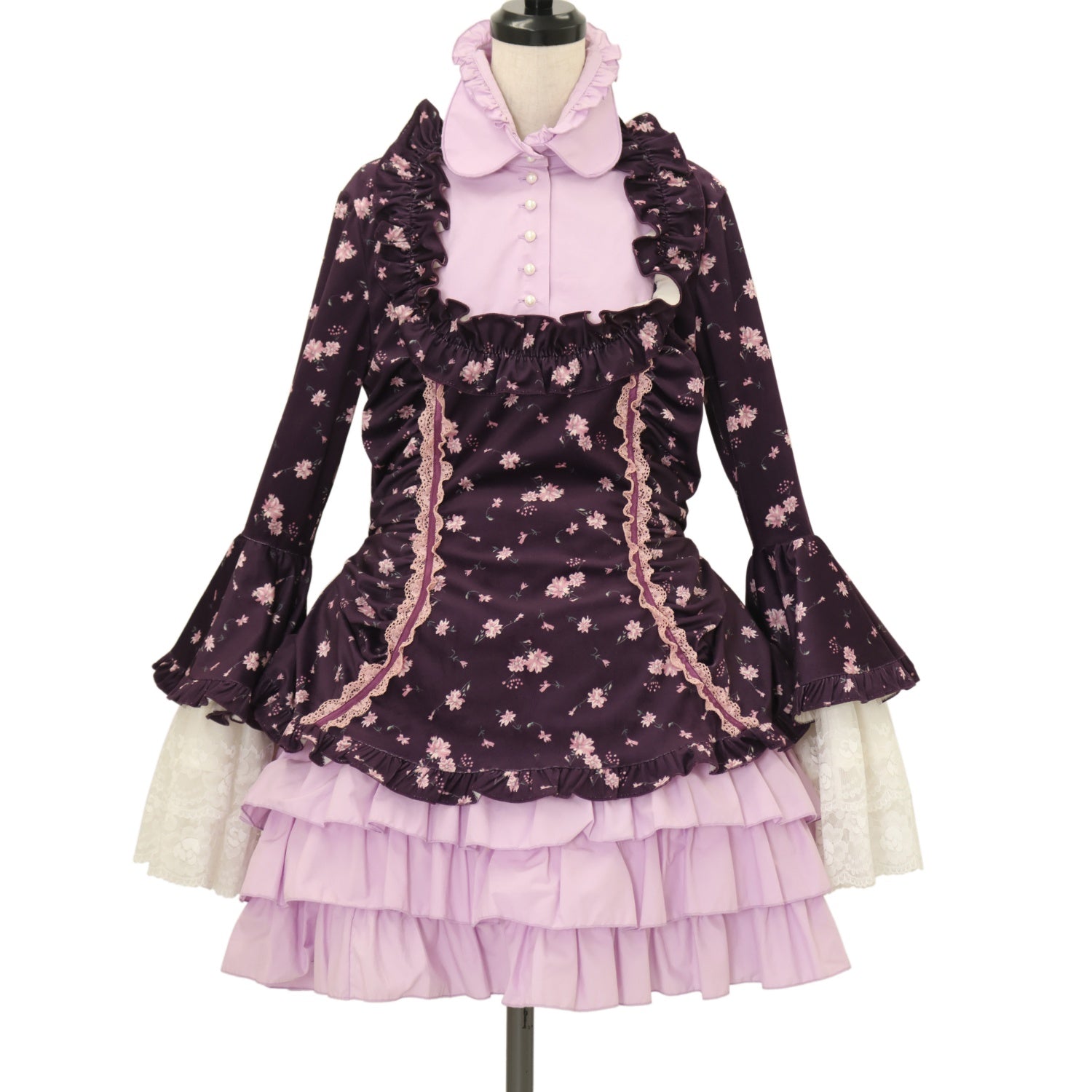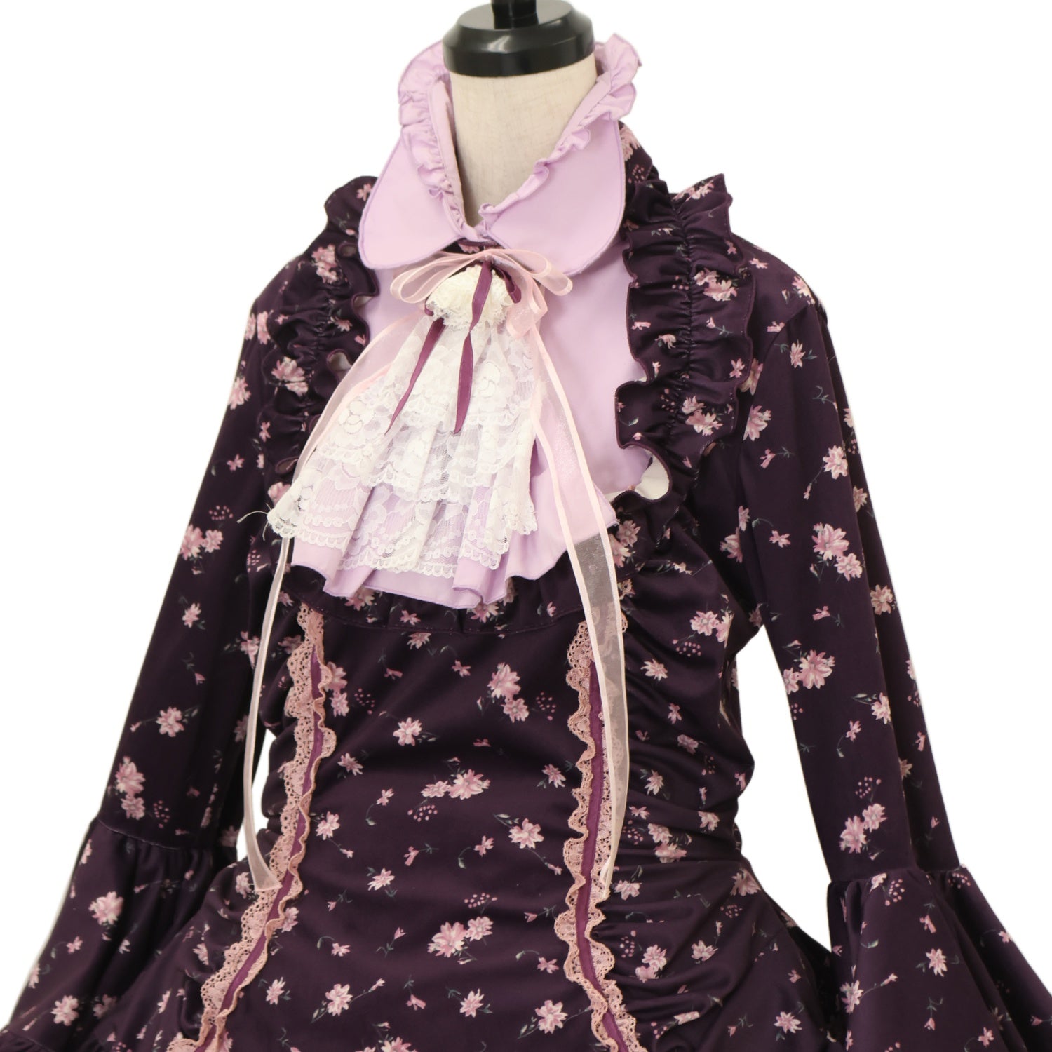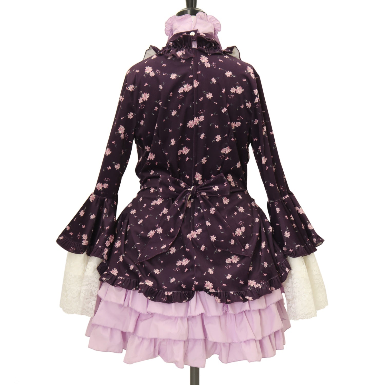 【USED】リボンデコレーション・クラシックタイ付きサイドタックドレスワンピース(紫地ピンク花柄×黒チュール×白レース)