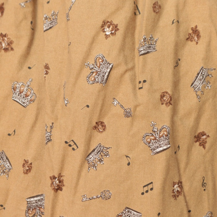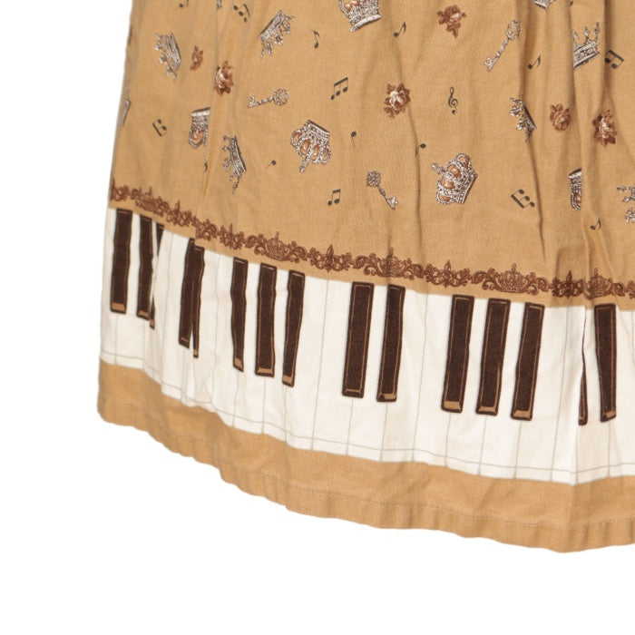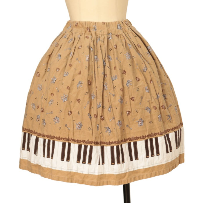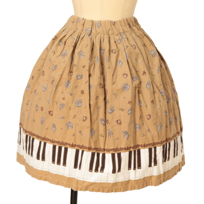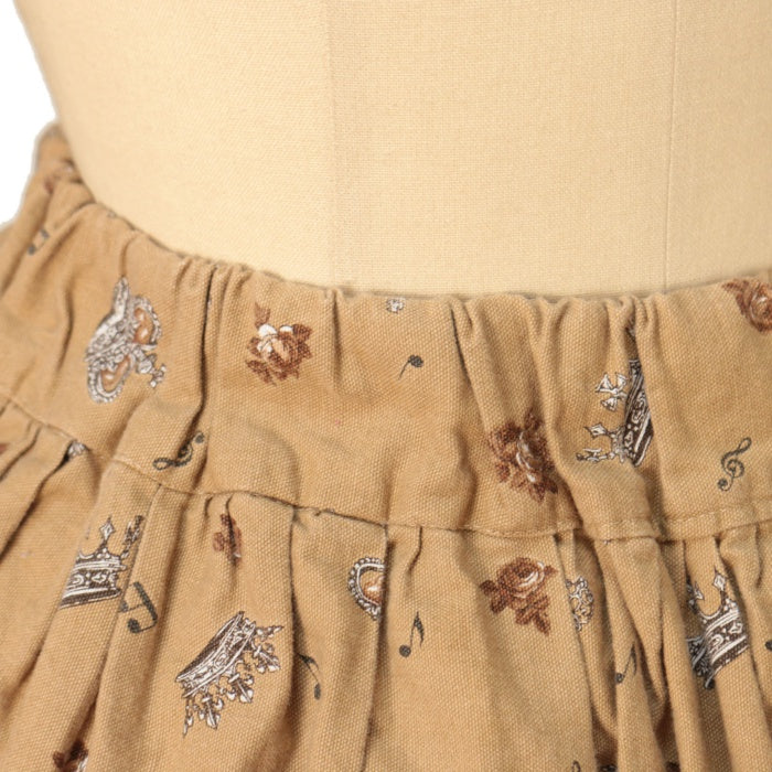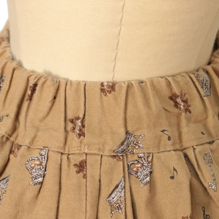 【USED】ハンドメイドギャザースカート【鍵盤裾柄×王冠柄・カフェオレブラウン】
