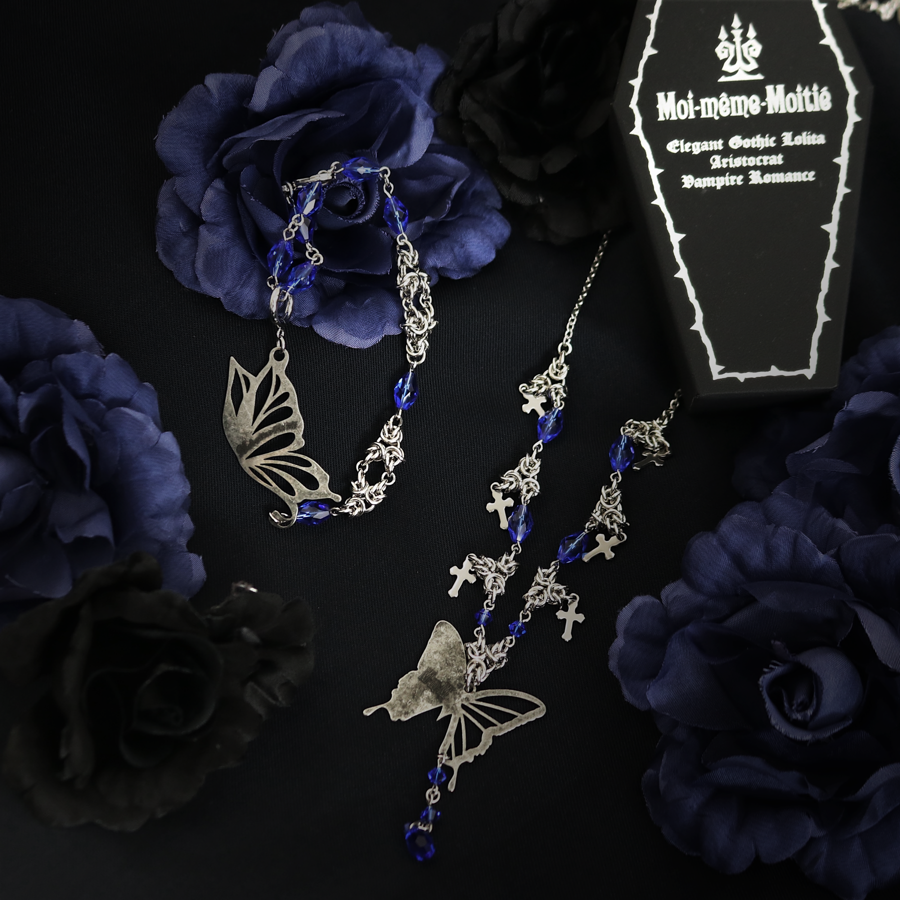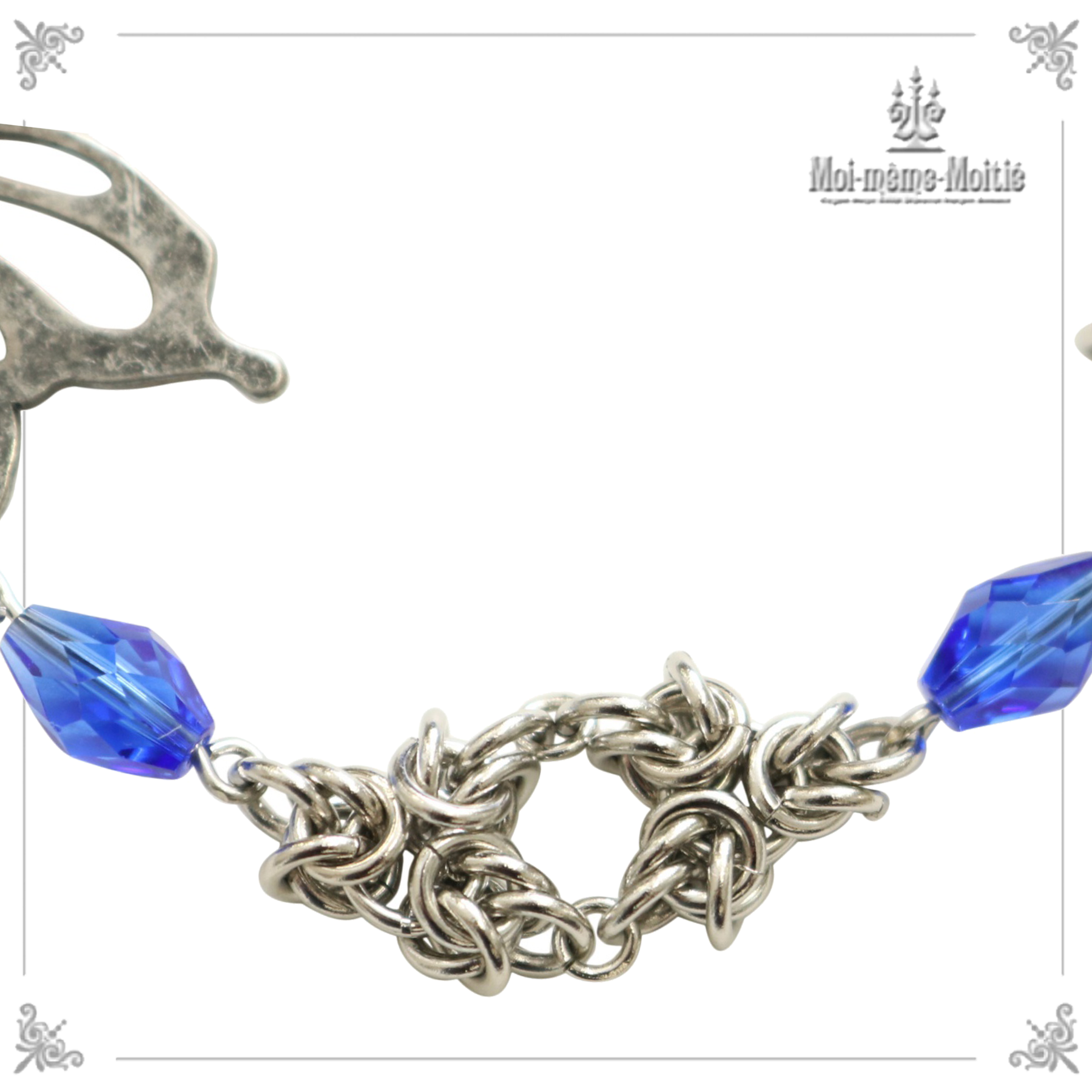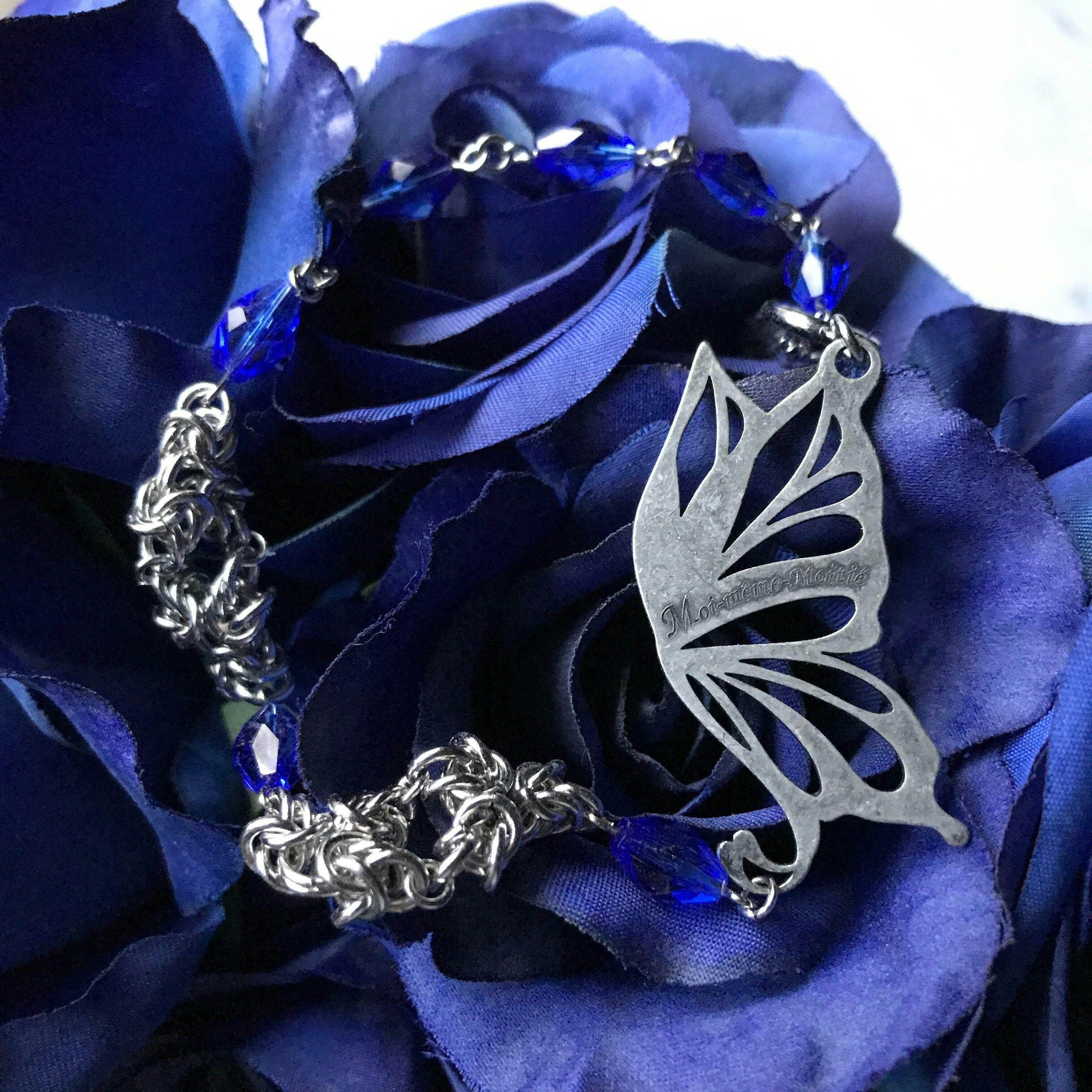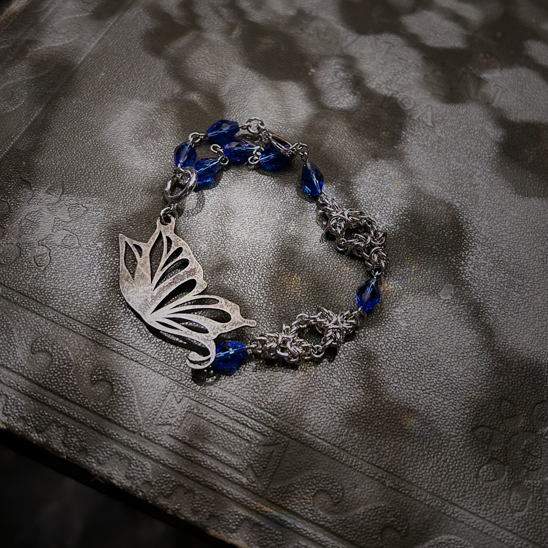 幾重に編まれたチェーンは、手編みで製作し、オリジナルの蝶チャームが付いています。