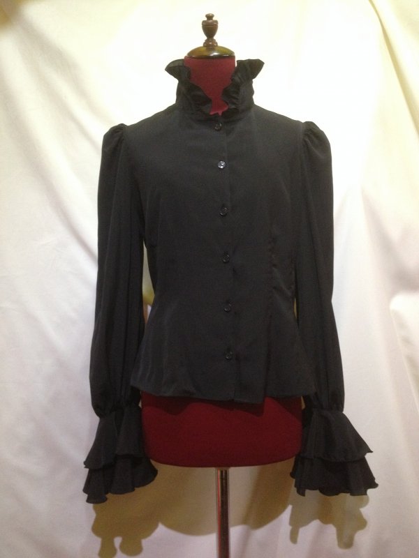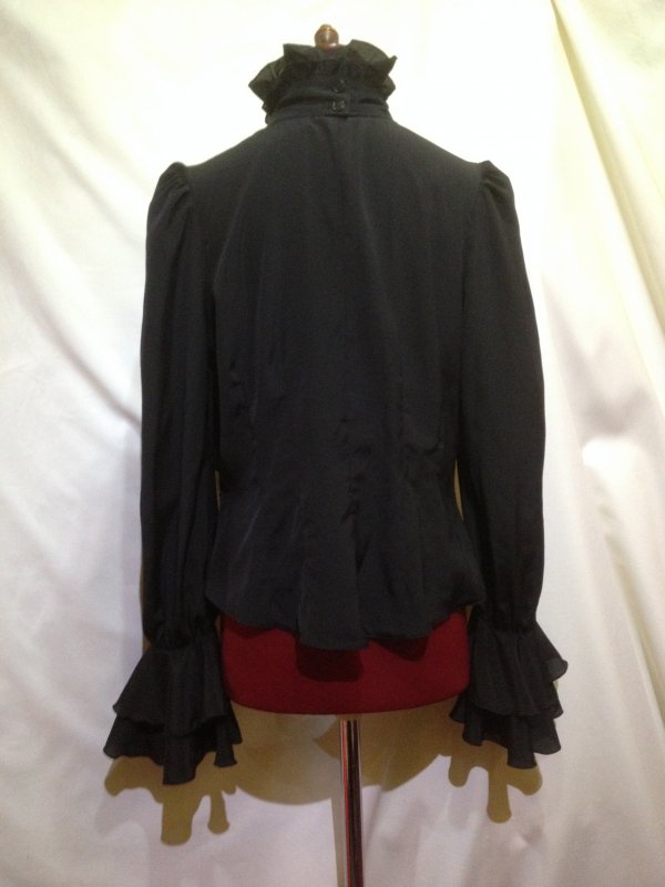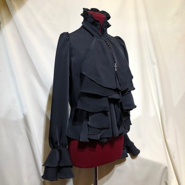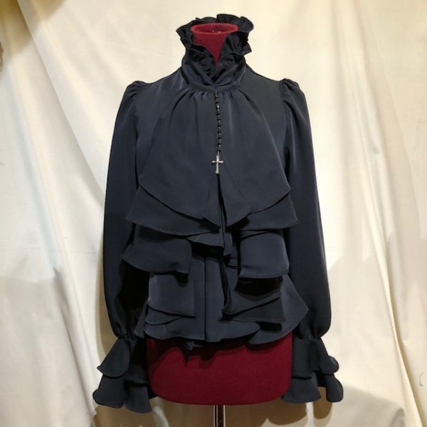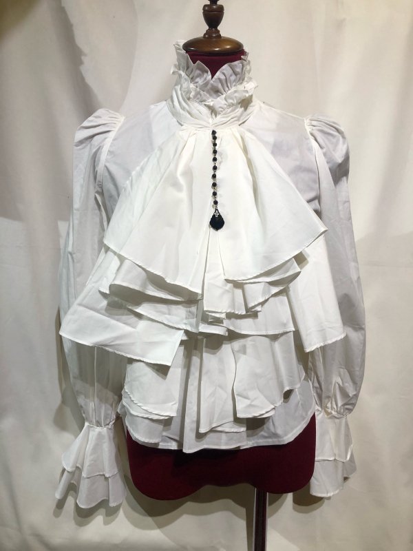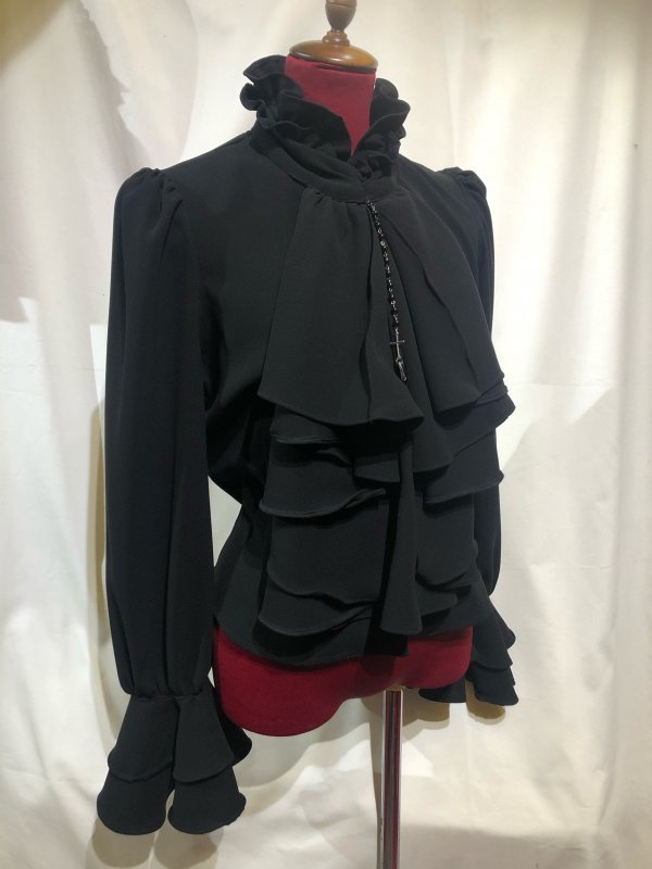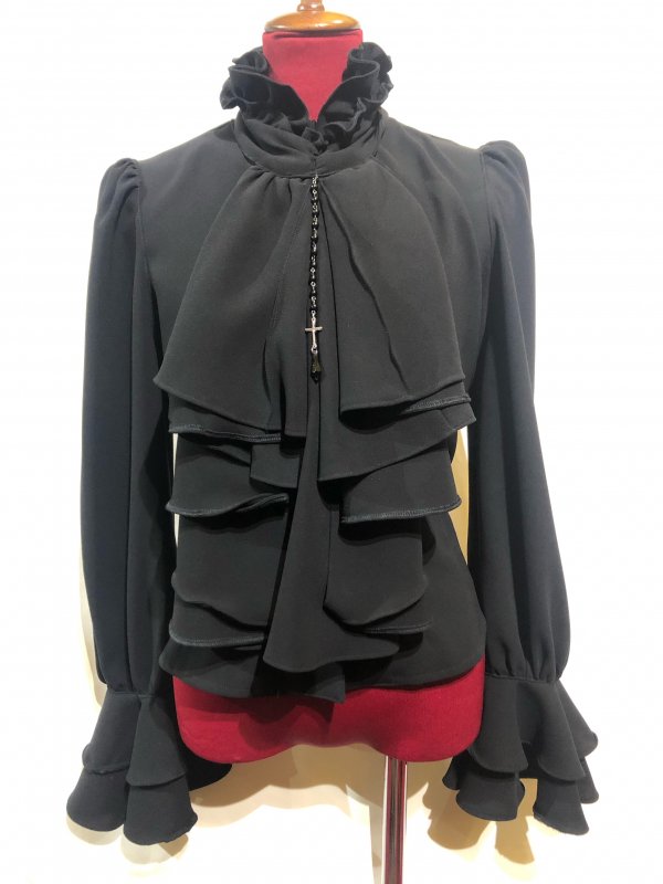 ★パールチェーンの先についた十字架が揺れる豪華なロングタックドレープタイがついたビショップスリーブのゴシック調ブラウスです。
