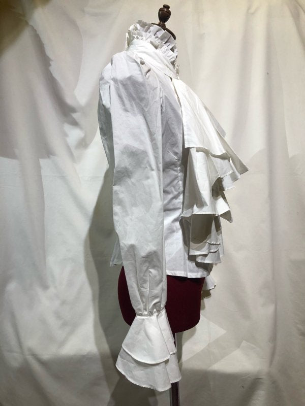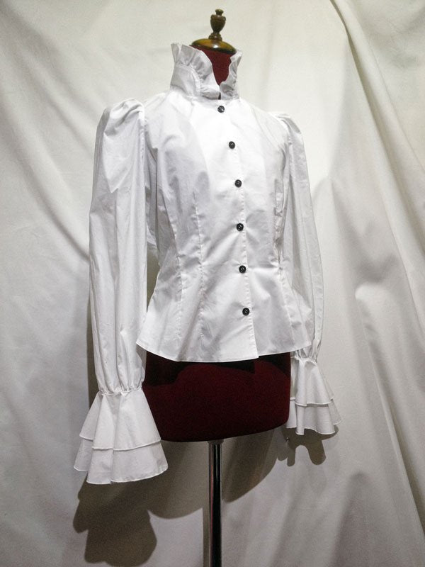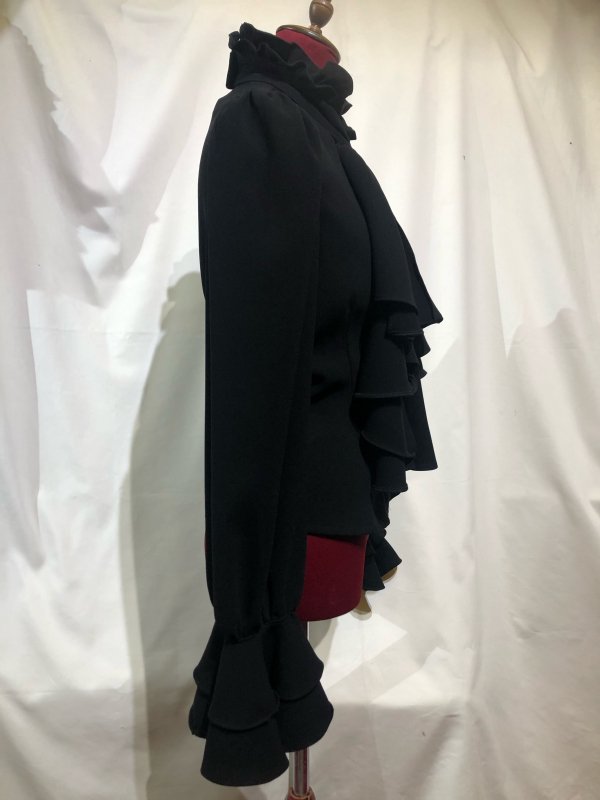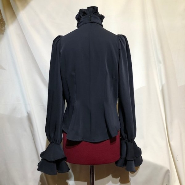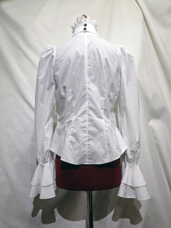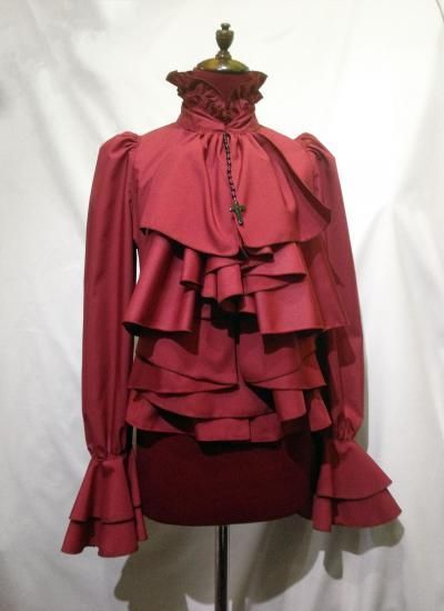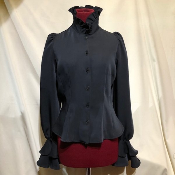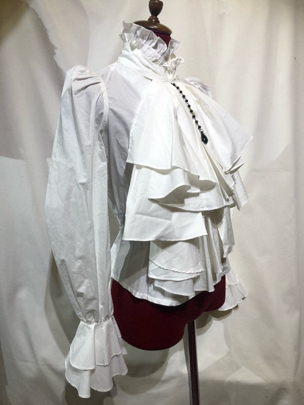 ★パールチェーンの先についた十字架が揺れる豪華なロングタックドレープタイがついたビショップスリーブのゴシック調ブラウスです。