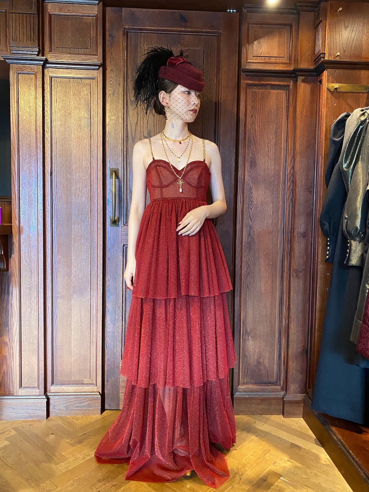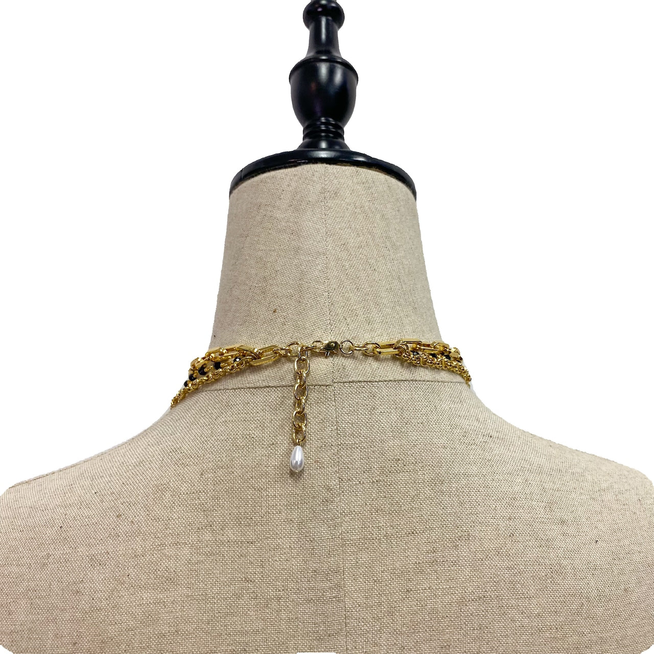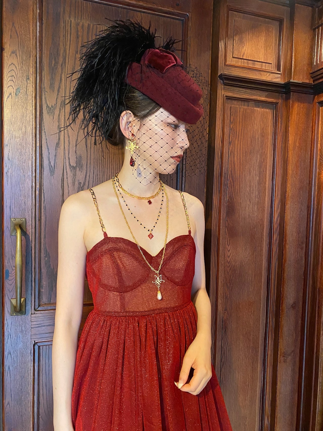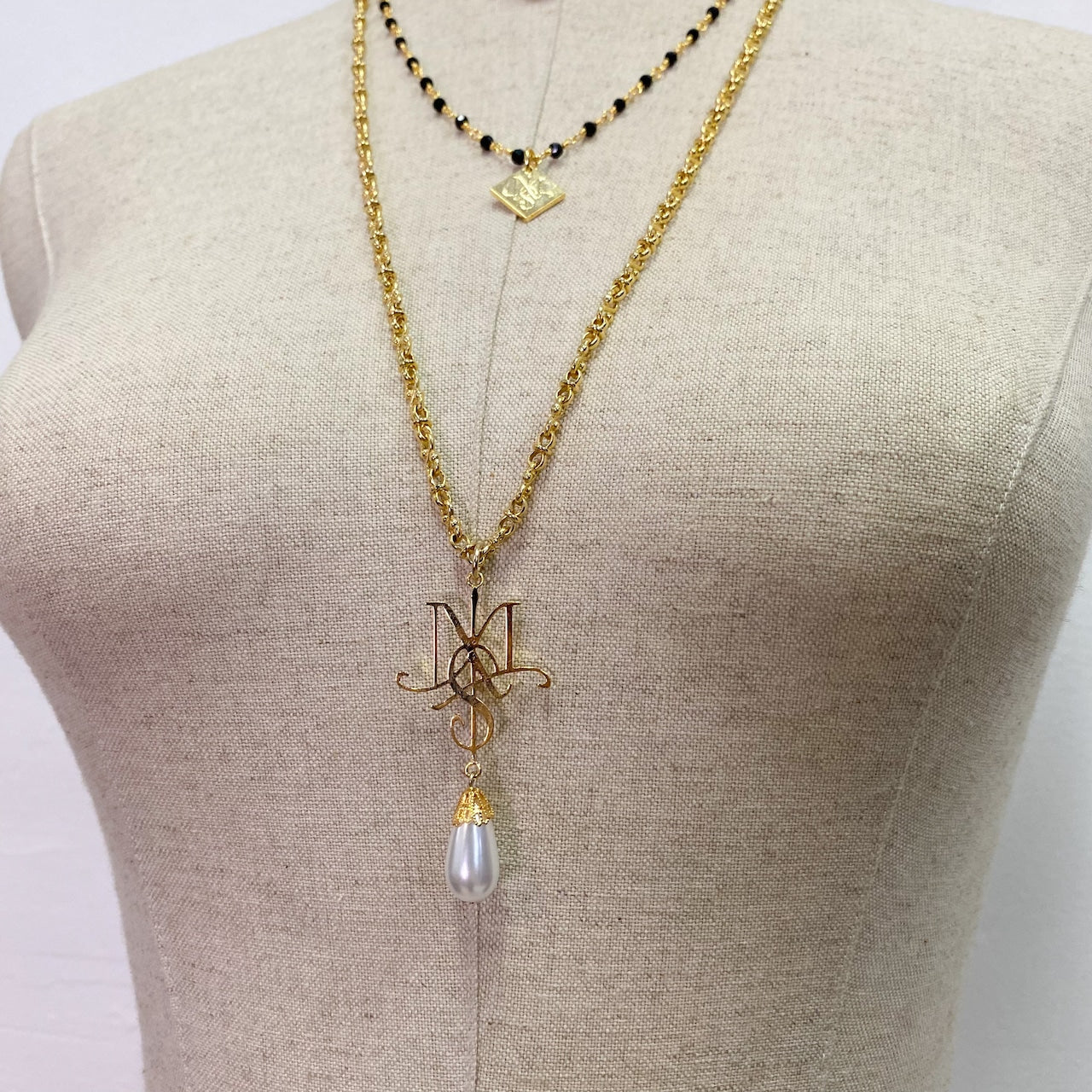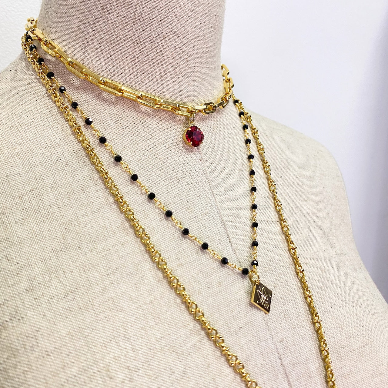 それぞれ違う種類のチェーンで1段目には赤いクリスタル。2段目にはロゴプレート。3段目にはオリジナルのロゴからドロップパールが下がります。