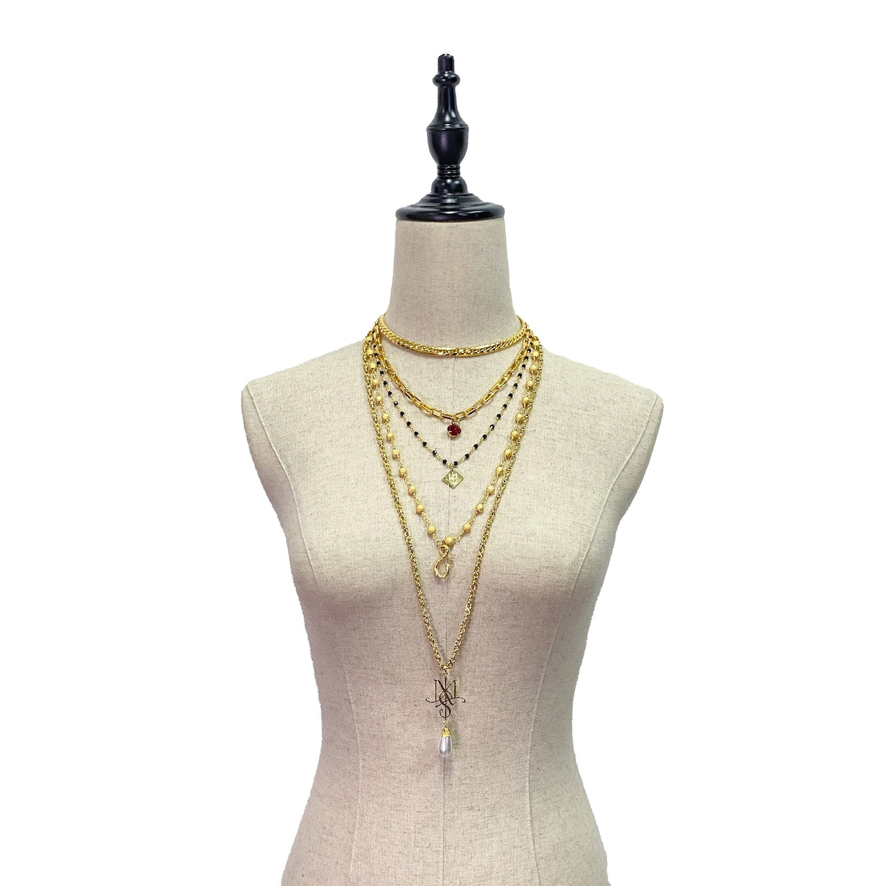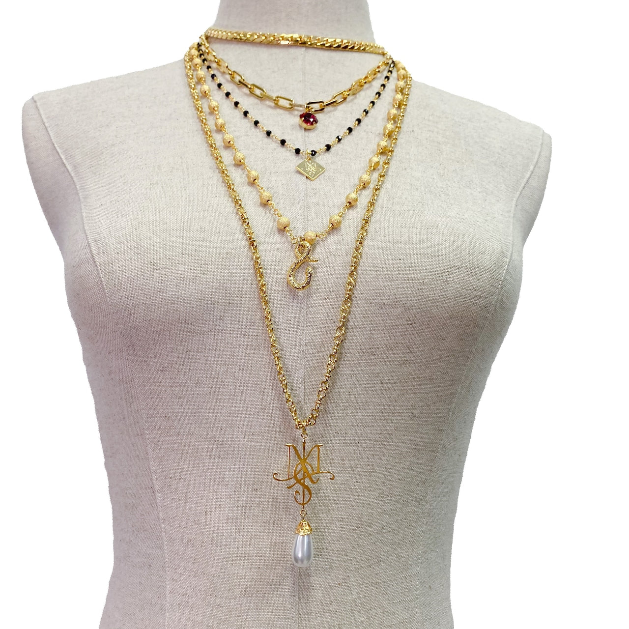 それぞれ違う種類のチェーンでモチーフが下がっており、2段目には赤いクリスタル。3段目にはロゴプレート。4段目にはオリジナルのスネークフック。5段目にはオリジナルのMSロゴからドロップパールが下がります。
