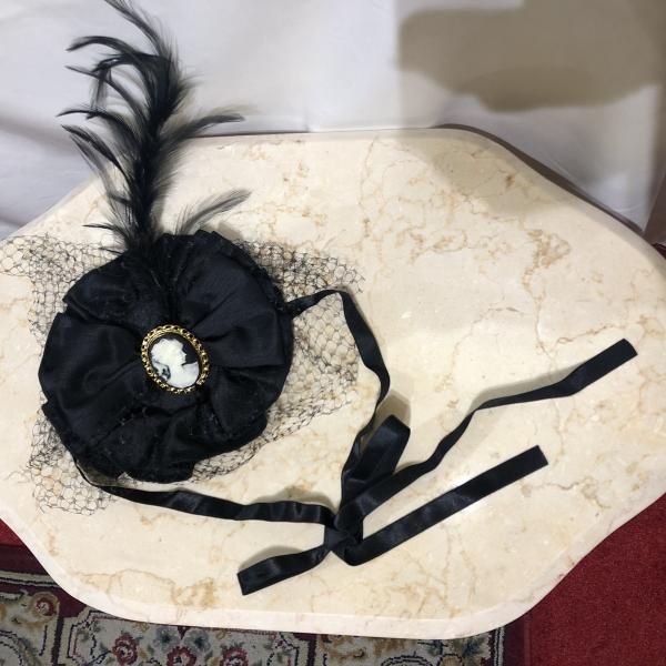 ★大きなパール粒が華やかな、大きめのカメオブローチが付いたクラシカルな羽付きボンネットです。