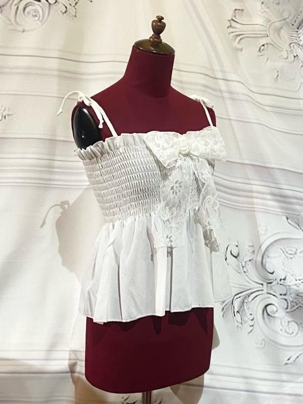 バラブローチ付きのレースリボンが華やかなキャミソールです。 肩紐を結んでの長さ調節可能です。