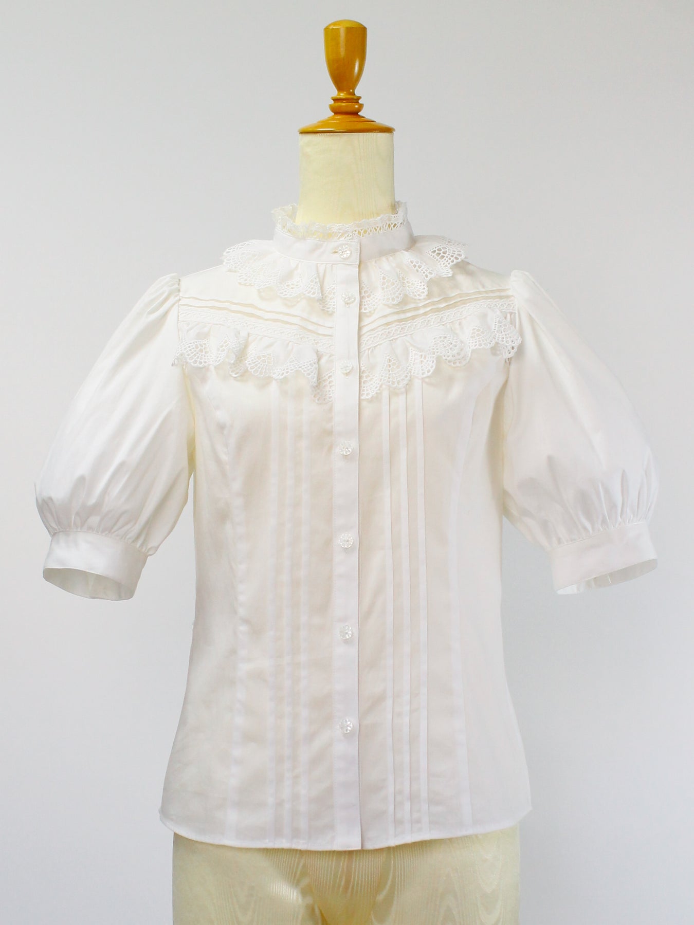 胸元にたっぷりピュアな白レースのフリルをあしらったボリュームのあるブラウスは