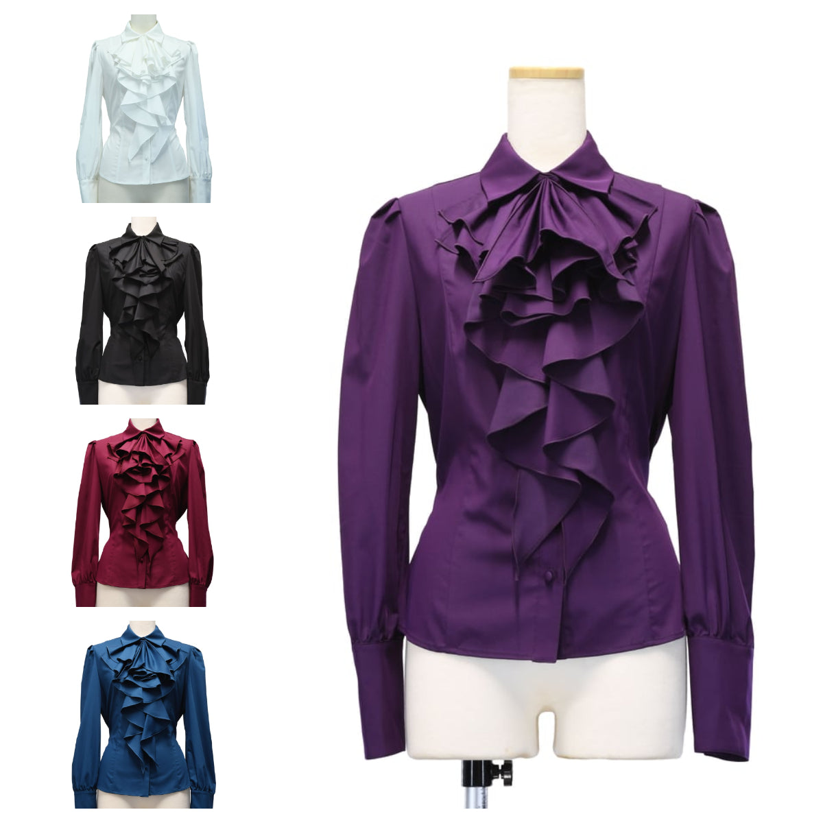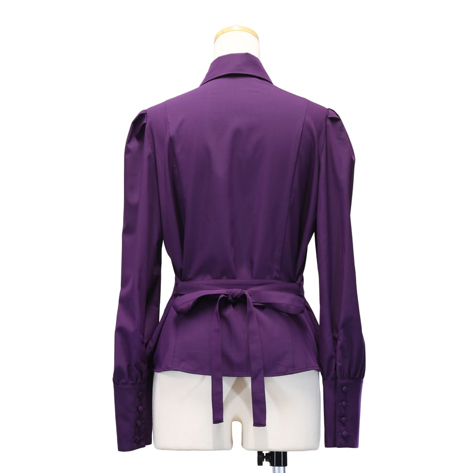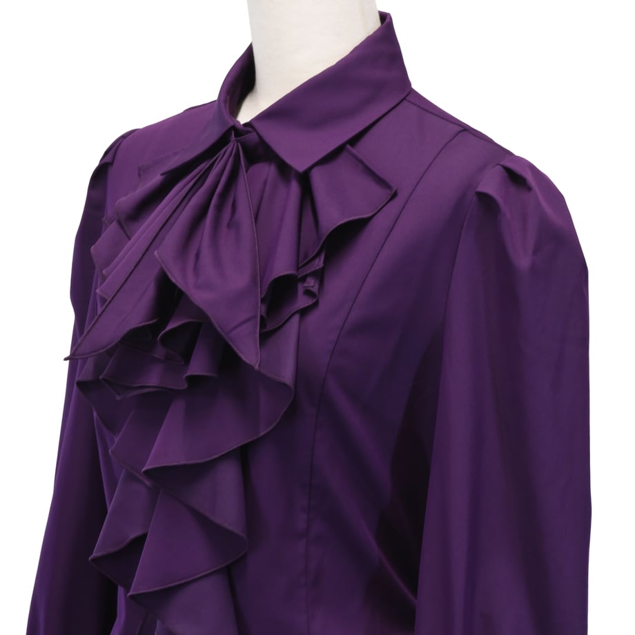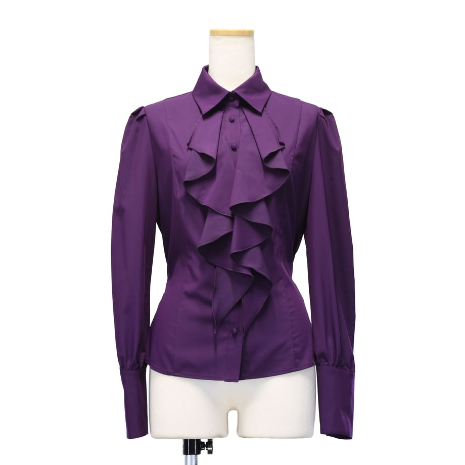 取り外し可能なジャボと前立てのラッフルフリルによるボリューム感が魅力的なブラウス。