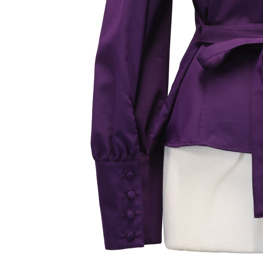 長く細めのカフスにボリュームの強いスリーブが高貴な印象のビショップスリーブと、リボンによるウエストの絞り感がメリハリの効いたデザインです。