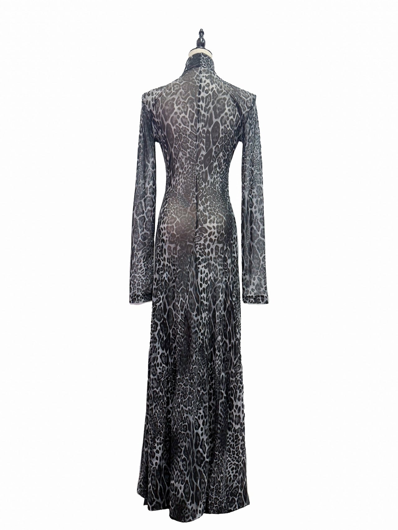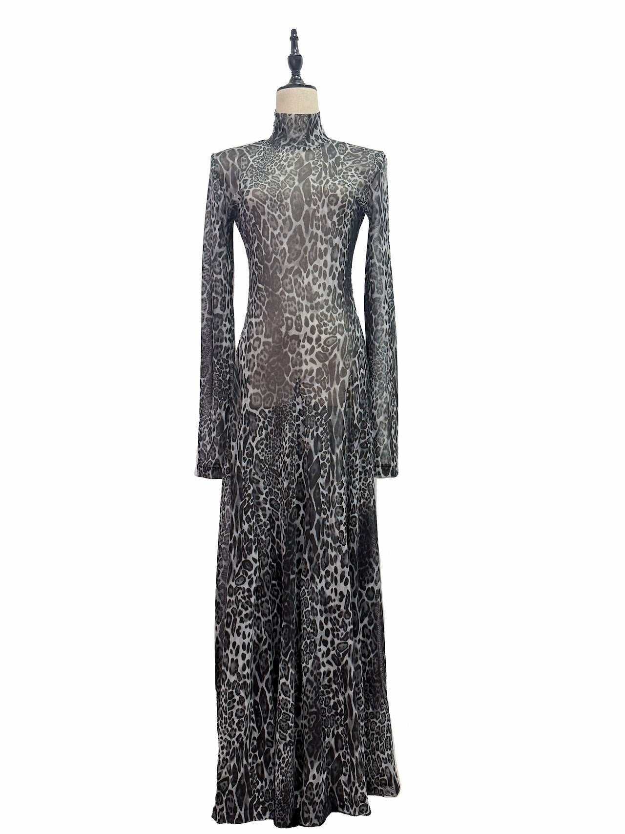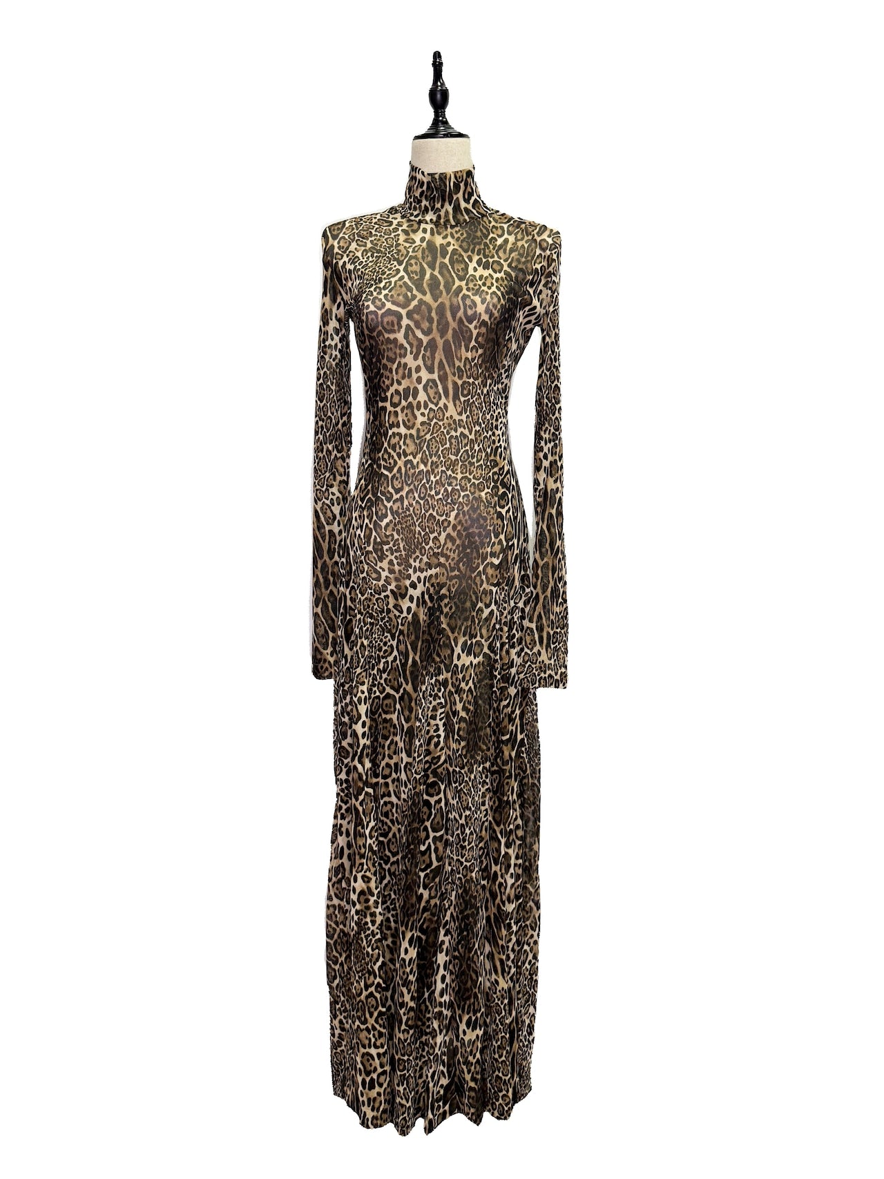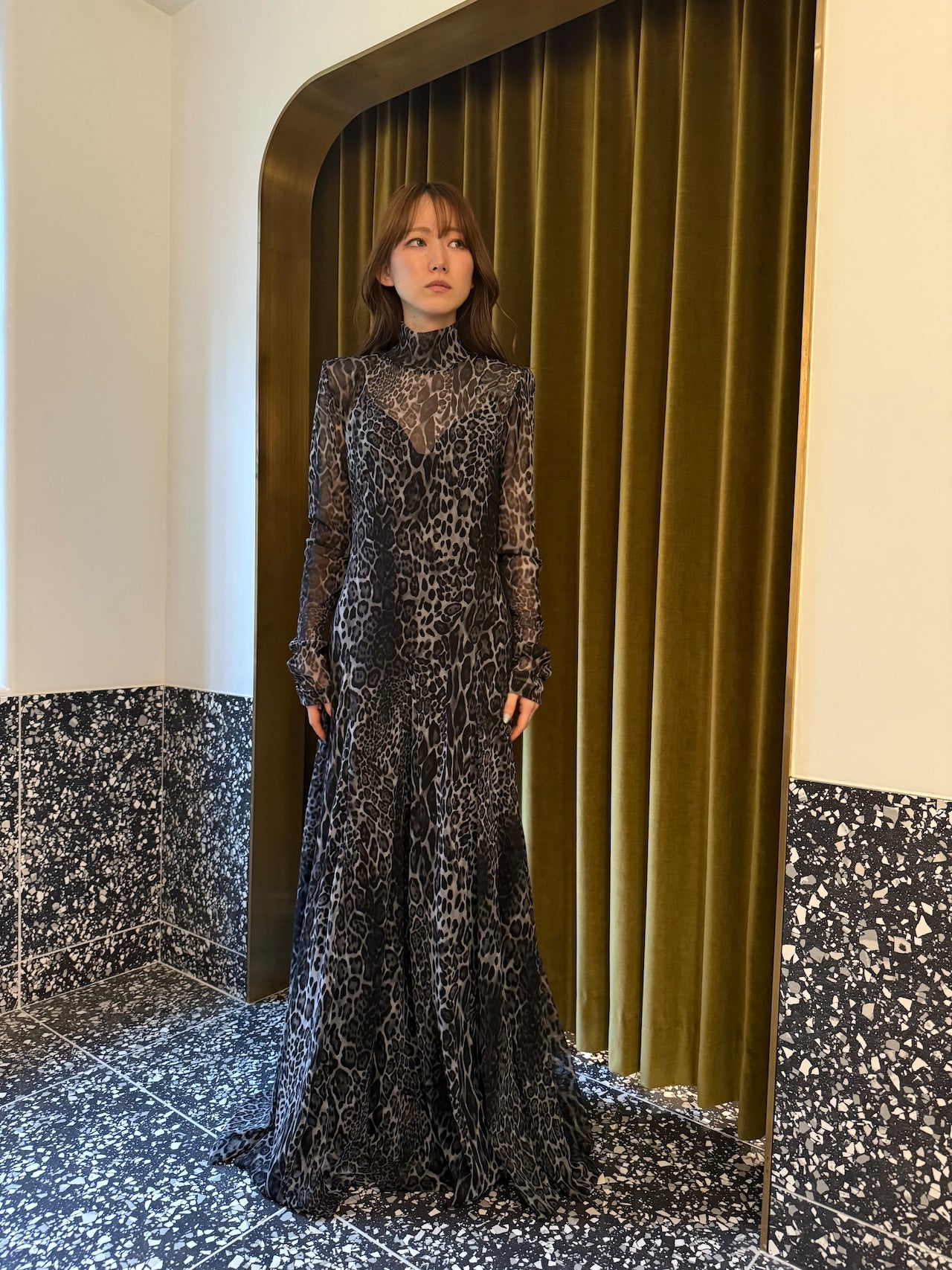 ヒョウ柄の生地を全面に使用したインパクトのあるドレス。