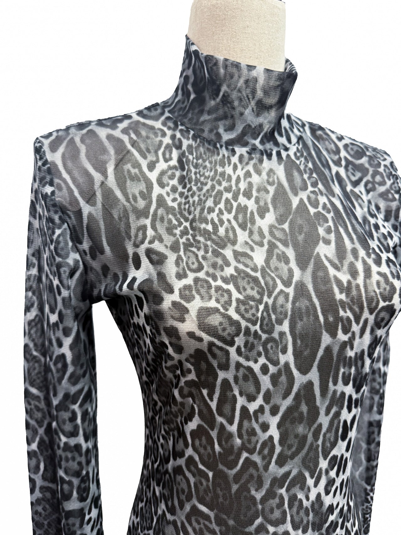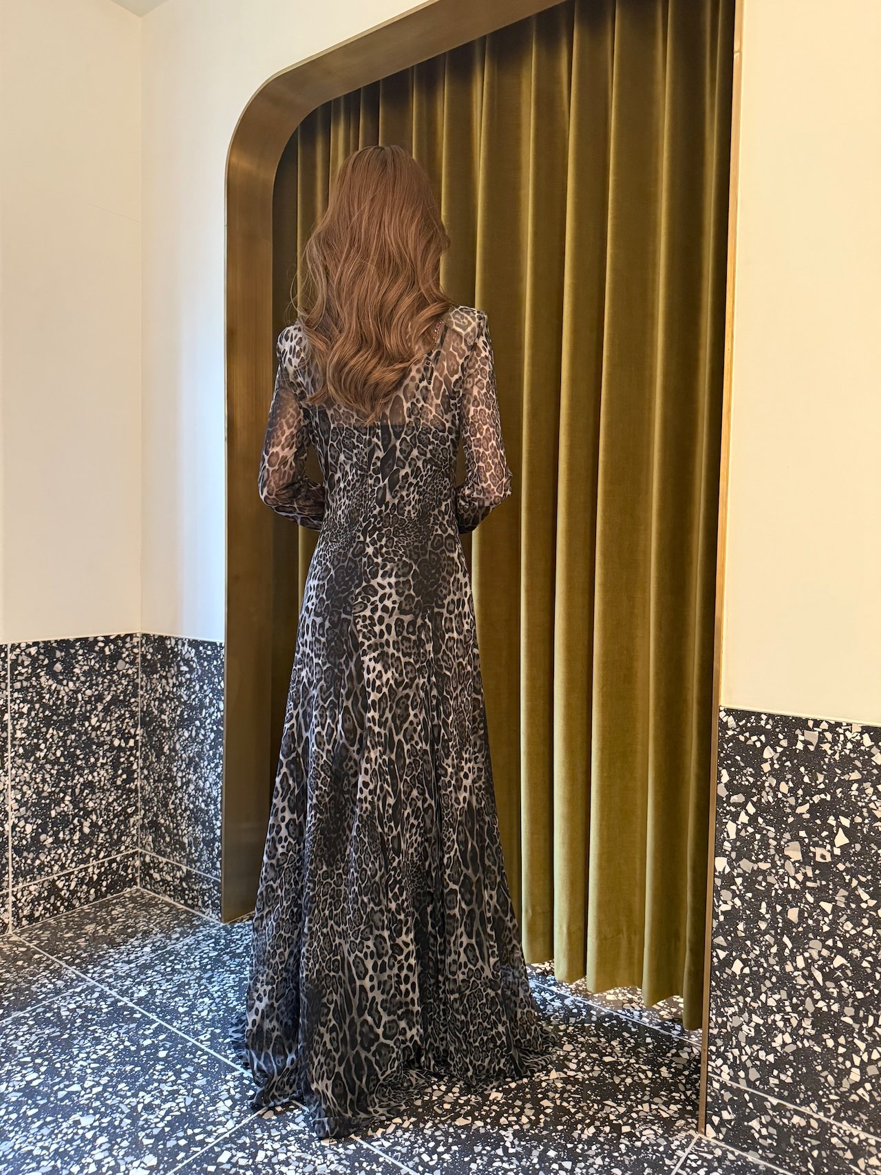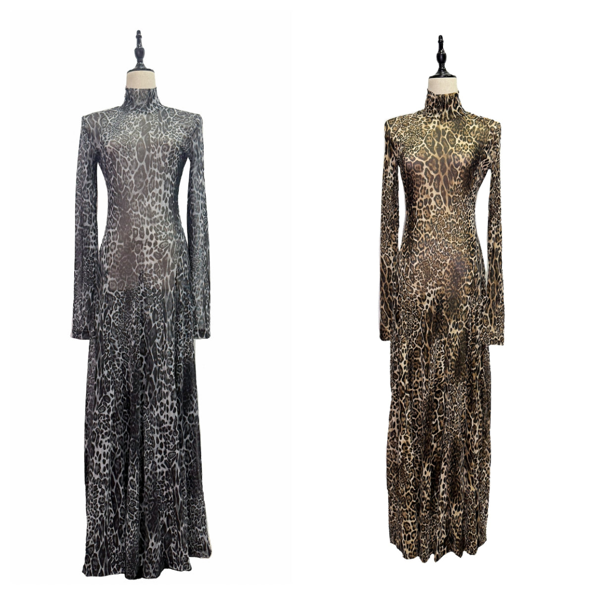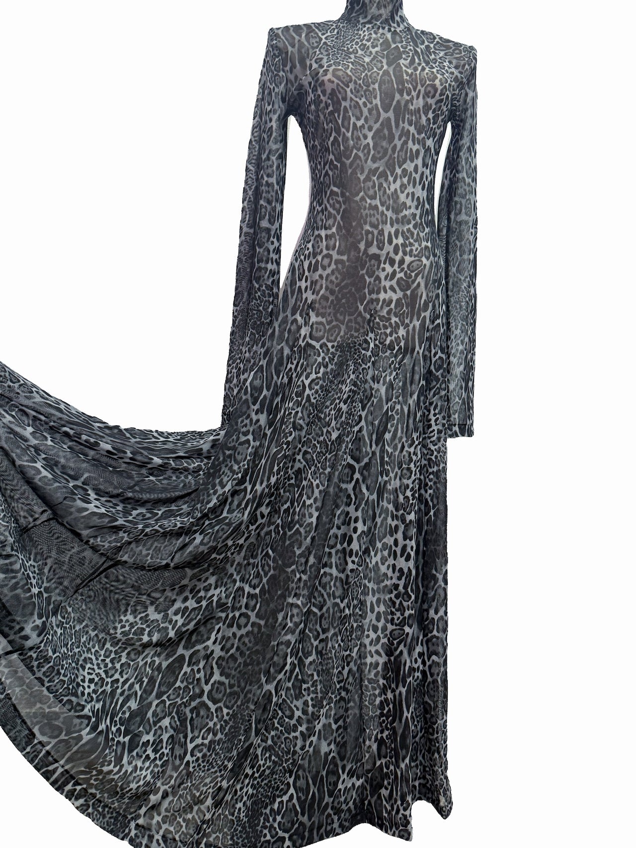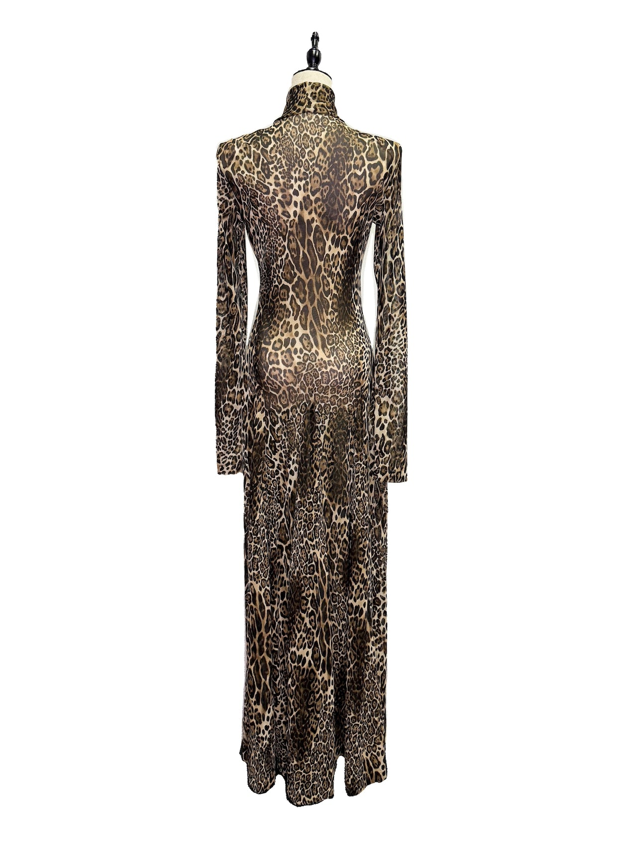 ヒョウ柄の生地を全面に使用したインパクトのあるドレス。