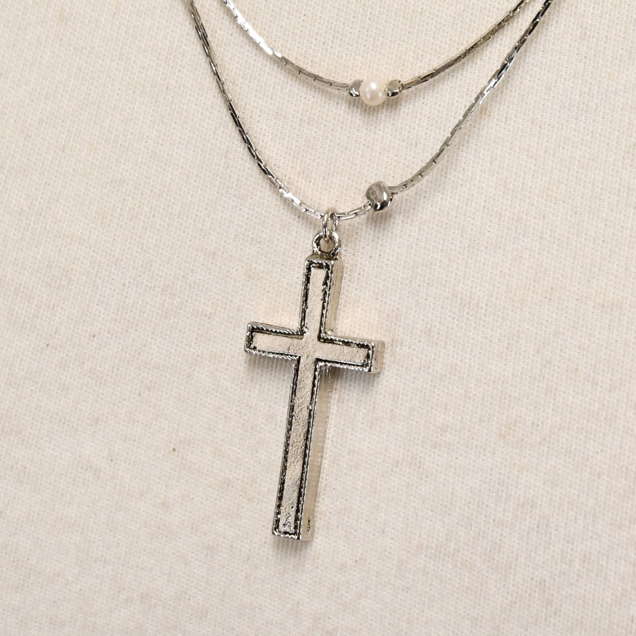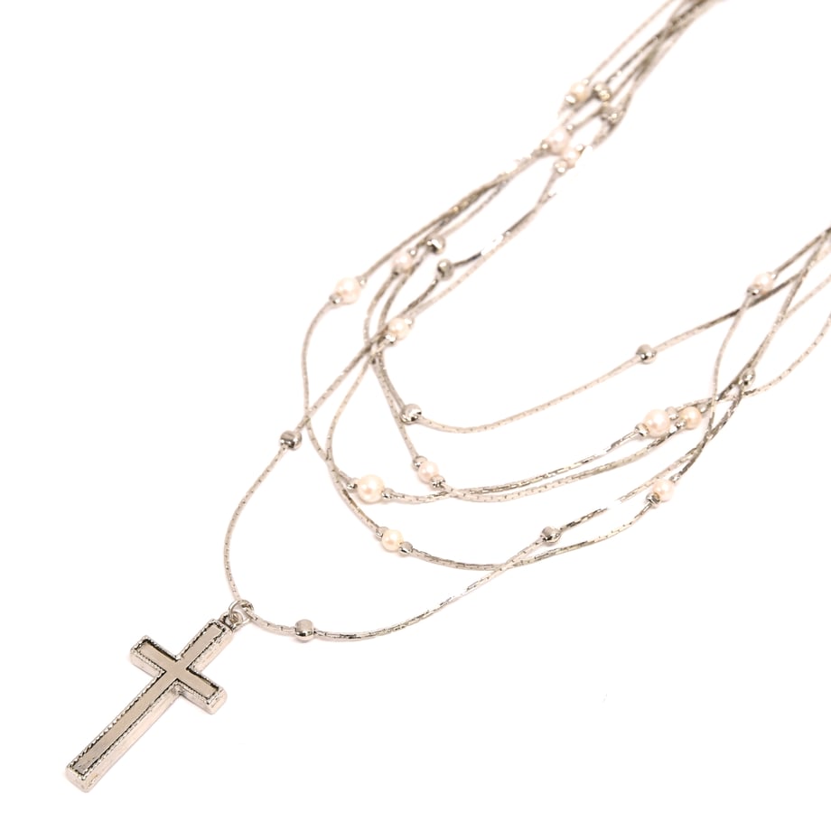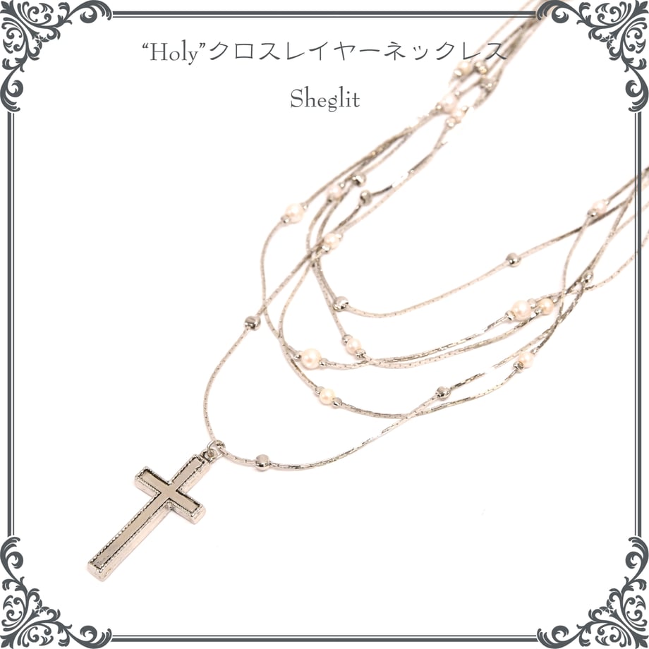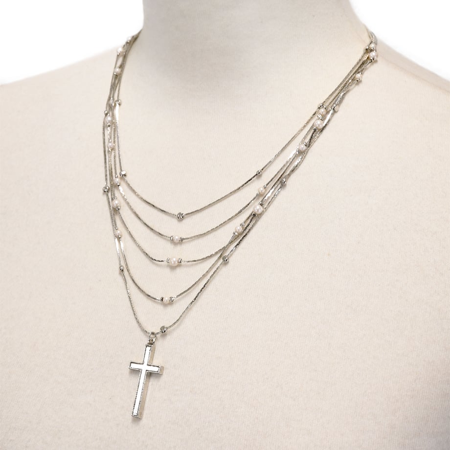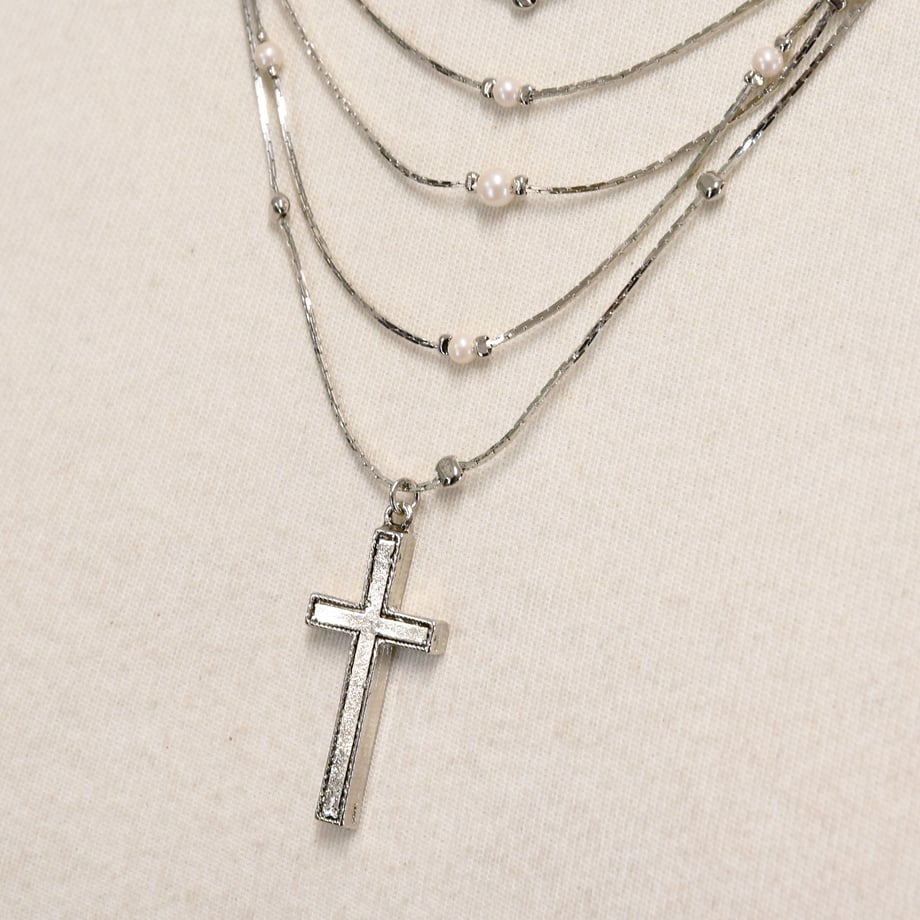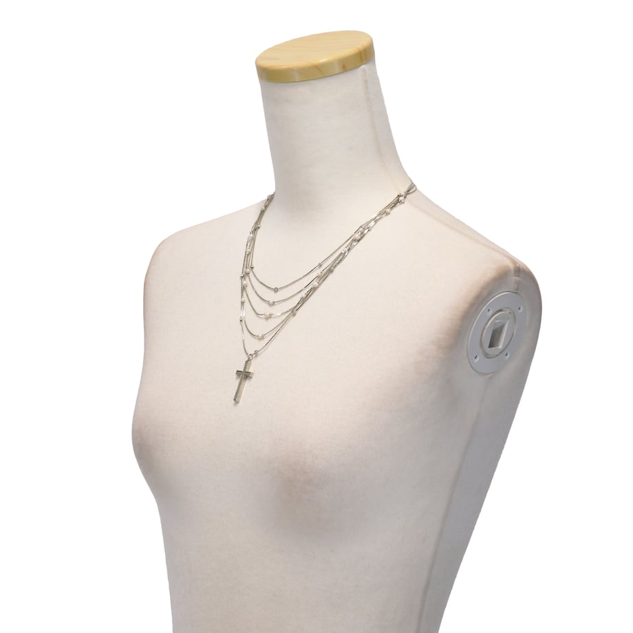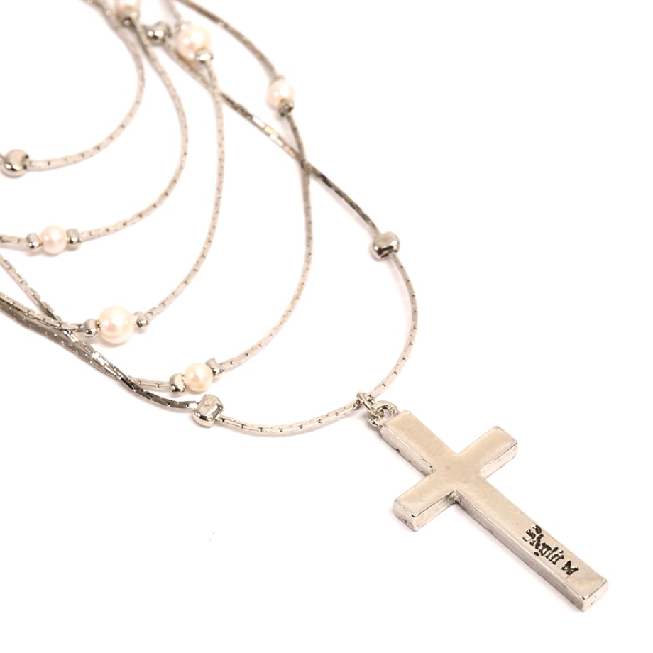 繊細なチェーンと小粒のパールを幾重にも重ね、胸元に神聖なクロスを添えたレイヤードネックレス。