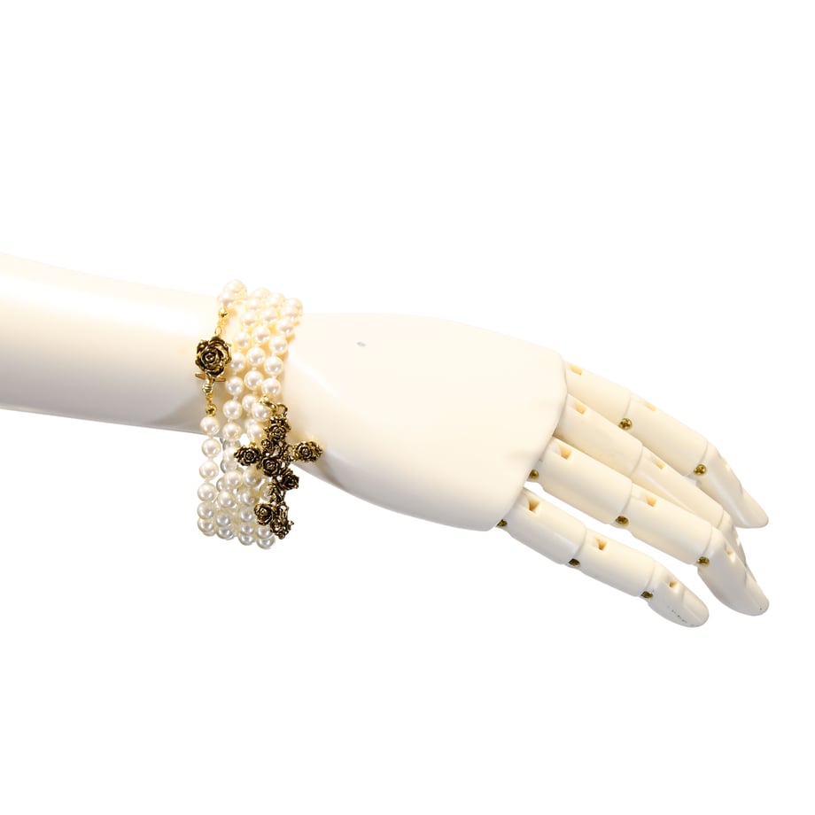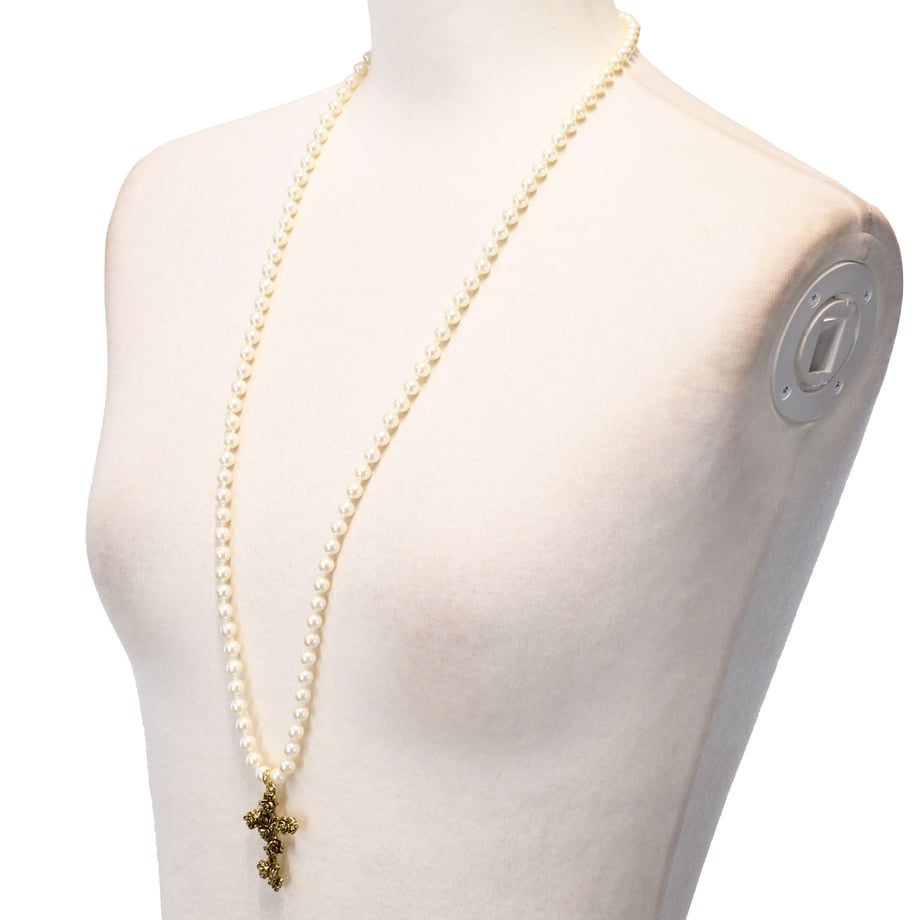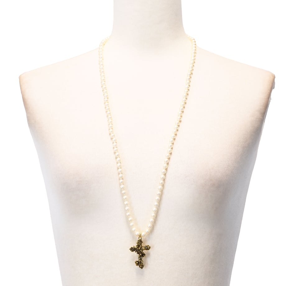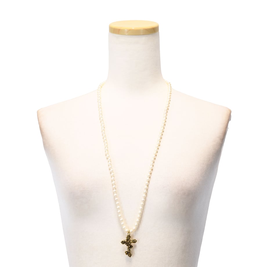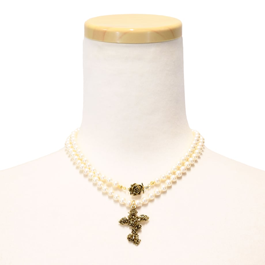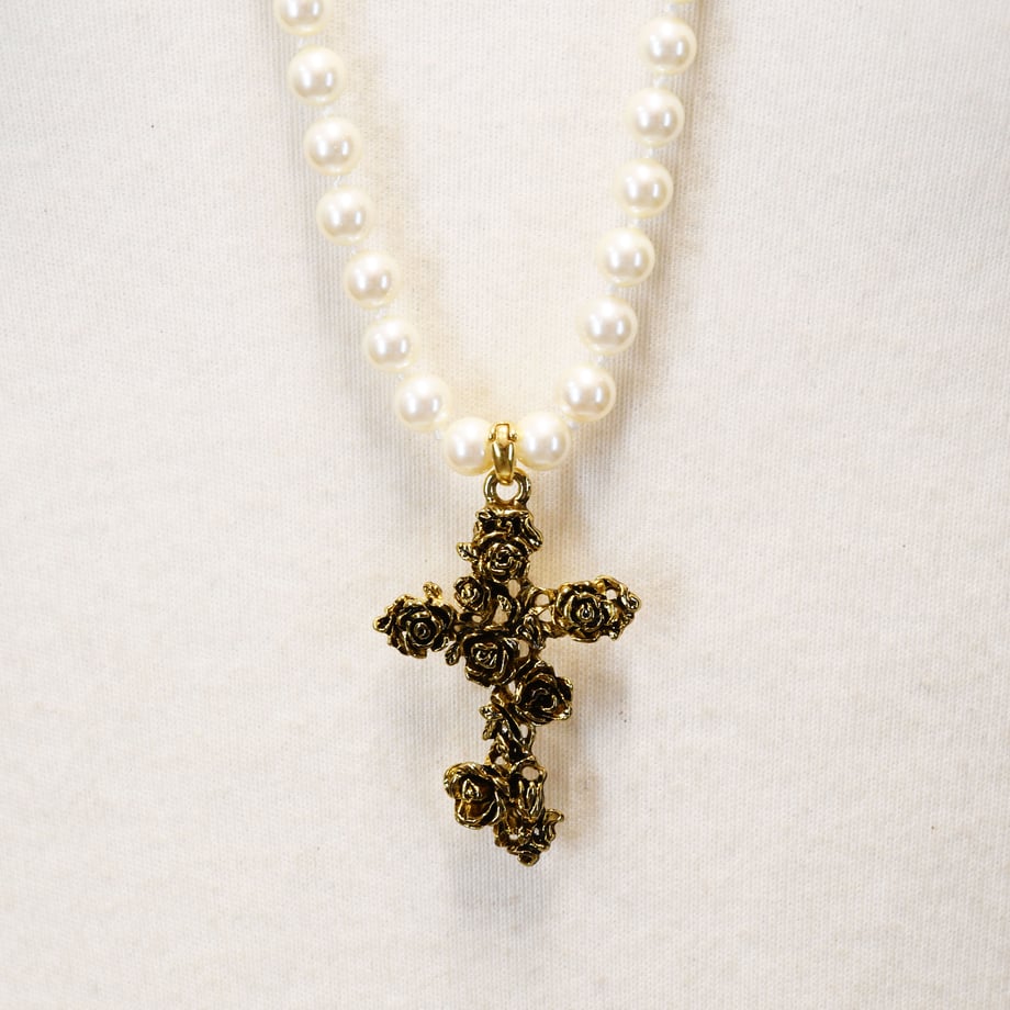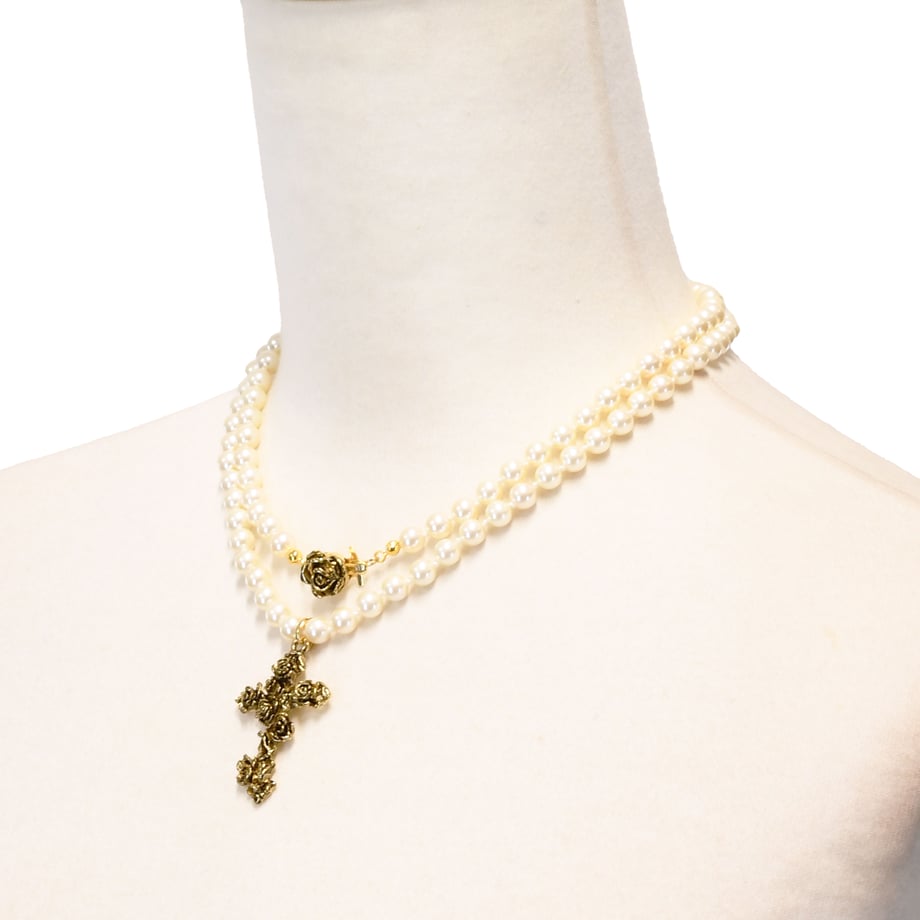 トップには繊細に仕上げられた薔薇モチーフの十字架が輝き、華やかなアクセントに。