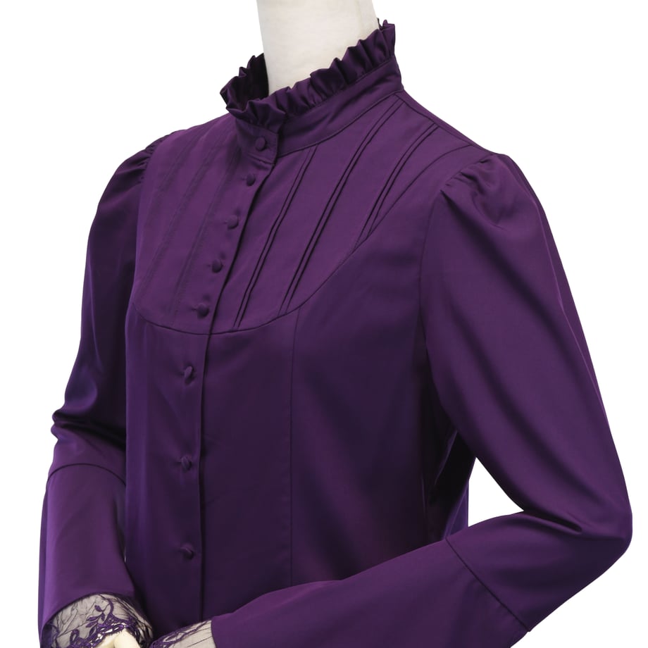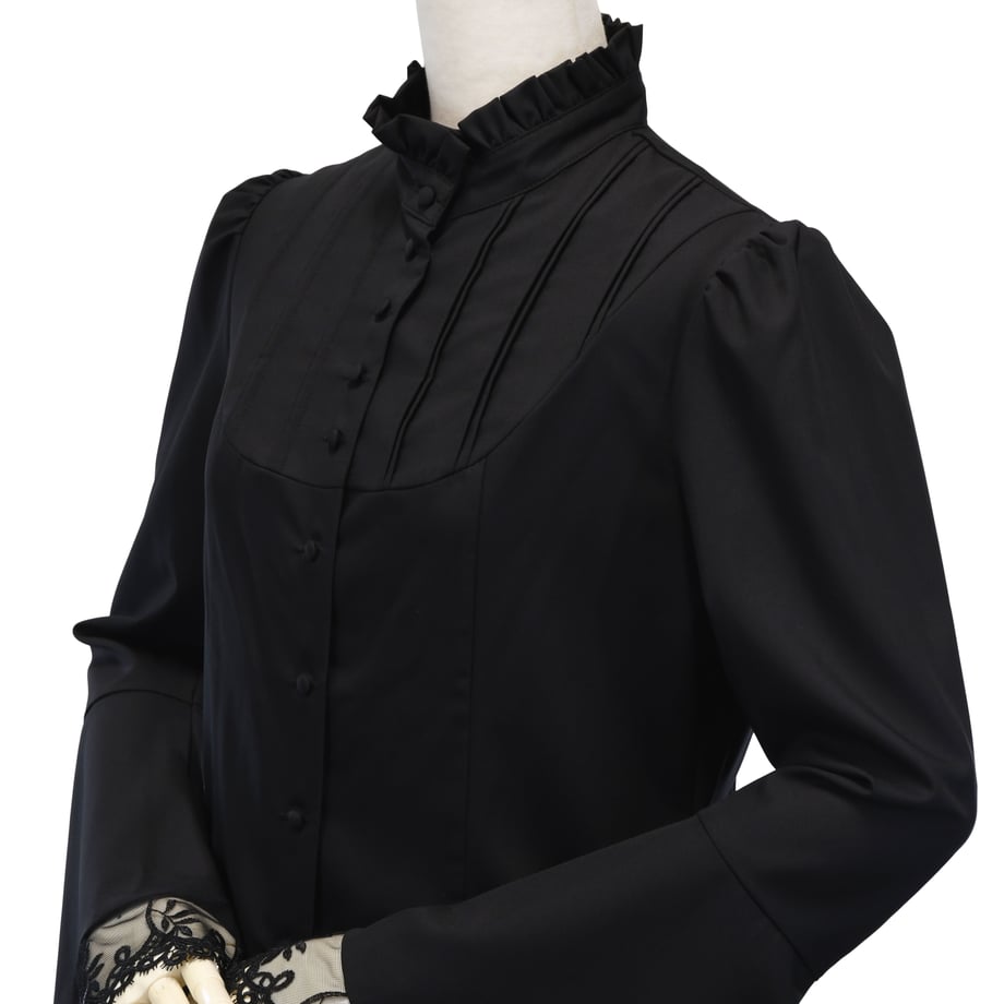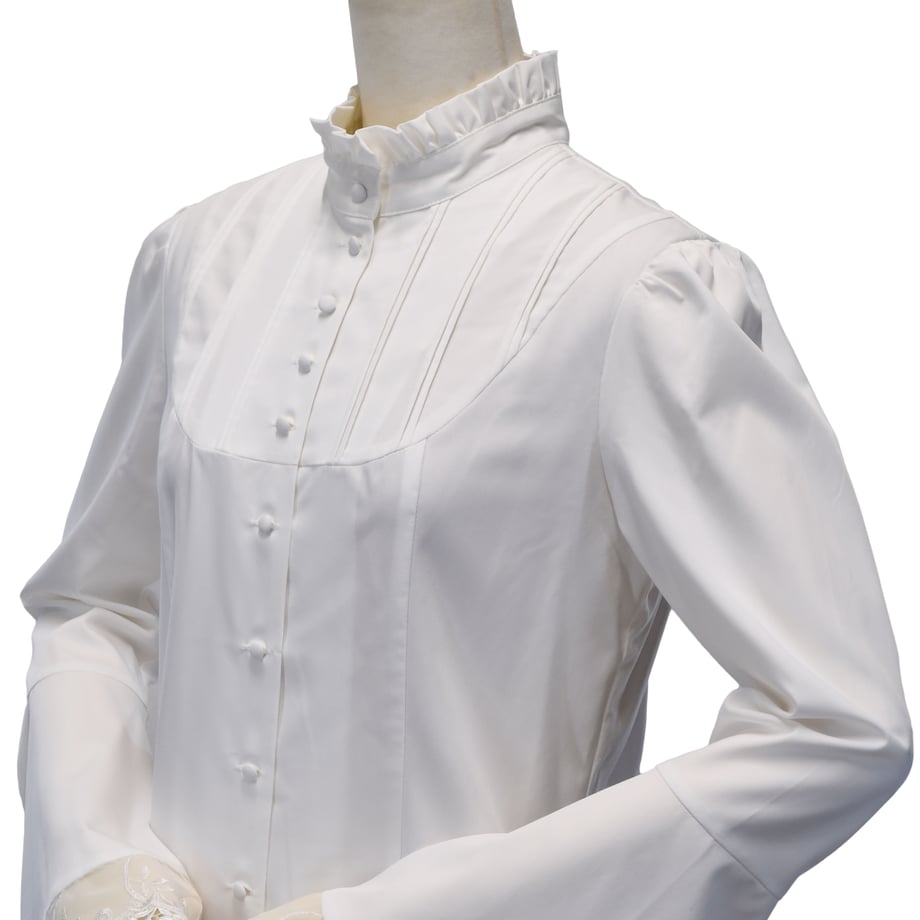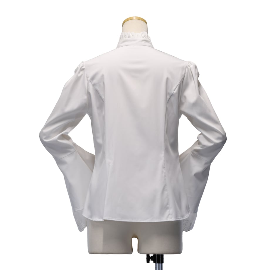 胸元の繊細なタックワークと高めのスタンドカラーが品のある表情を作る●Arcana シリーズ●のブラウス。