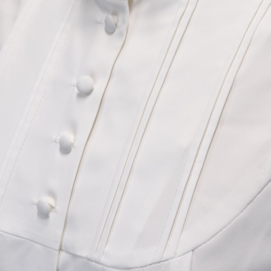 胸元にはくるみボタンを並べ、細部までクラシカルな趣きを大切に仕上げました。
