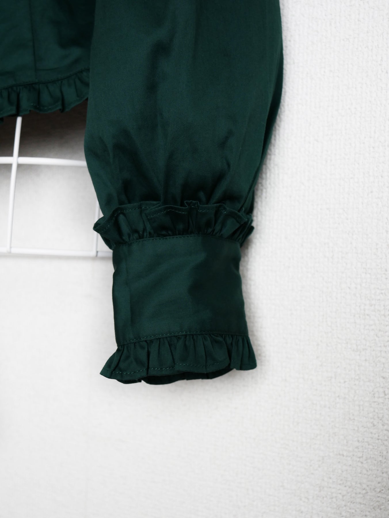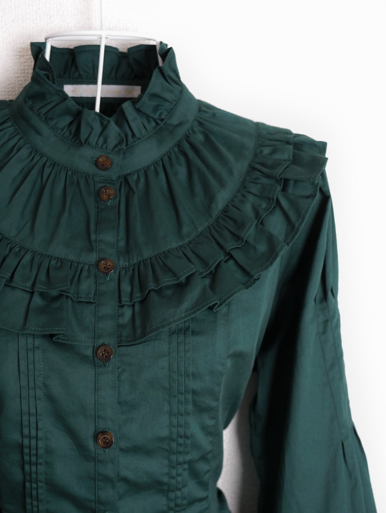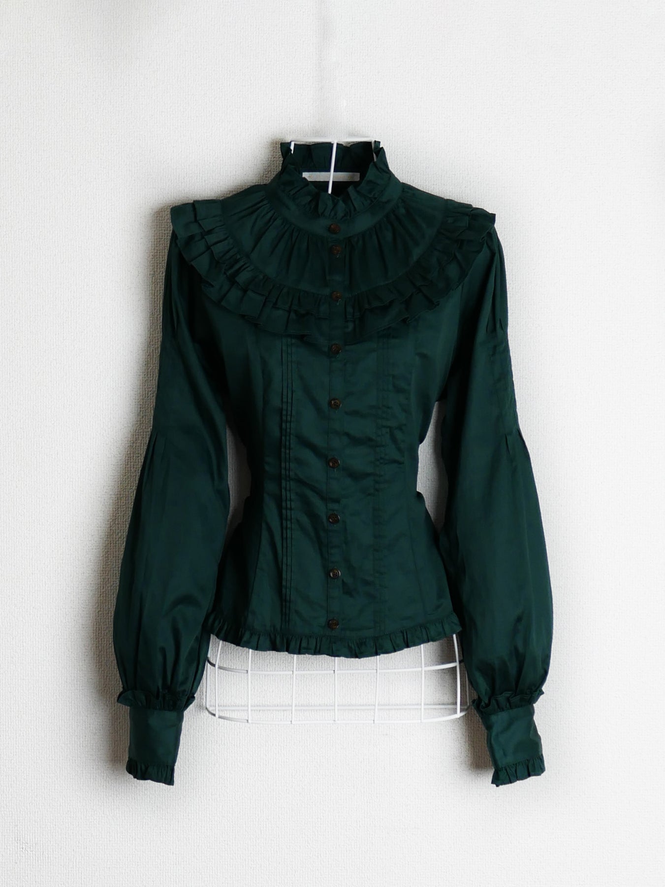 落ち着いたお色味で大人びた雰囲気ながら、胸元のギャザーやダブルヨークフリルがレディライクな印象のブラウス。