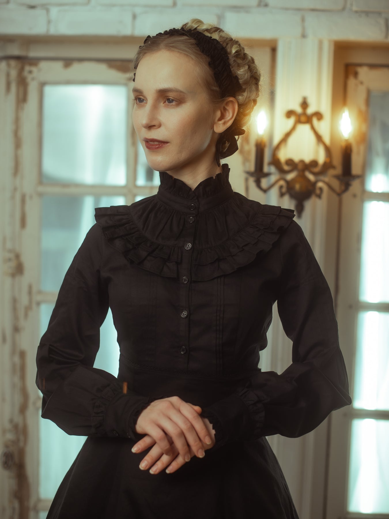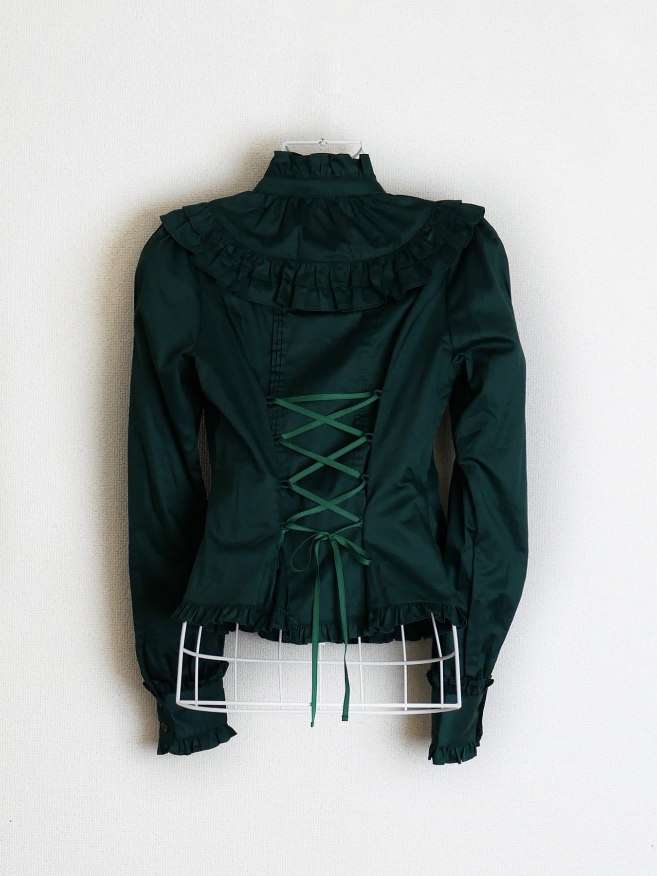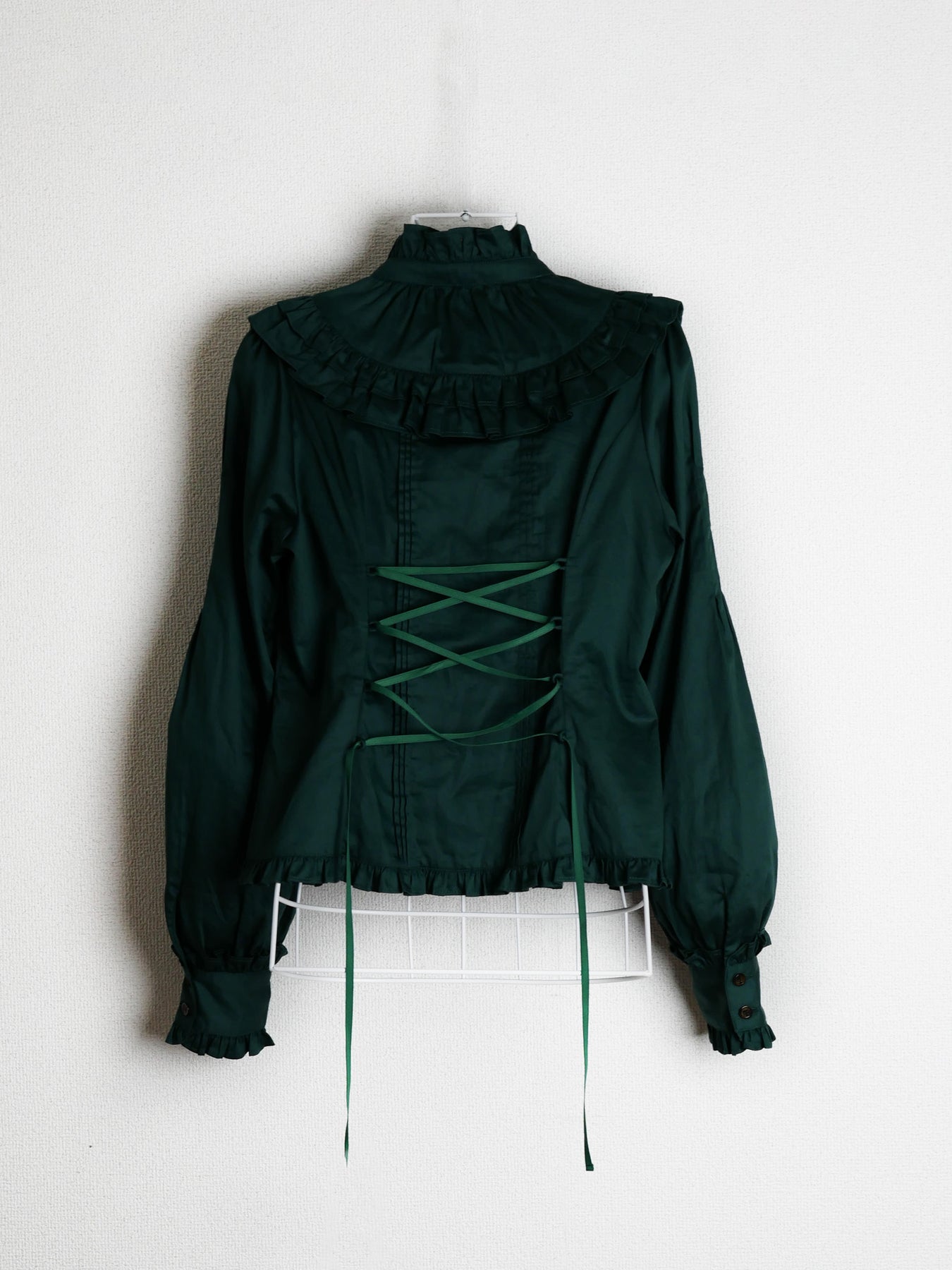 落ち着いたお色味で大人びた雰囲気ながら、胸元のギャザーやダブルヨークフリルがレディライクな印象のブラウス。