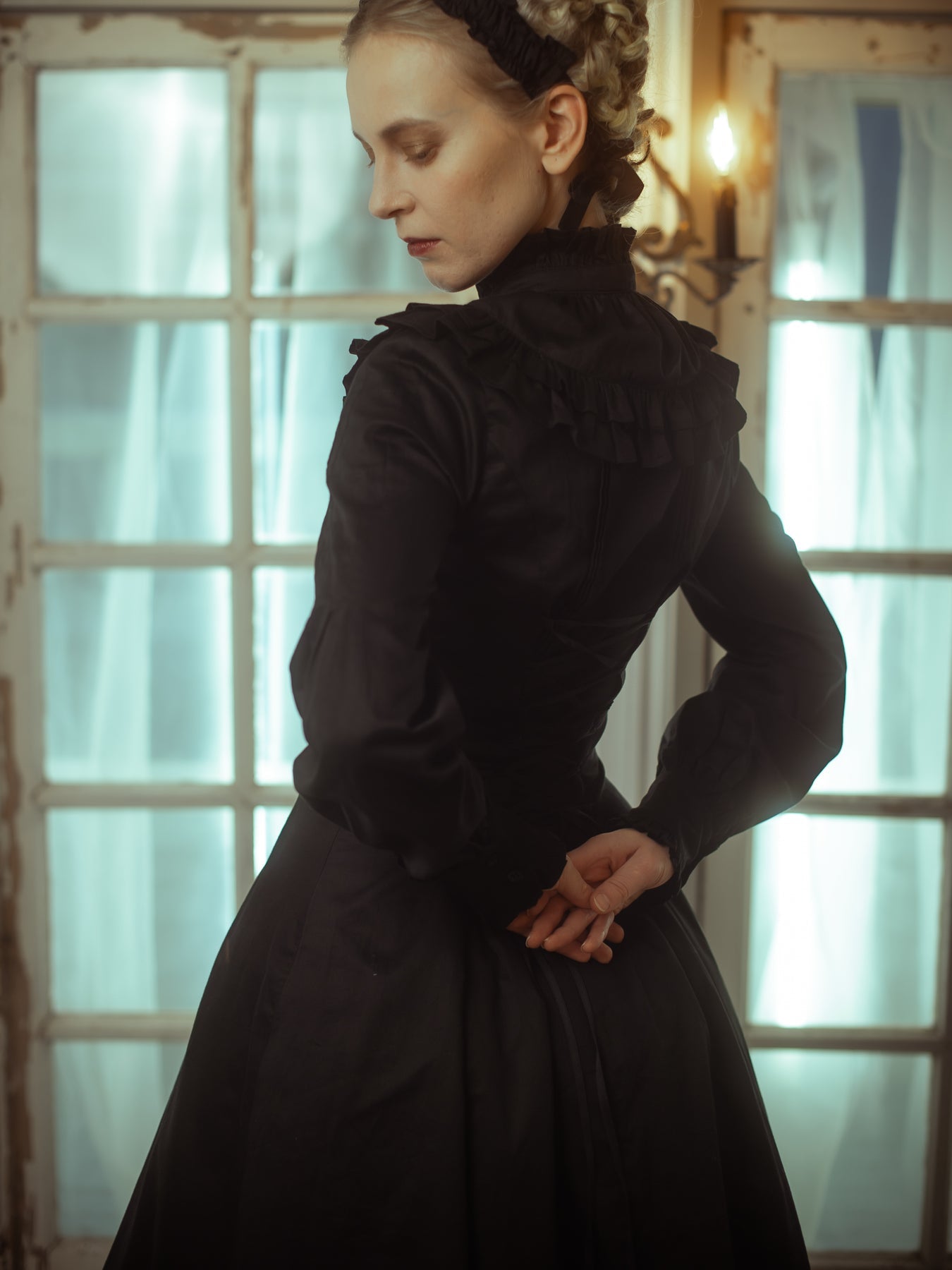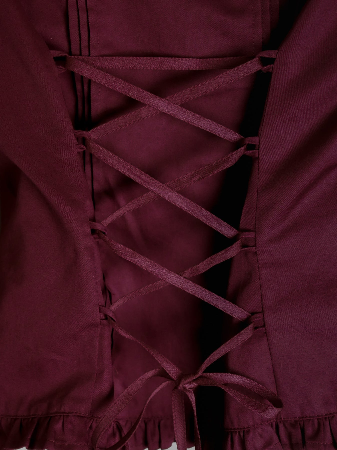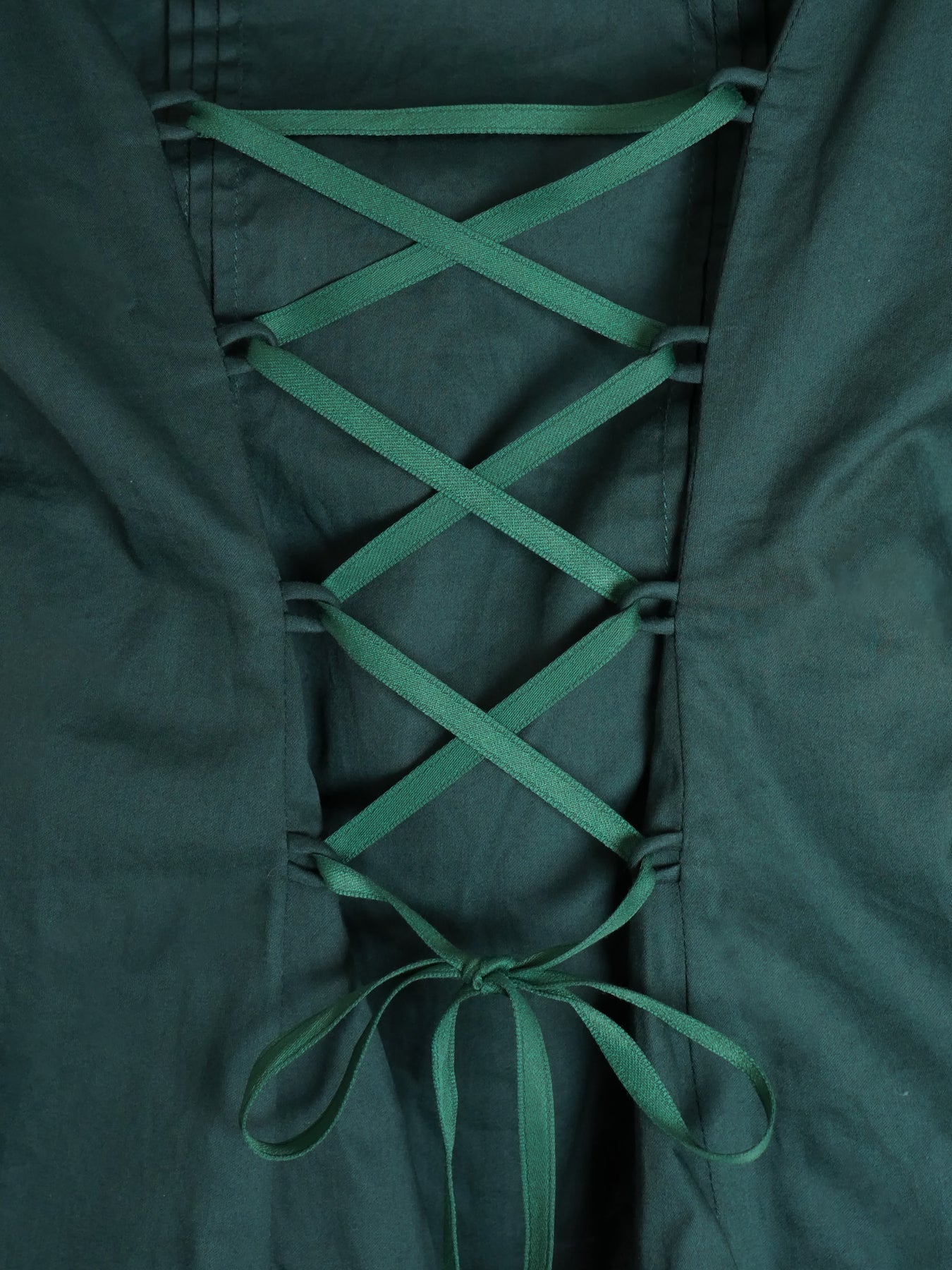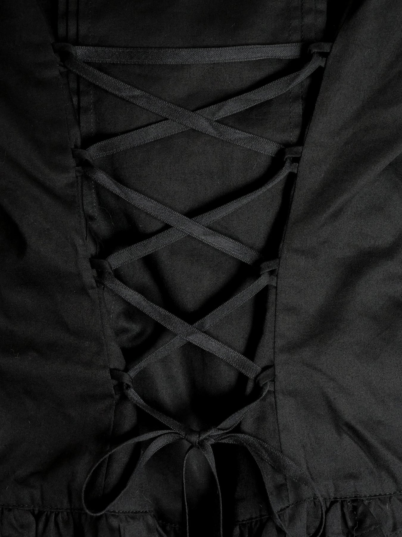 背面の編み上げは、美しいシルエットに仕上げるだけでなく、裾を出してお召しいただいた際の後ろ姿も優雅で魅力的に演出してくれます。