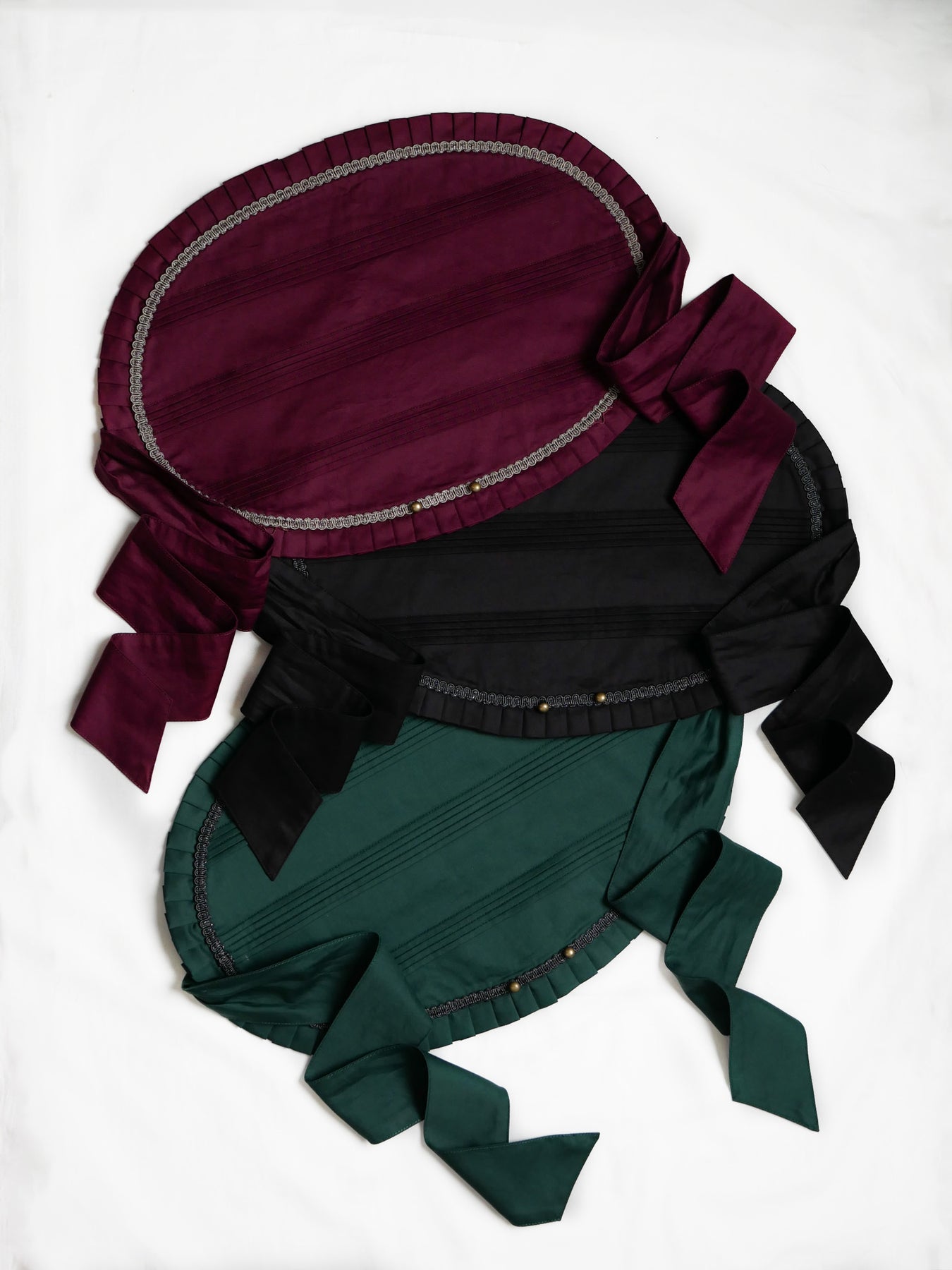 ループにボタンを通していただくとボンネットとして、ボタンを外して半分に畳んでいただくとお顔周りにフィットしたハーフボンネットとしてお召しいただけます。