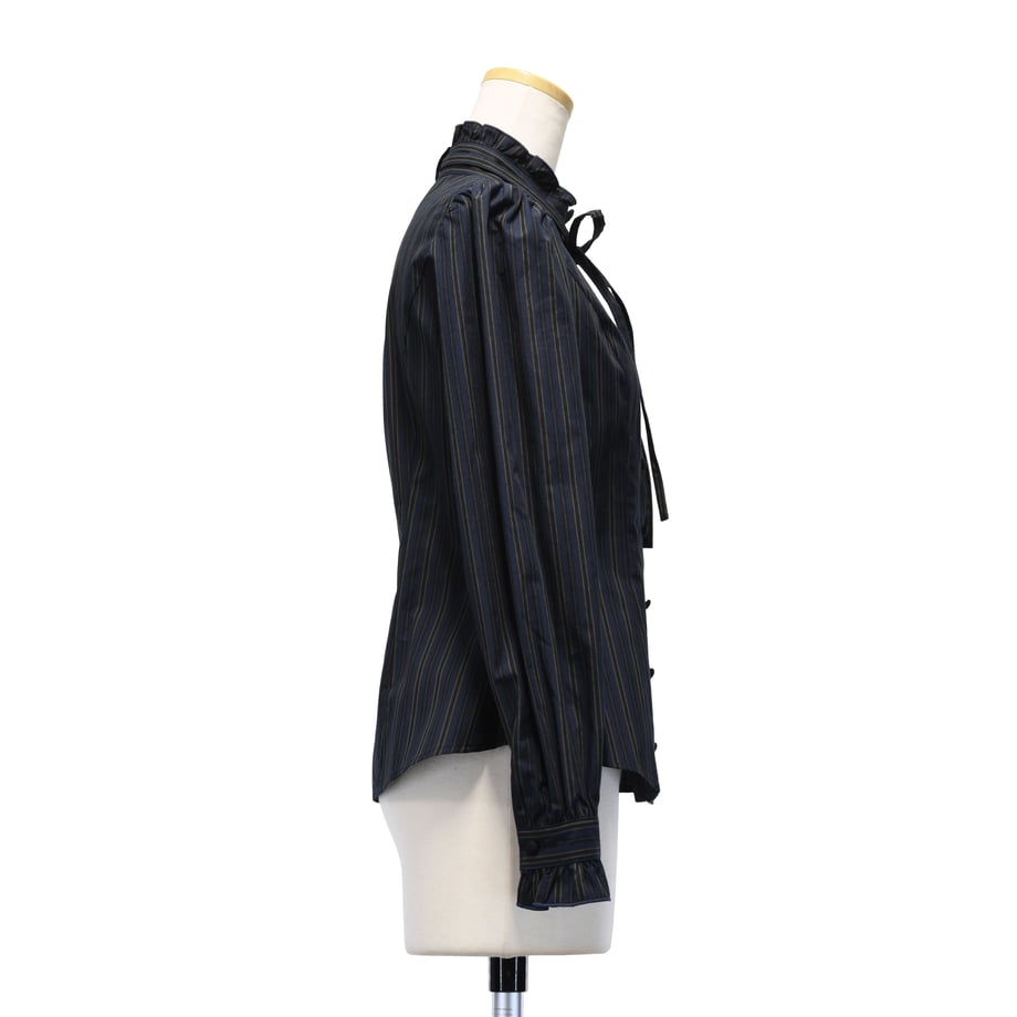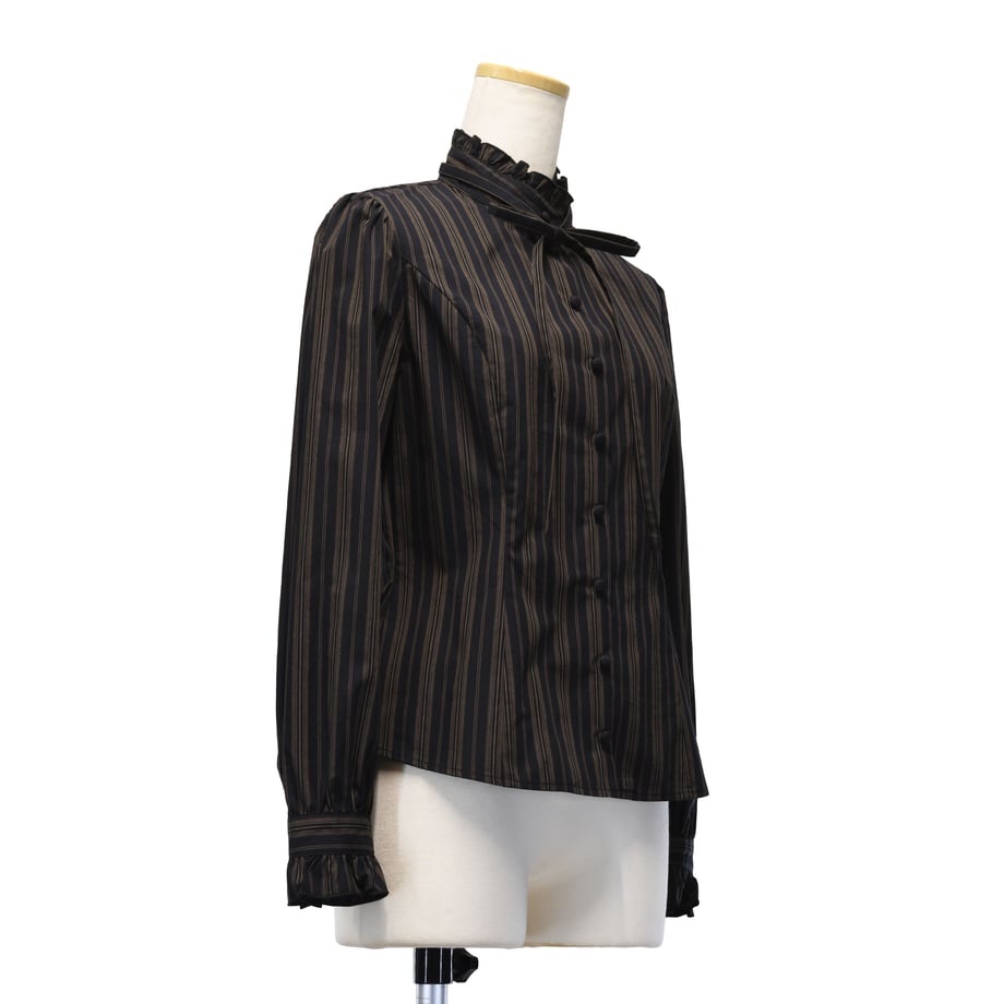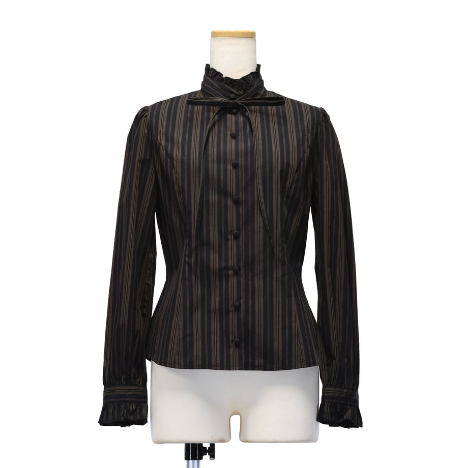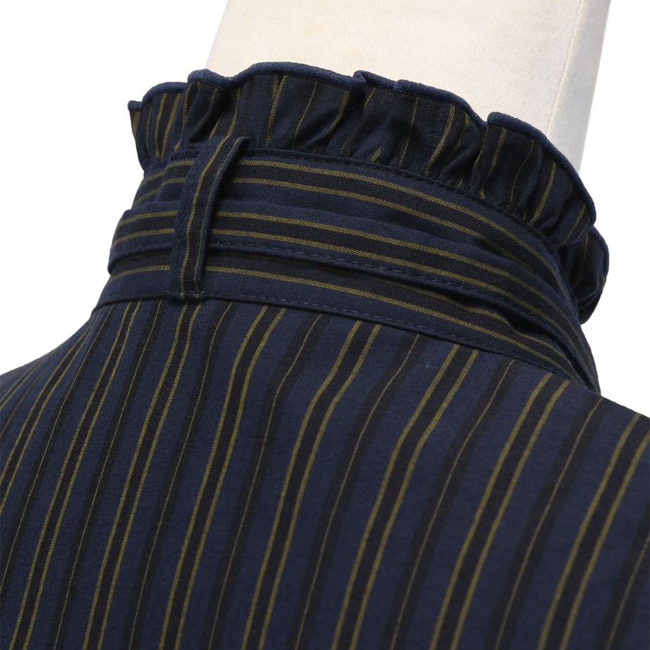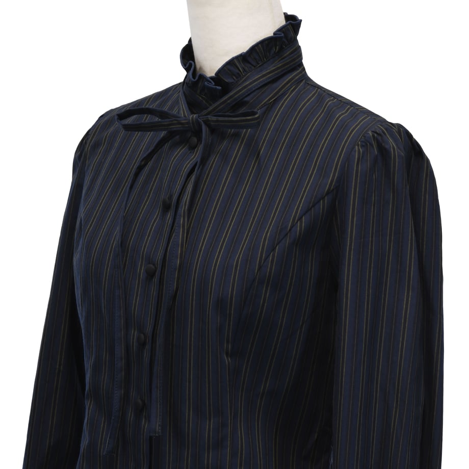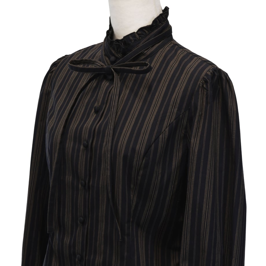 スタンドカラーに細身のリボンタイを添えた、クラシカルで知的な印象のストライプブラウス。華やかさを抑えた端正なデザインの中に、繊細なストライプが奥行きと表情を与えます。