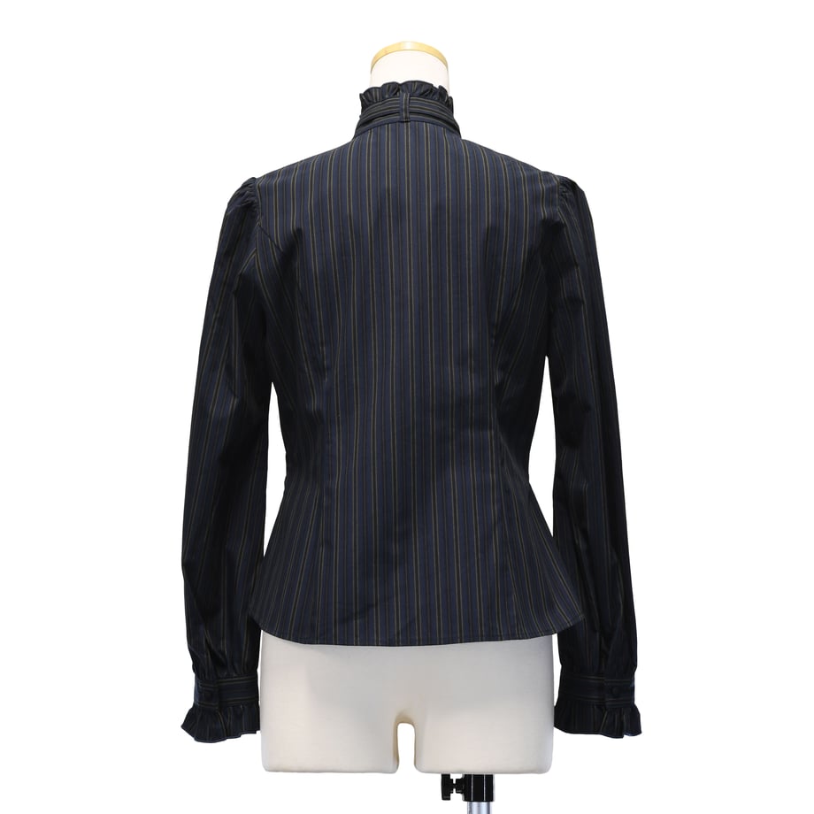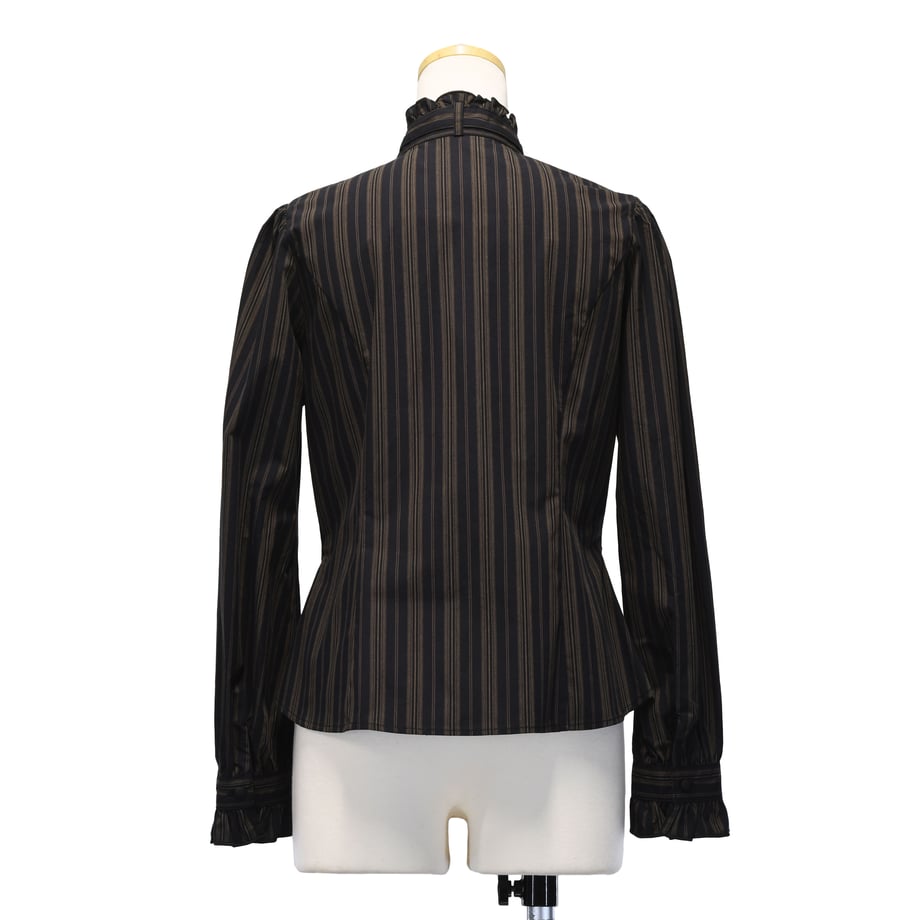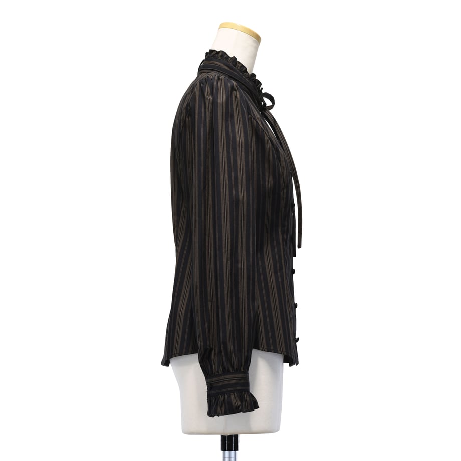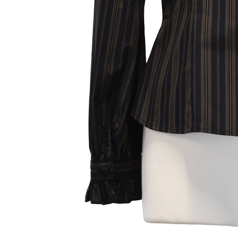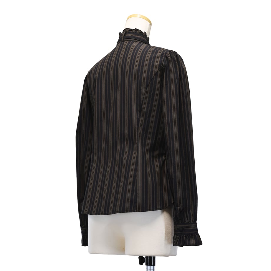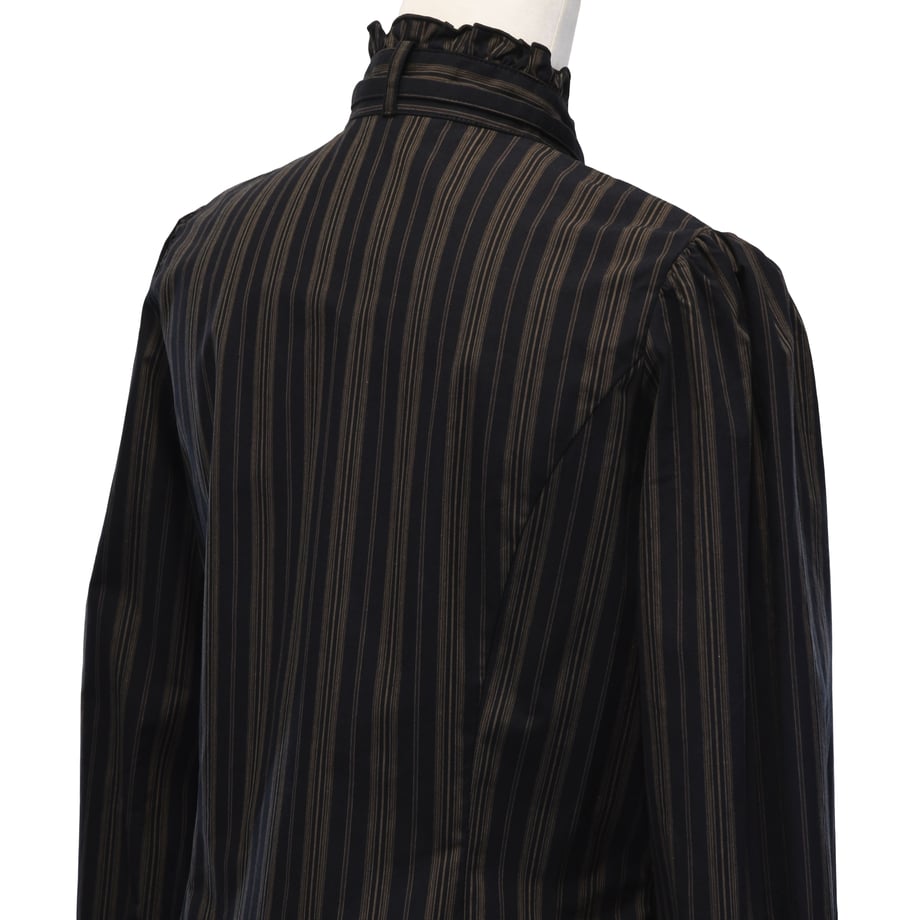 スタンドカラーに細身のリボンタイを添えた、クラシカルで知的な印象のストライプブラウス。華やかさを抑えた端正なデザインの中に、繊細なストライプが奥行きと表情を与えます。
