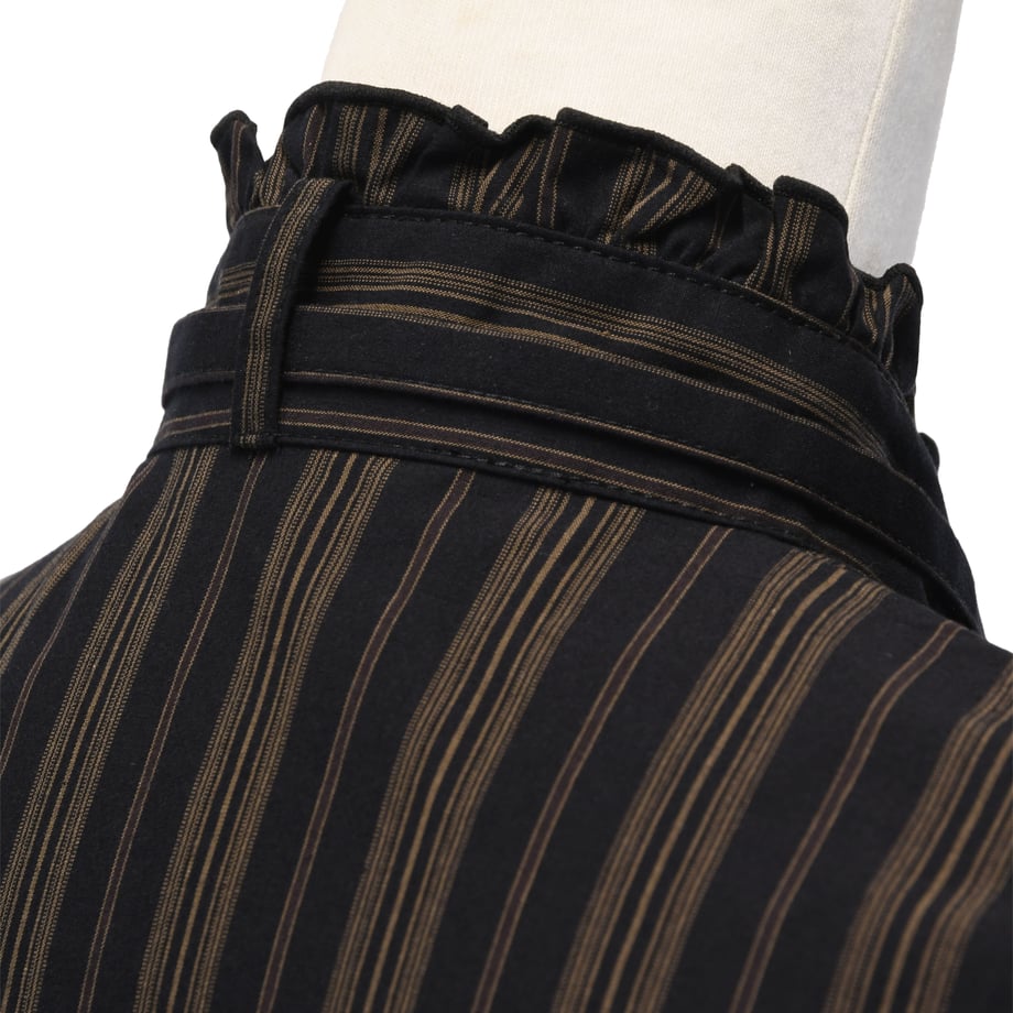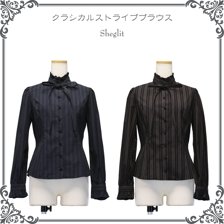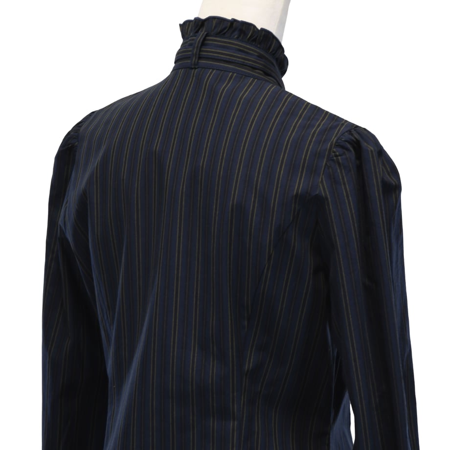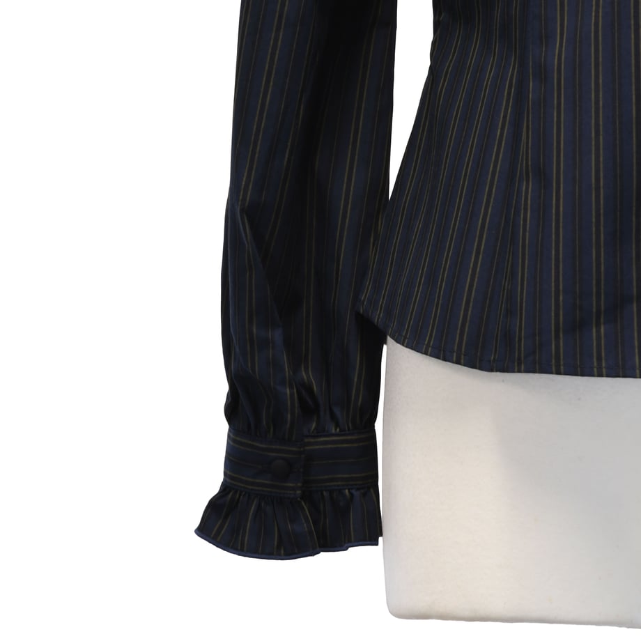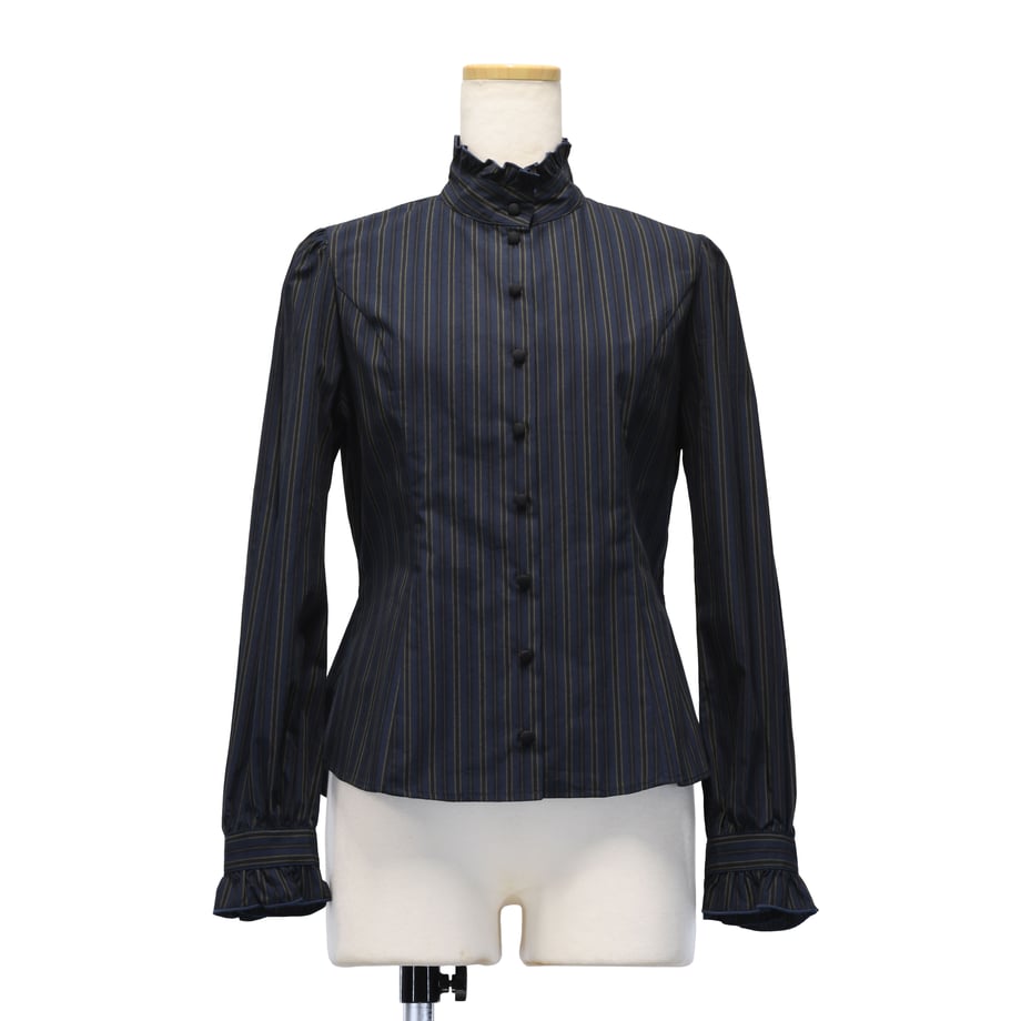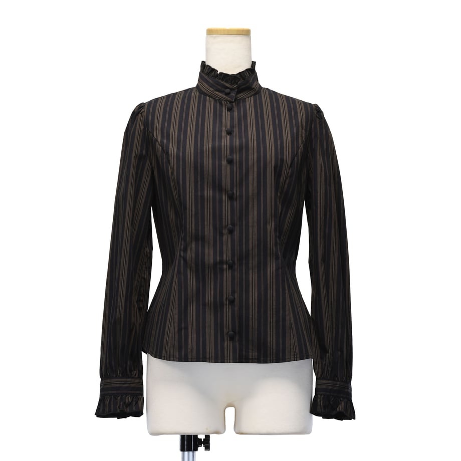 スタンドカラーに細身のリボンタイを添えた、クラシカルで知的な印象のストライプブラウス。華やかさを抑えた端正なデザインの中に、繊細なストライプが奥行きと表情を与えます。