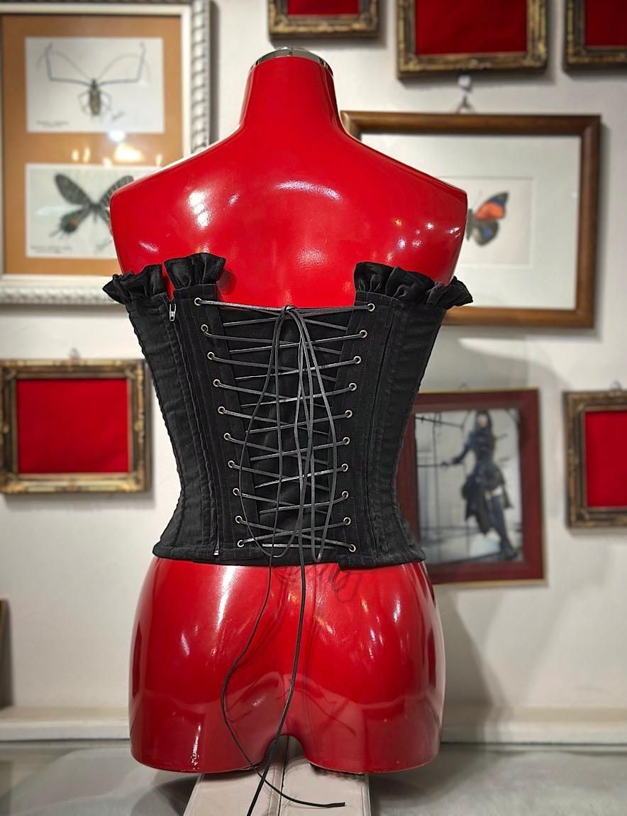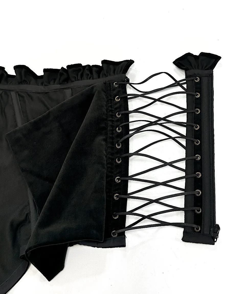 フロントの編み上げが縦ラインを強調し、胸元のフリルがデコルテを華やかにしてくれます