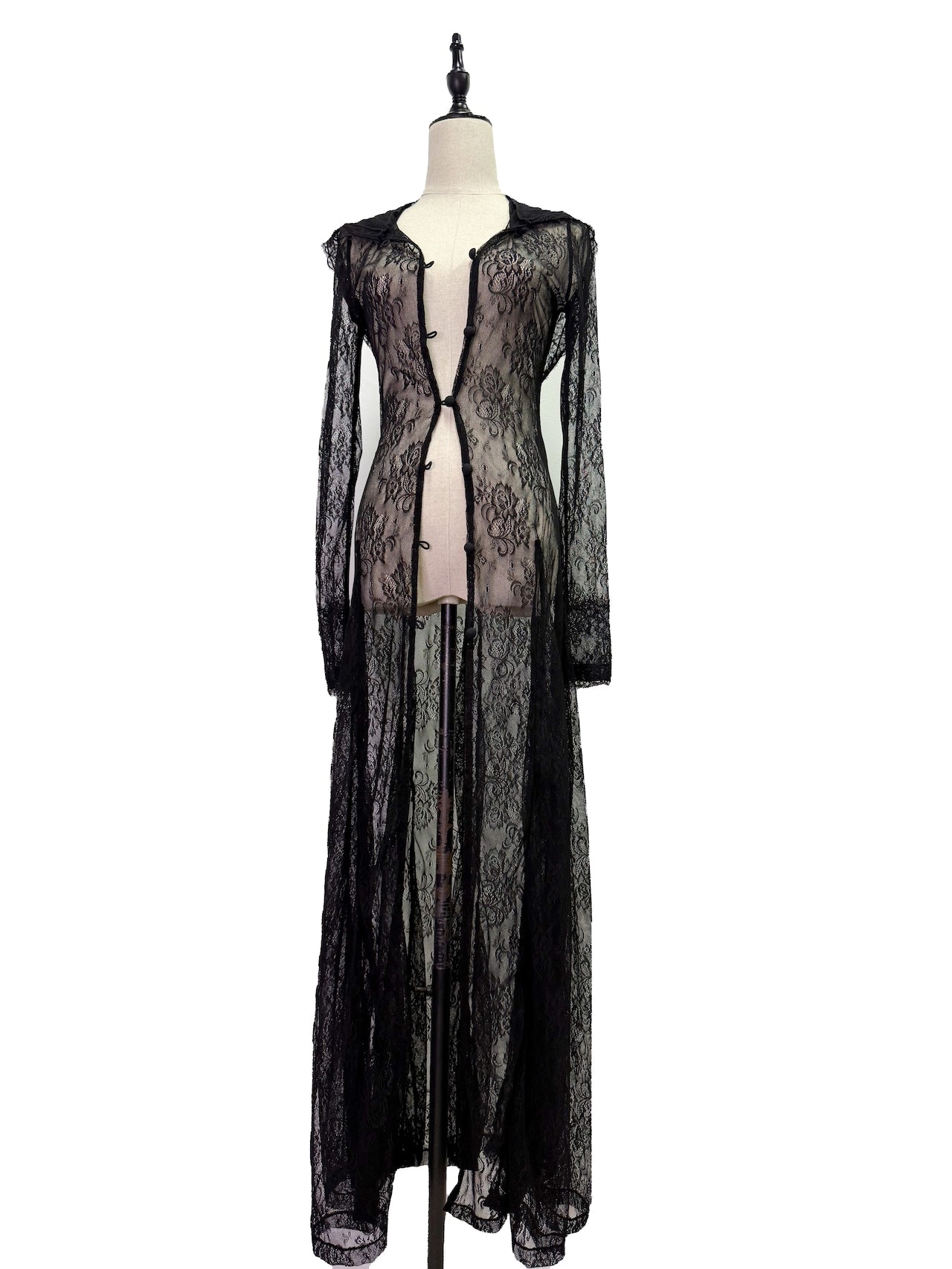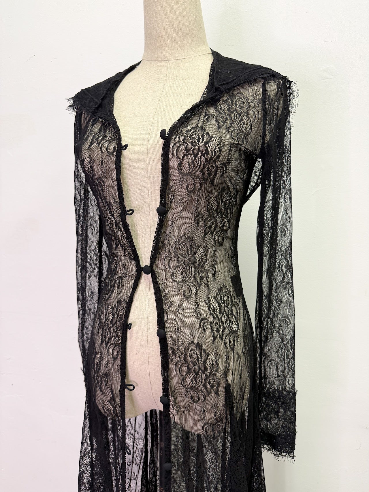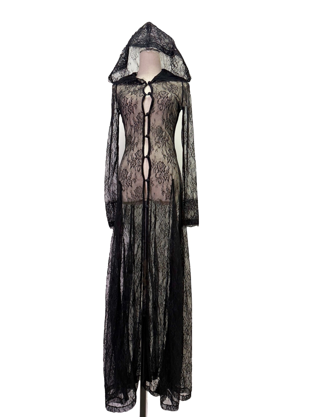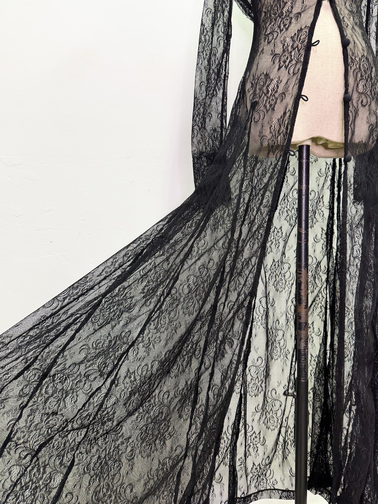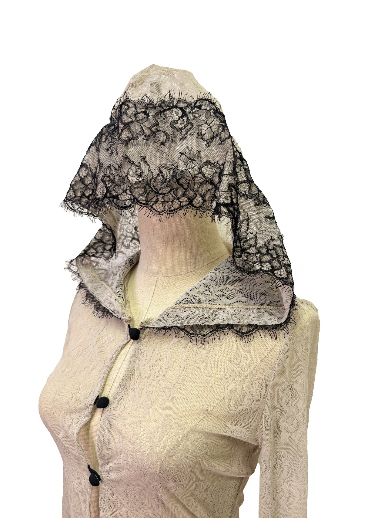 深めのフードはストレッチレースの上に縁にかかるようリバーレースが重ねられている贅沢仕様です。
