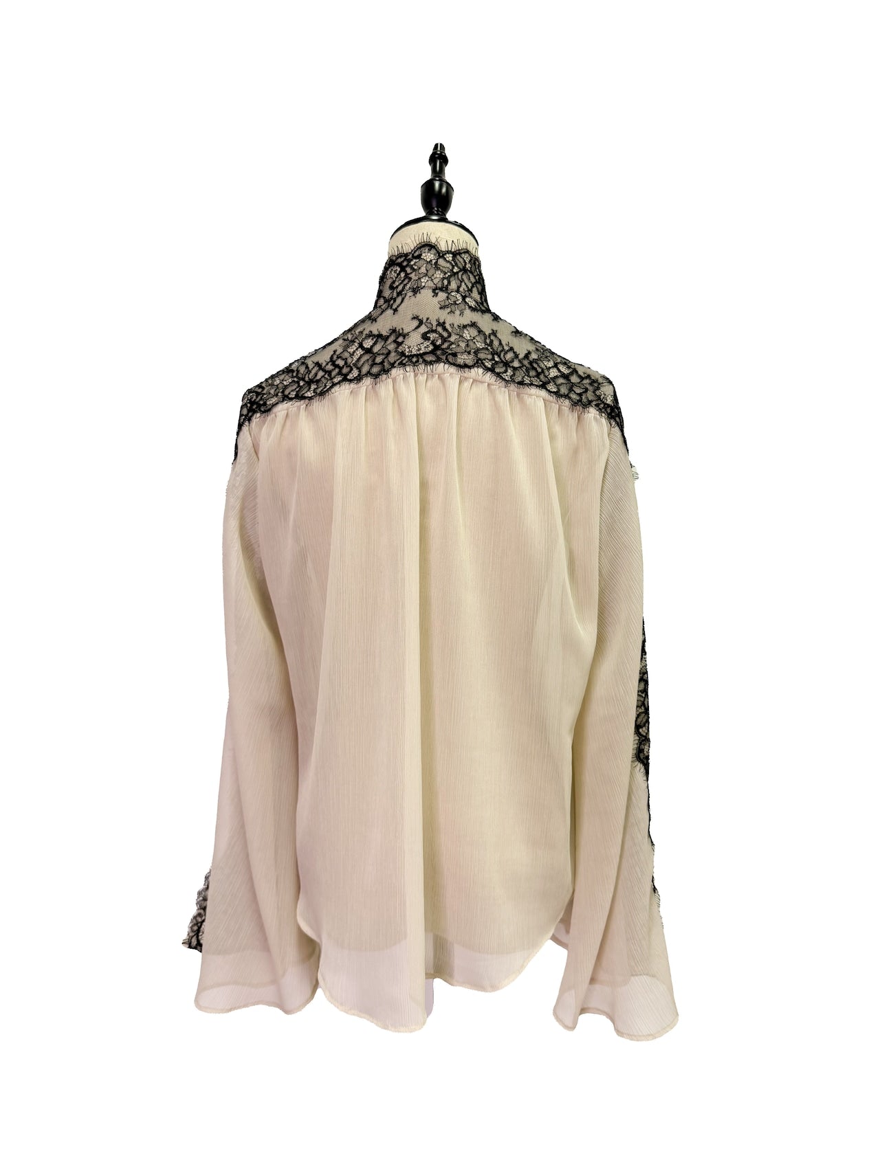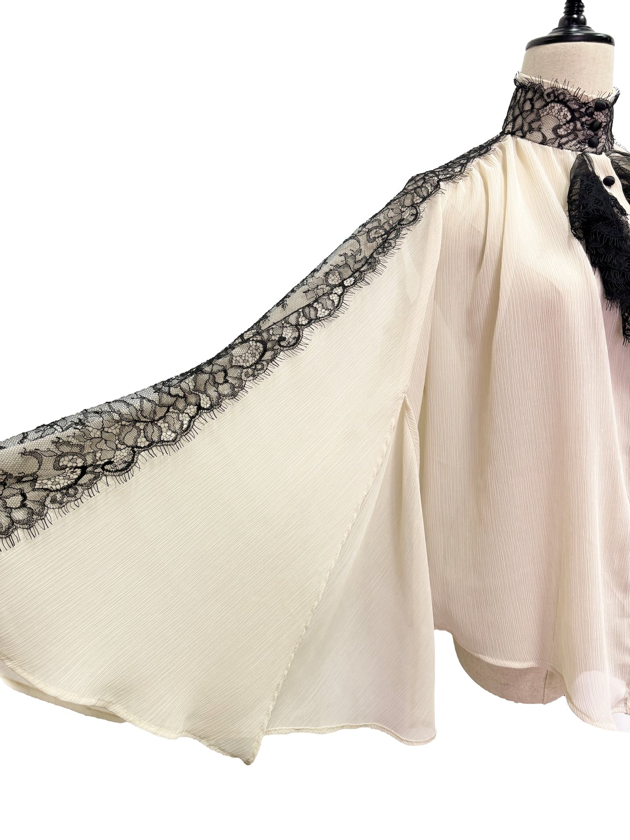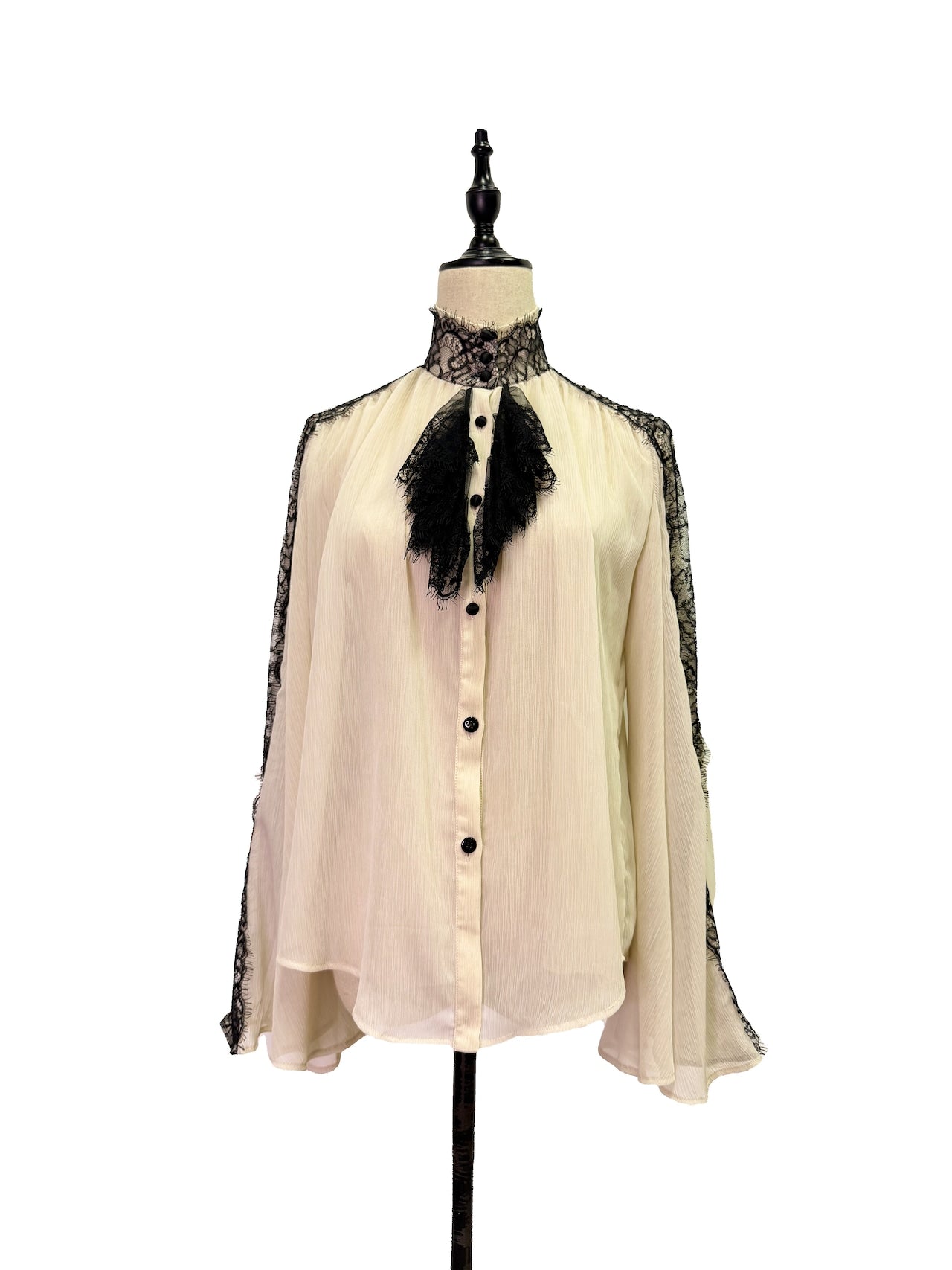繊細なリバーレースを贅沢に襟、肩、袖、胸元に使用したブラウス。