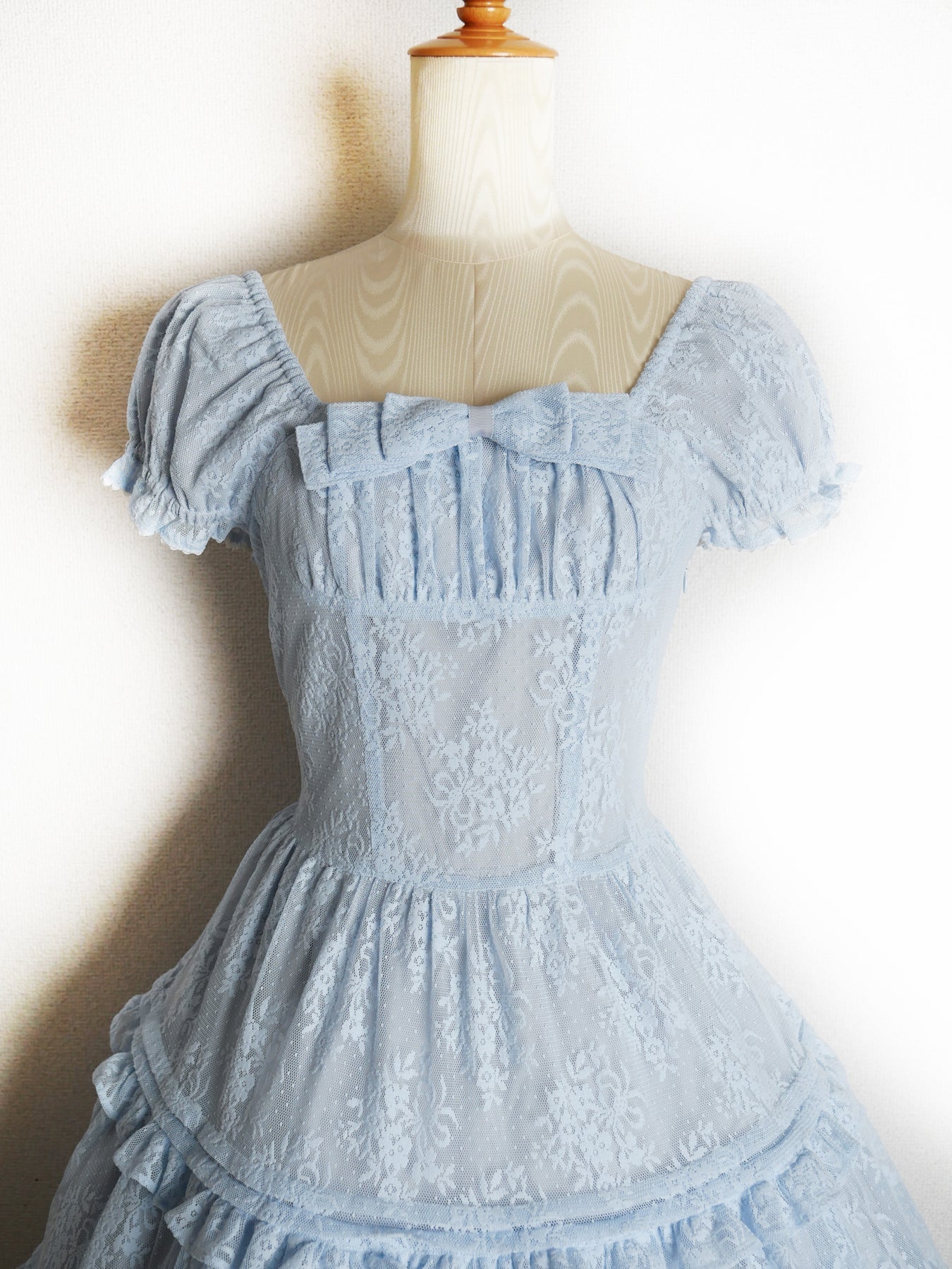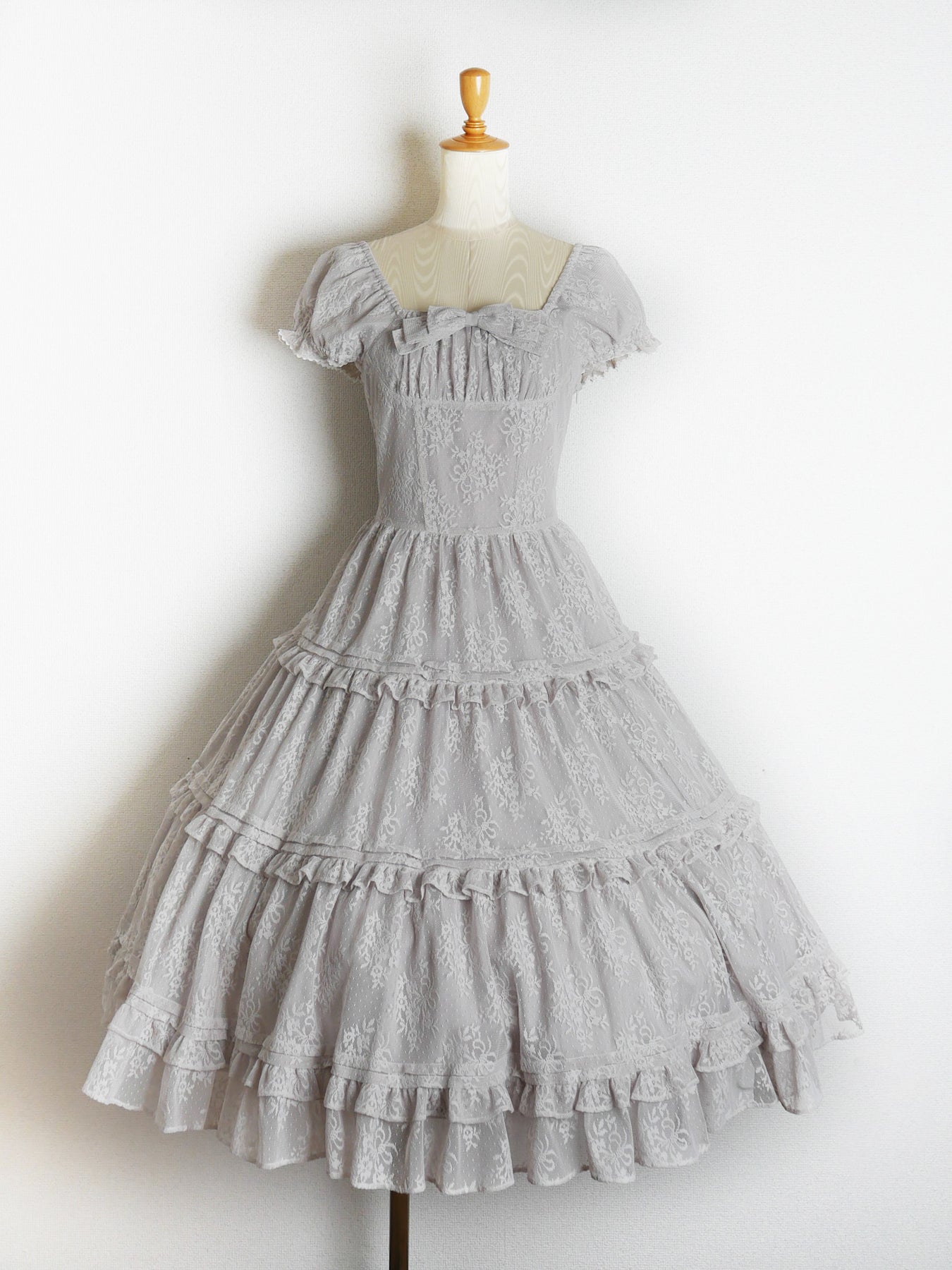 ドットチュールをベースに繊細な花束モチーフが美しい可愛らしい印象のレースを使用した上品でアンティーク感のあるドレスです。