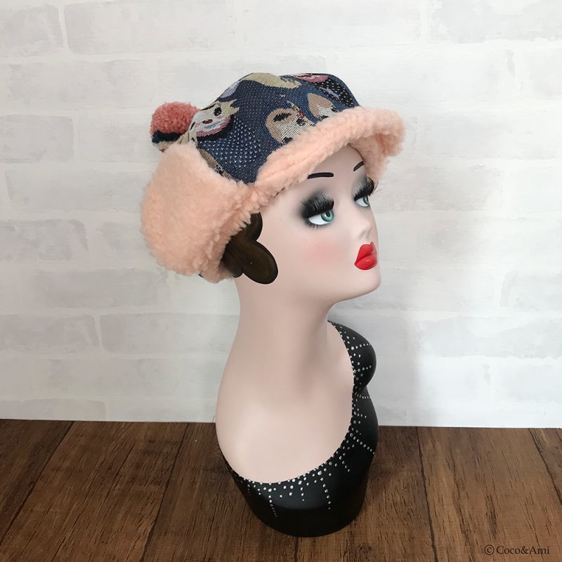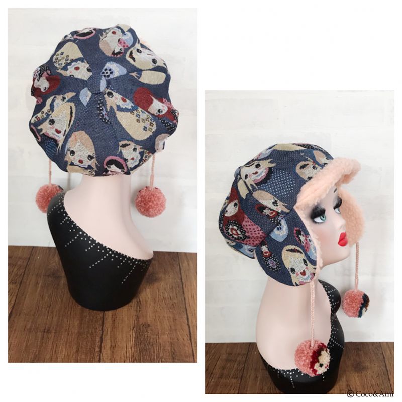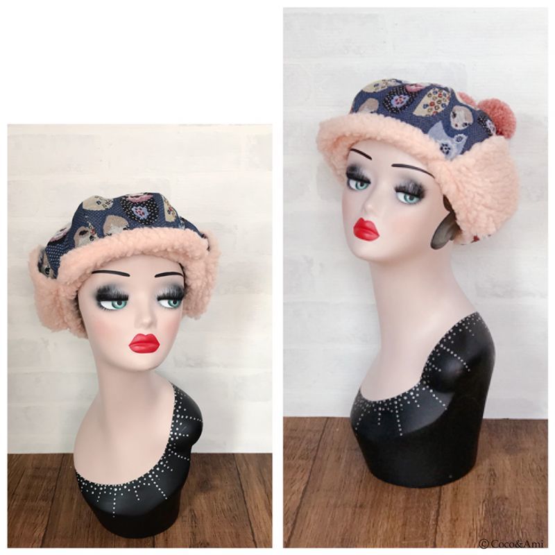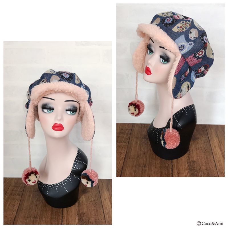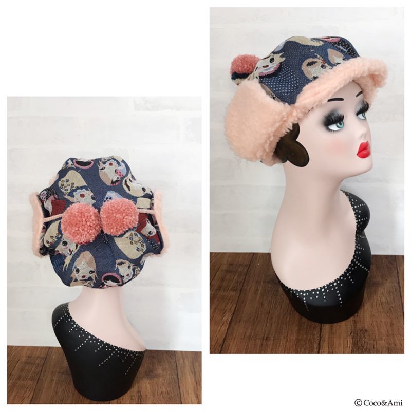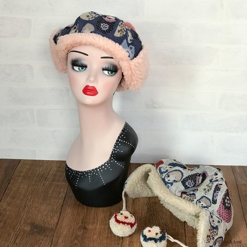 タイトなデザインの多い耳あて帽を、当店では小顔効果も兼ねふっくらかわいいパターンで作りました。