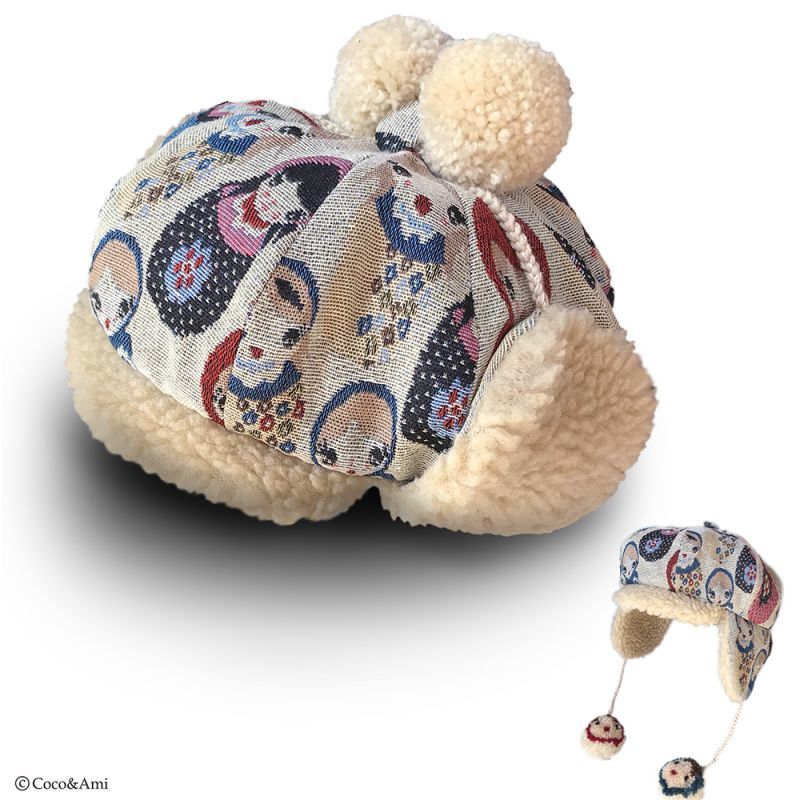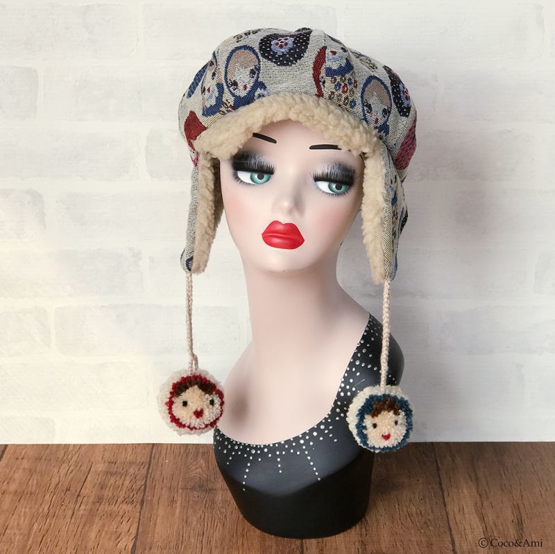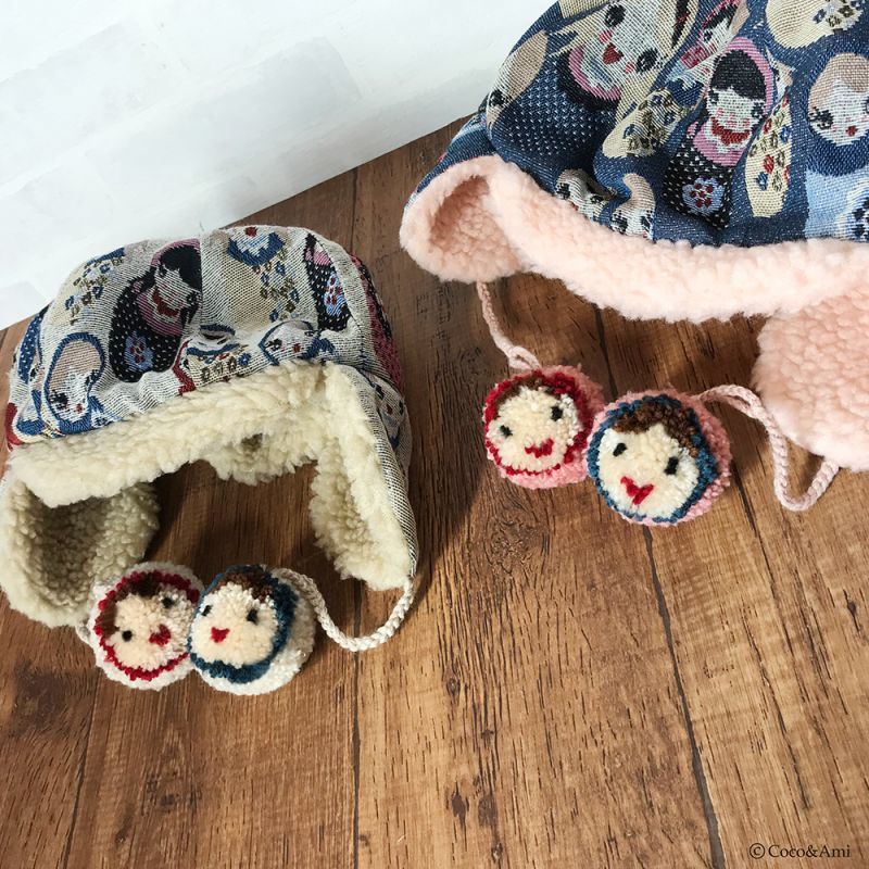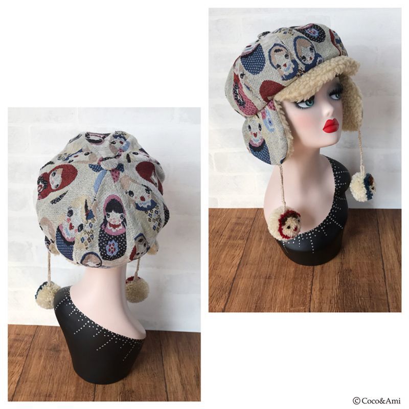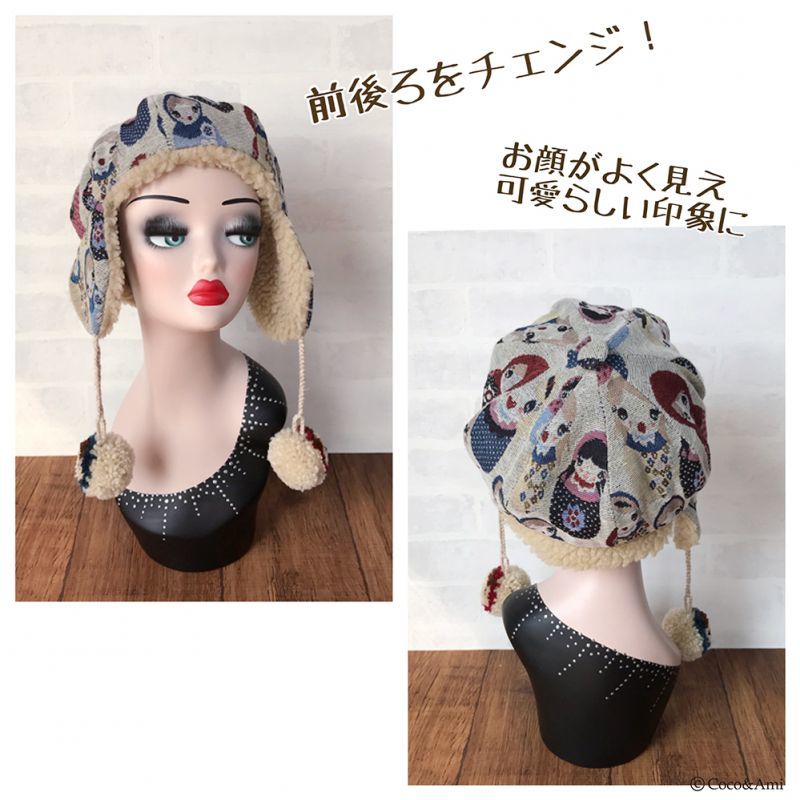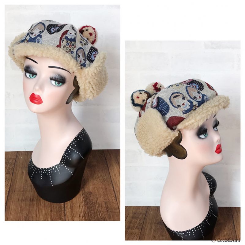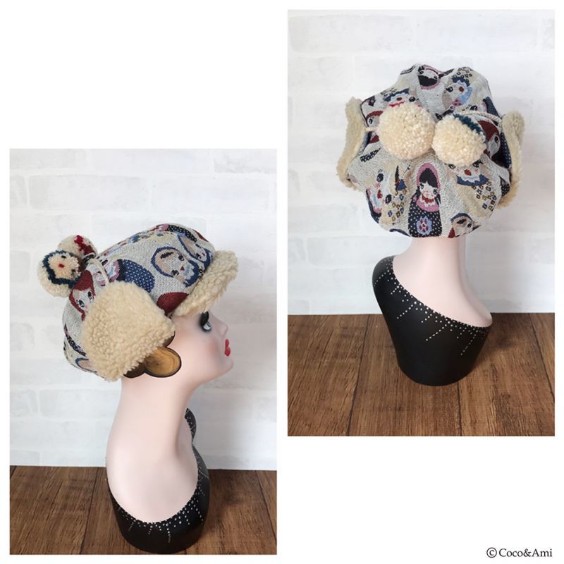 タイトなデザインの多い耳あて帽を、当店では小顔効果も兼ねふっくらかわいいパターンで作りました。