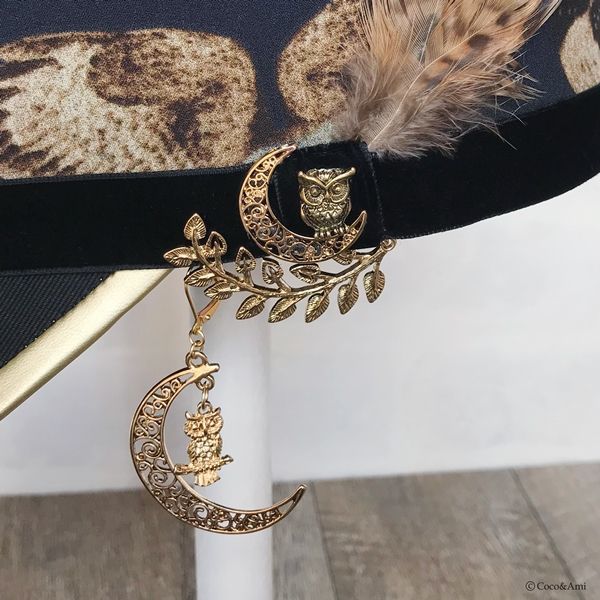サイドにぶらさがるお月様にもフクロウがゆらゆら。取り外してピアスとしてもご利用いただけます。