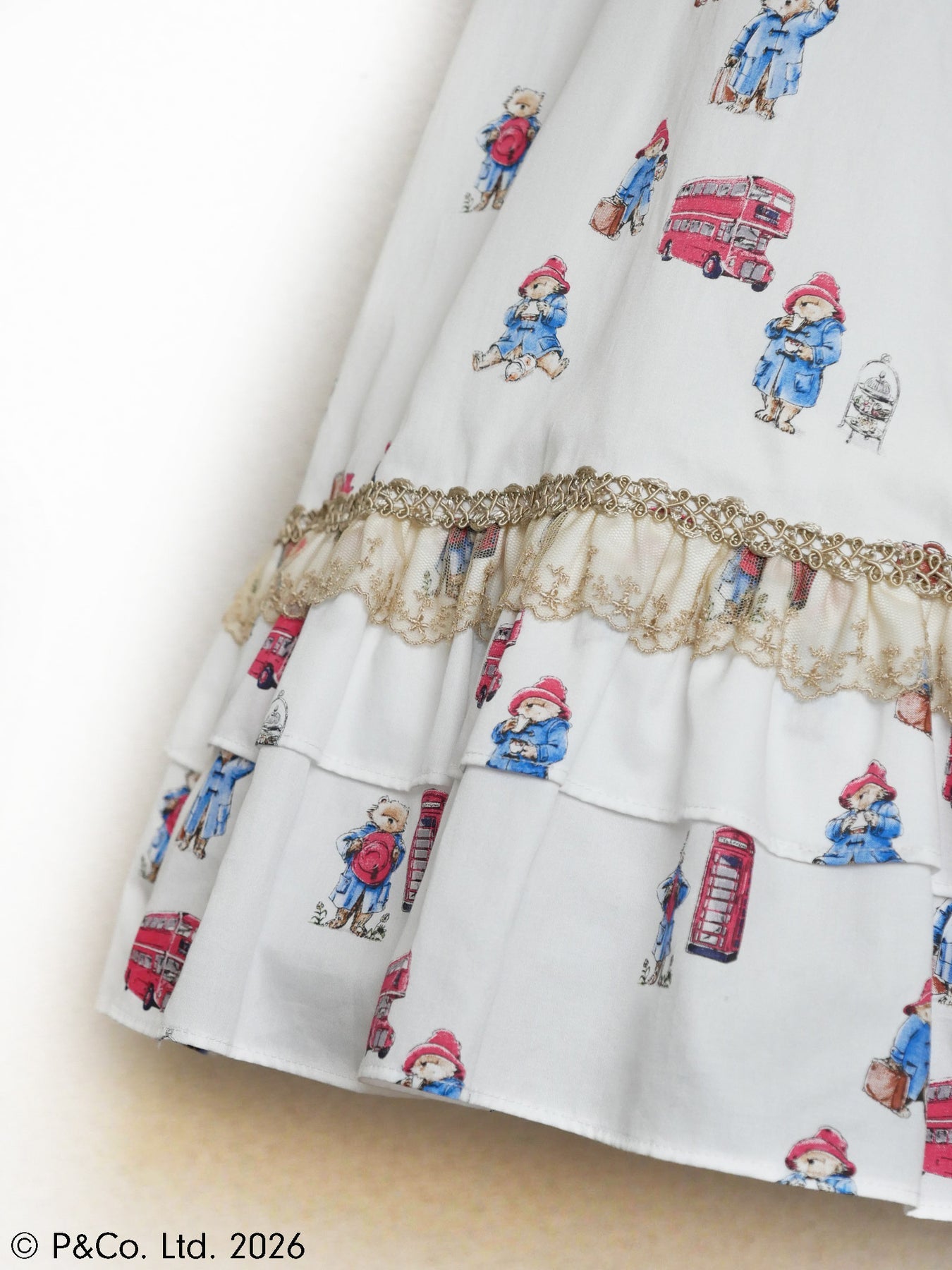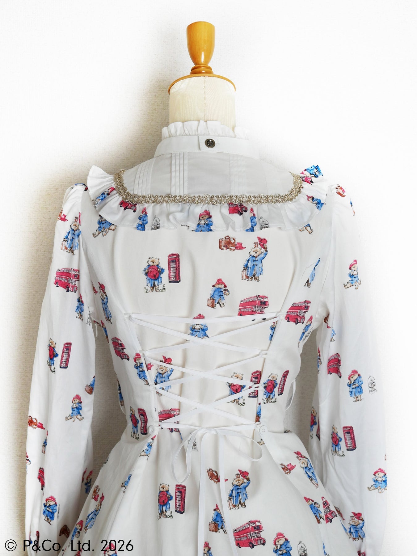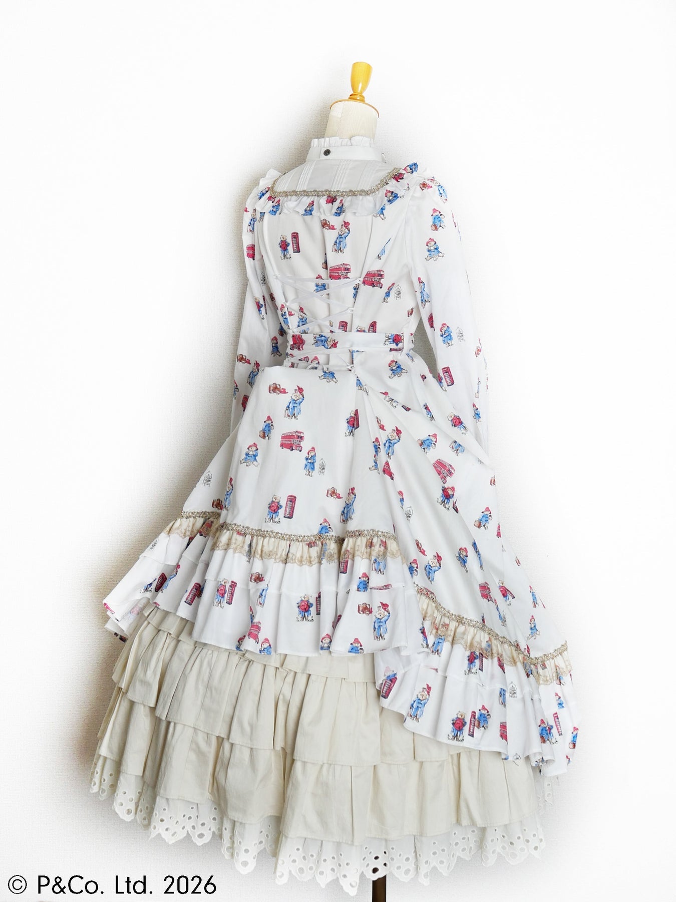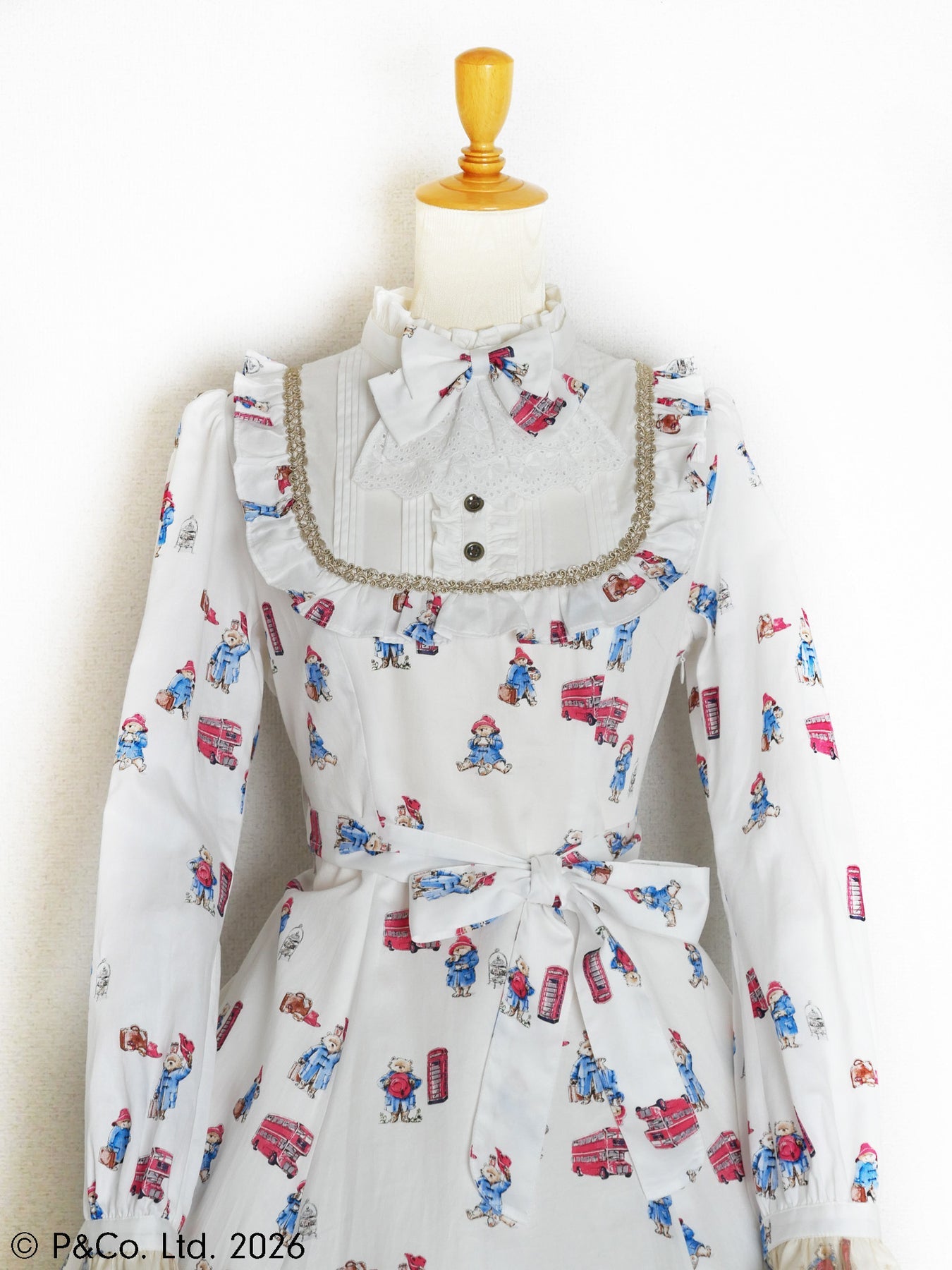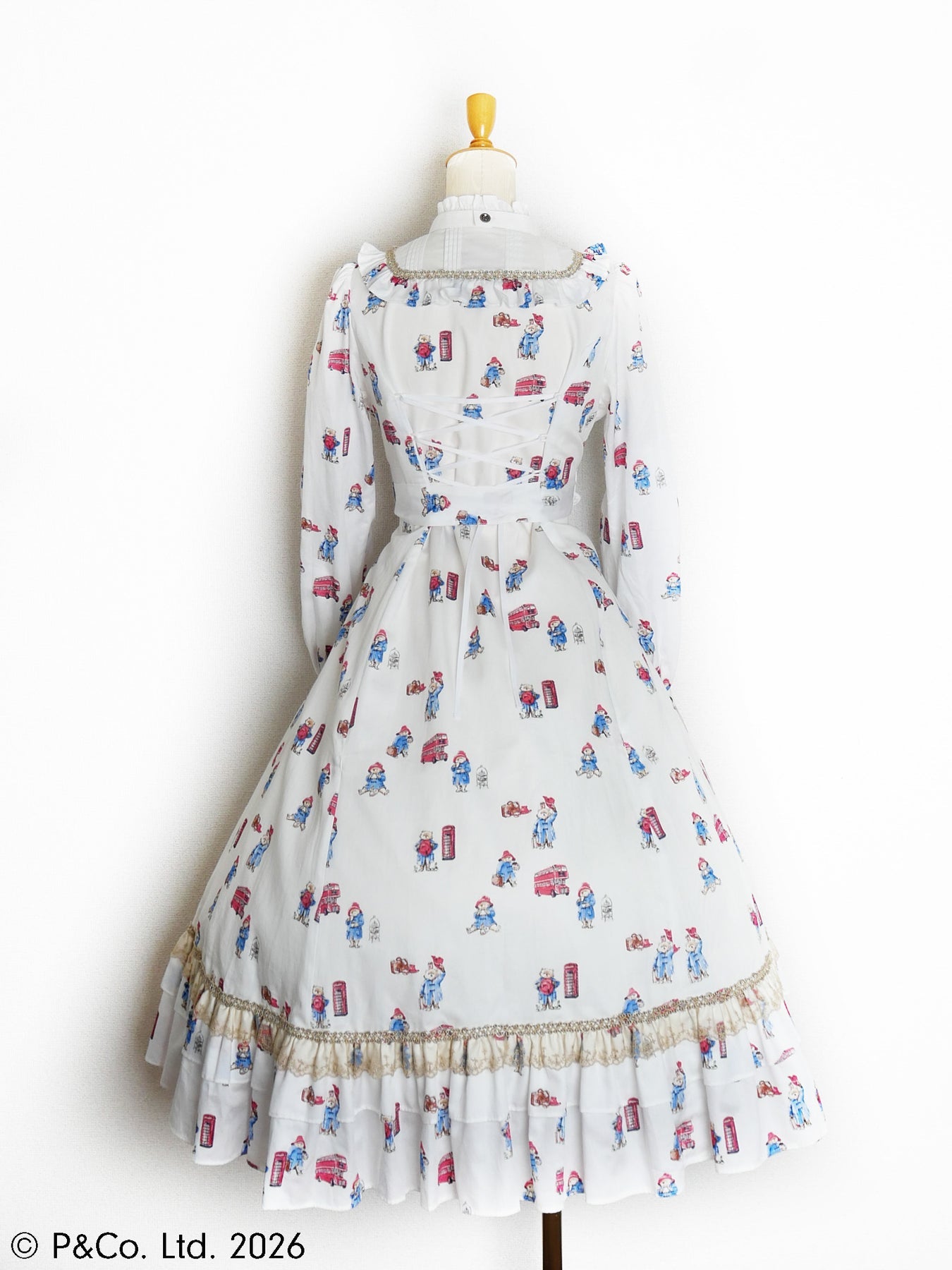 沢山のポーズのパディントンとロンドンモチーフがちりばめられたオリジナルテキスタイルを使用しお仕立てした、英国の物語とVictorian maidenが誇る伝統が重なり合うクラシカルドールドレスです。