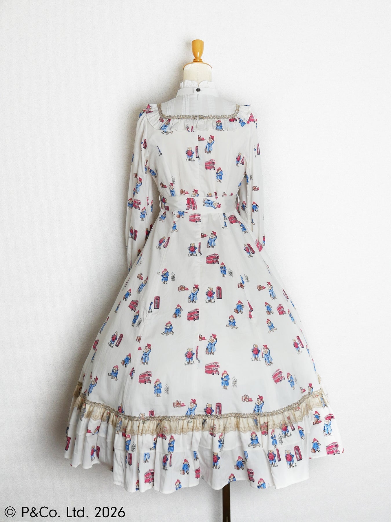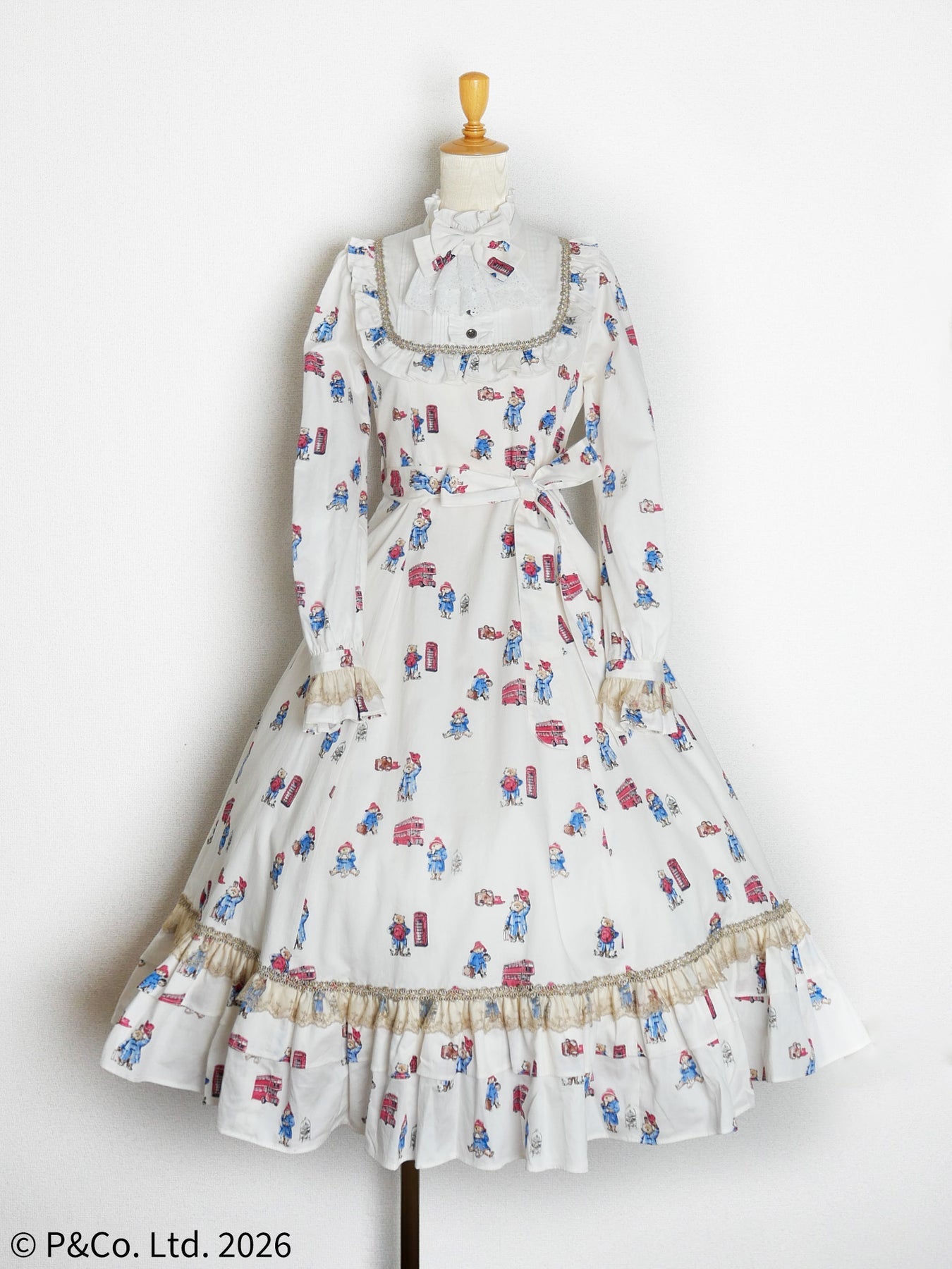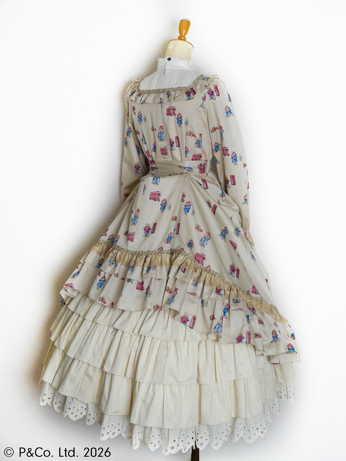 沢山のポーズのパディントンとロンドンモチーフがちりばめられたオリジナルテキスタイルを使用しお仕立てした、英国の物語とVictorian maidenが誇る伝統が重なり合うクラシカルドールドレスです。